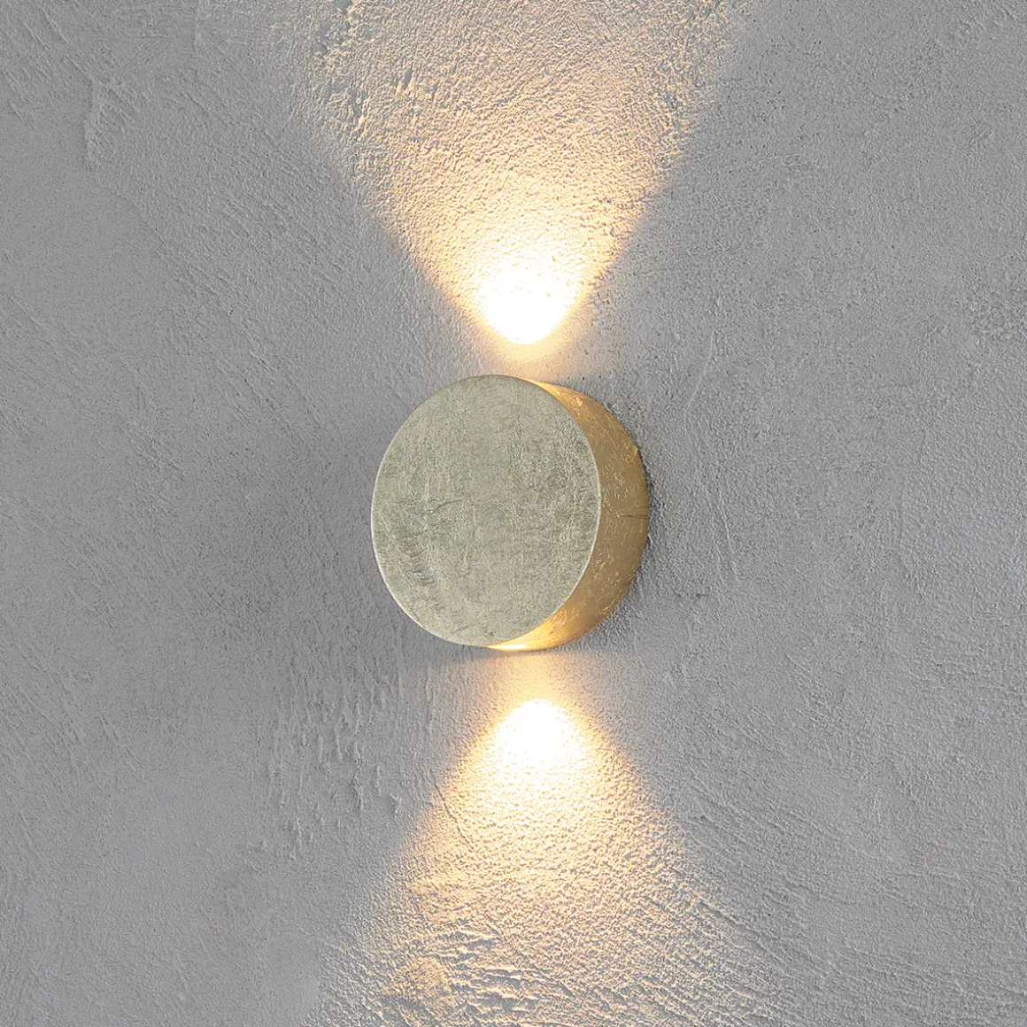 Das Design der Wandlampe ist schlicht und modern. Der Fokus liegt auf der reizvollen doppelten Lichtausstrahlung, die durch die energieeffizienten LEDs erzeugt wird und Wandflächen gekonnt akzentuiert. Die edle Blattgoldauflage unterstreicht die elegante, stilvolle Ästhetik.