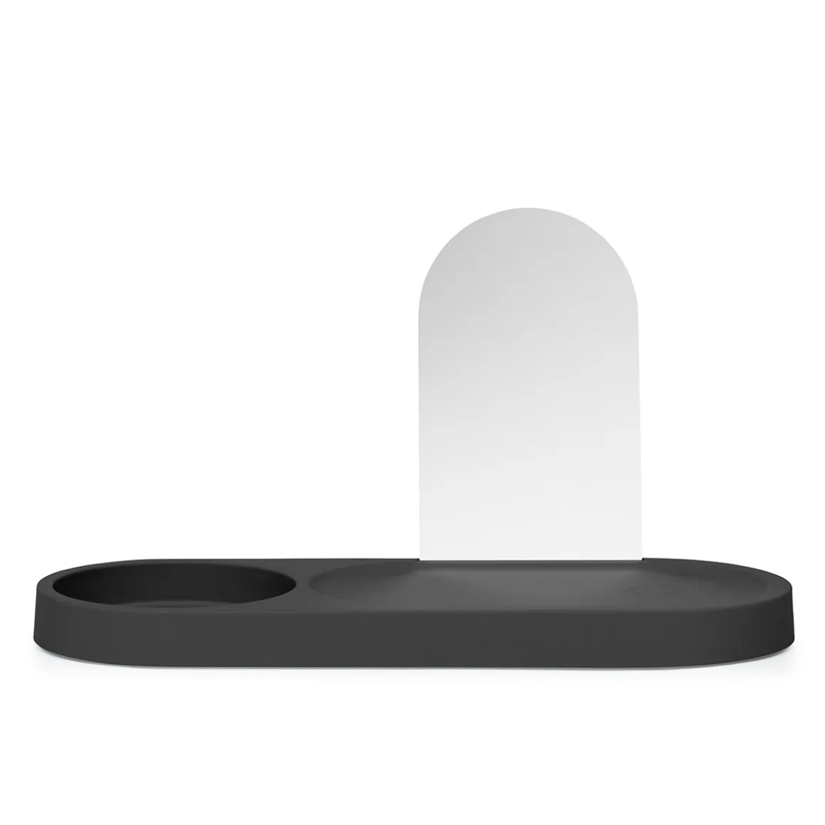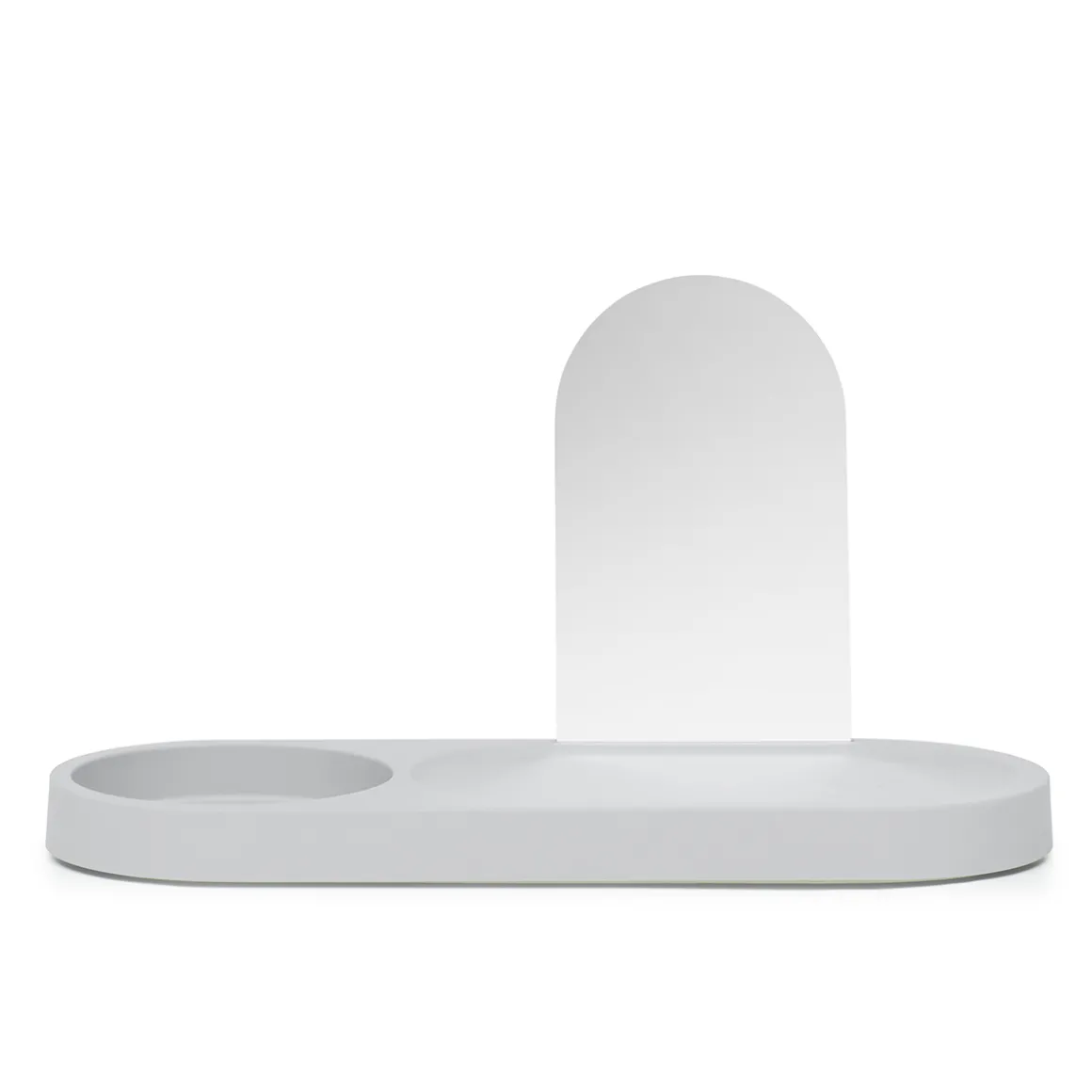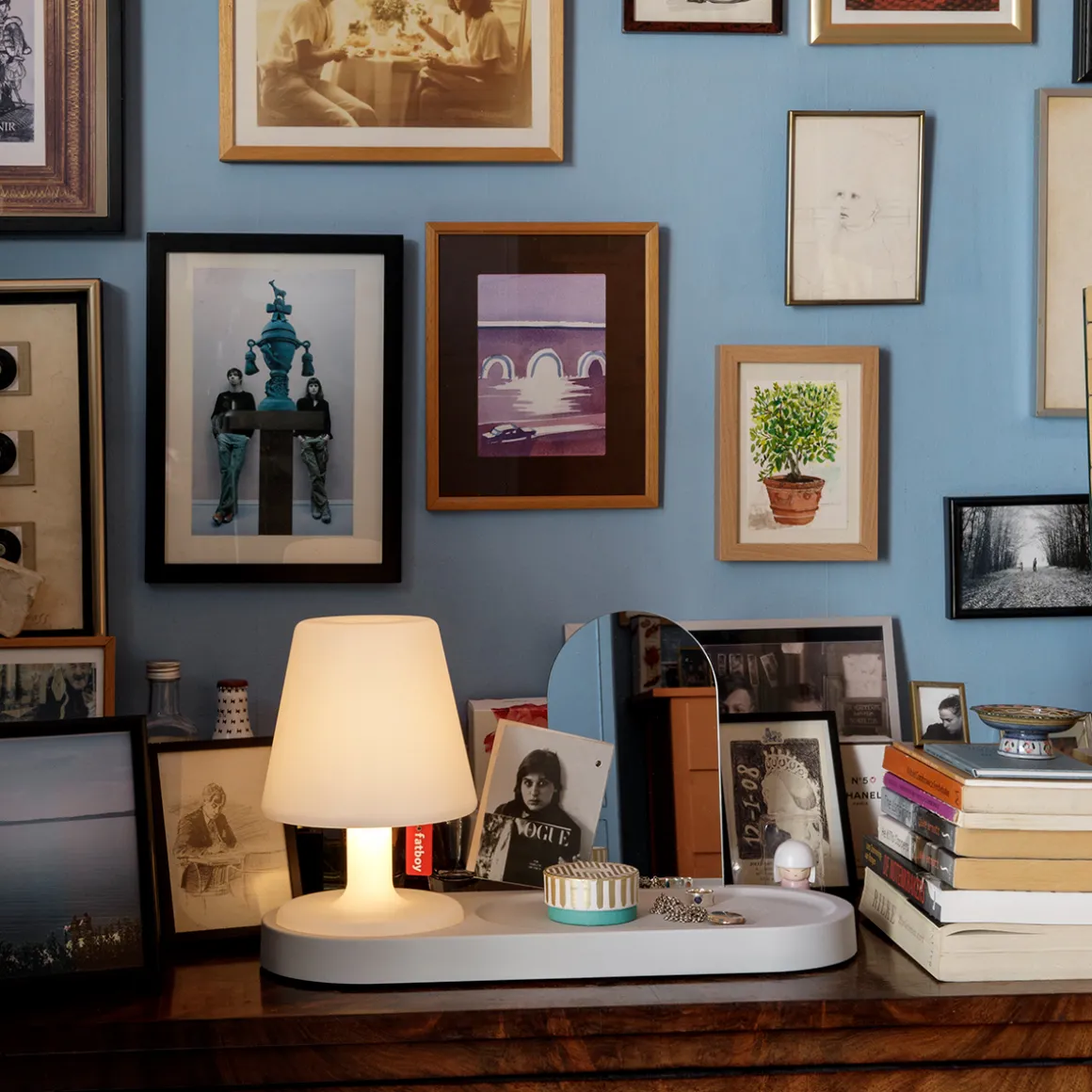 Durch ein schmales verstecktes Loch in der Mitte des Sockels kann das Ladekabel für die Akkulampe hindurchgeführt werden. Dies macht es möglich, die selbst dann aufzuladen, wenn sie in der Homebase steht. Der Spiegel der Residence ist herausnehmbar. In den Spalt, in den er eingefügt wird, kann auch eine Postkarte oder ein Lieblingsfoto gesetzt werden.