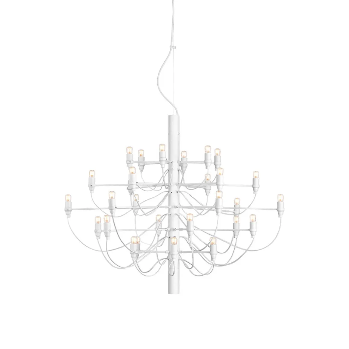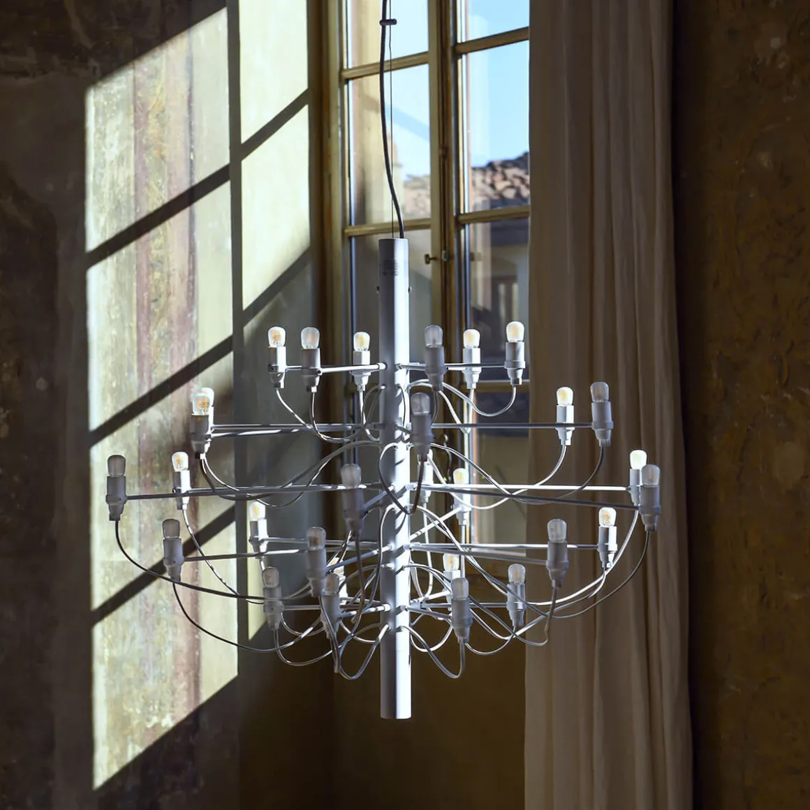 Das Modell 2097/30, 1958 von dem Designer Gino Sarfatti kreiert, kombiniert eine klassische Formensprache mit klaren Linien und glanzvollen Oberflächen. Die Hängeleuchte besteht aus einem zentralen Eisenstab, um den herum zahlreiche dünne Arme aus Messing angeordnet sind. Diese tragen die Leuchtmittelfassungen, welche an die abstrakte Umsetzung klassischer Kerzenhalter denken lassen.