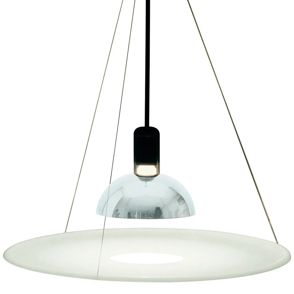 Über zarte Stahlseile ist die Diffusorscheibe der mit der Haltestruktur verbunden, sodass sie scheinbar schwerelos im Raum zu schweben scheint. Der halbkugelförmige Reflektor ist aus glanzvoll verchromtem Metallblech kreiert und zum Zwecke einer größtmöglichen Reflektion an seiner Innenseite weiß lackiert. Haltestruktur und Deckenrosette der Flos Frisbi Pendelleuchte bestehen aus schwarz lackiertem ABS.