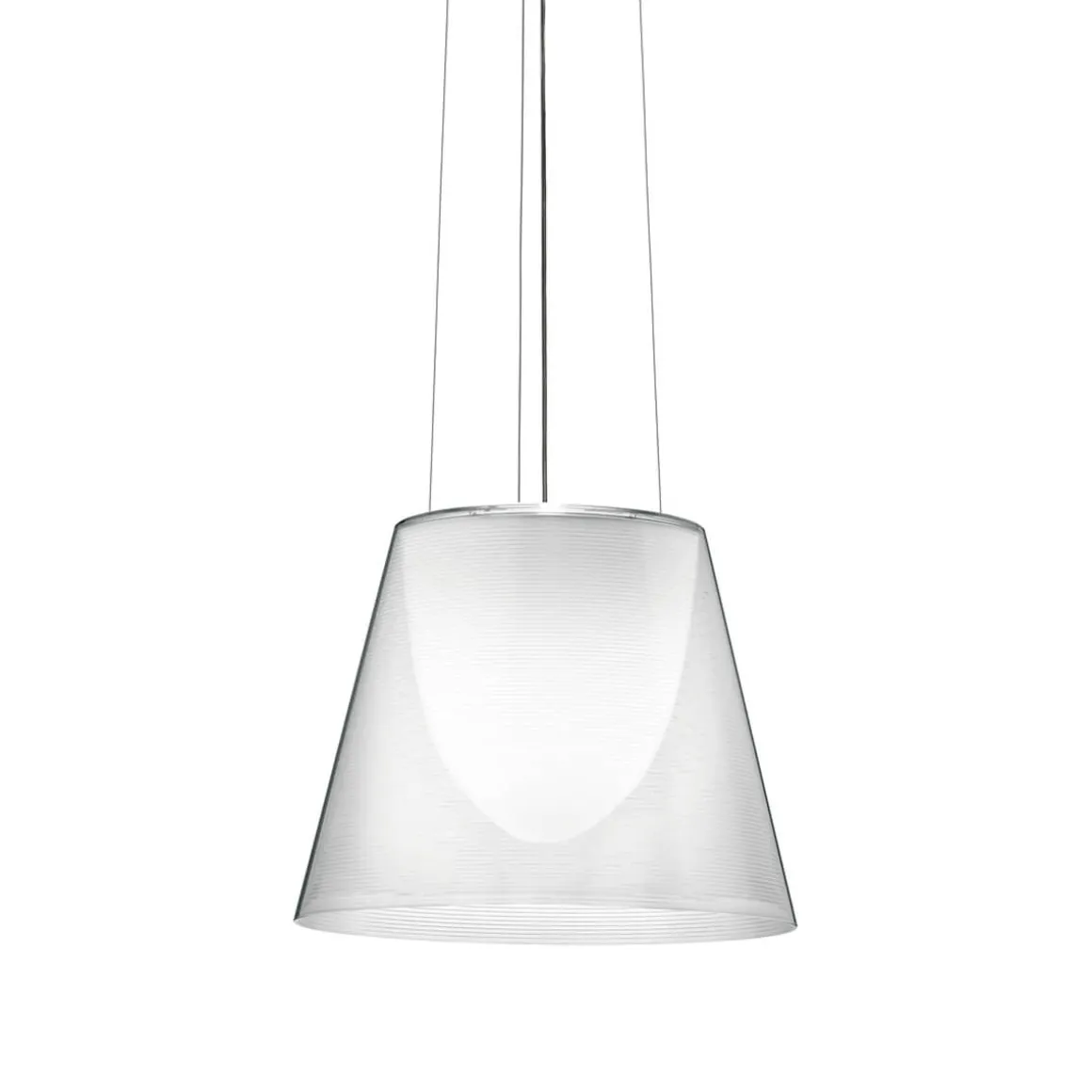 In den Pendellampen der Serie Flos KTribe, von dem französischen Designer Philippe Starck kreiert, verbindet sich eine klassische Formensprache mit moderner Eleganz. Zwei unterschiedliche Diffusoren bilden den Leuchtenkorpus: Der innere ist aus mattweißem Polycarbonat gefertigt und erzeugt ein diffus gestreutes, blendfreies Licht. Der äußere Diffusor reflektiert die Gestalt traditioneller Leuchtenschirme und besteht aus Polymethylmethacrylat (PMMA), das je nach Ausführung transparent gehalten, rauchfarben getönt oder bronzefarben metallisiert ist.