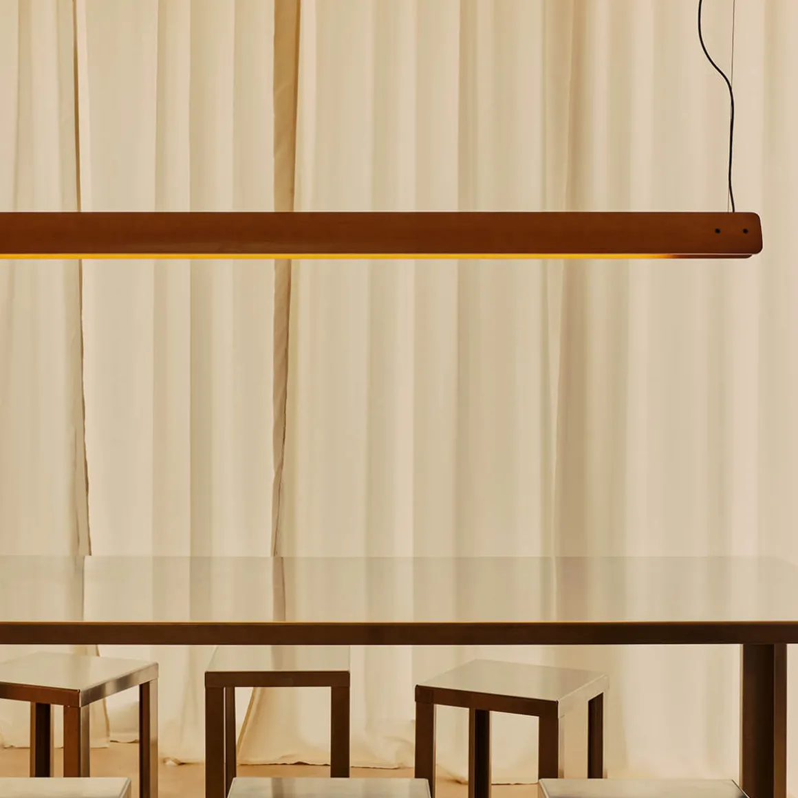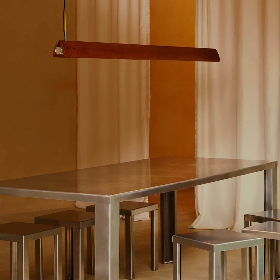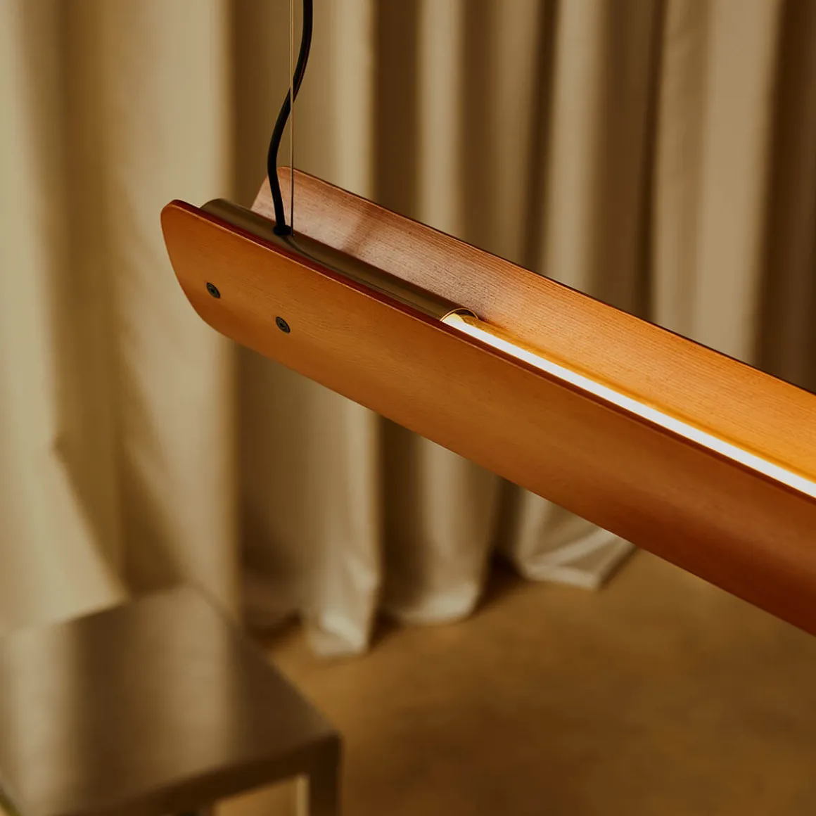 Zwei schlanke Holzflügel rotieren um eine zentrale, röhrenförmige Lichtquelle und ermöglichen so eine variable . Je nach Position der Flügel entsteht ein symmetrisches, beidseitiges Licht nach oben und unten oder ein asymmetrischer Lichtaustritt, der gezielt eine Tischfläche oder Zimmerdecke erhellt. Selbst bei fast geschlossenen Flügeln bleibt ein feiner Lichtstreifen sichtbar – ein subtiler, fast poetischer Effekt, der die Atmosphäre jedes Raumes bereichert.