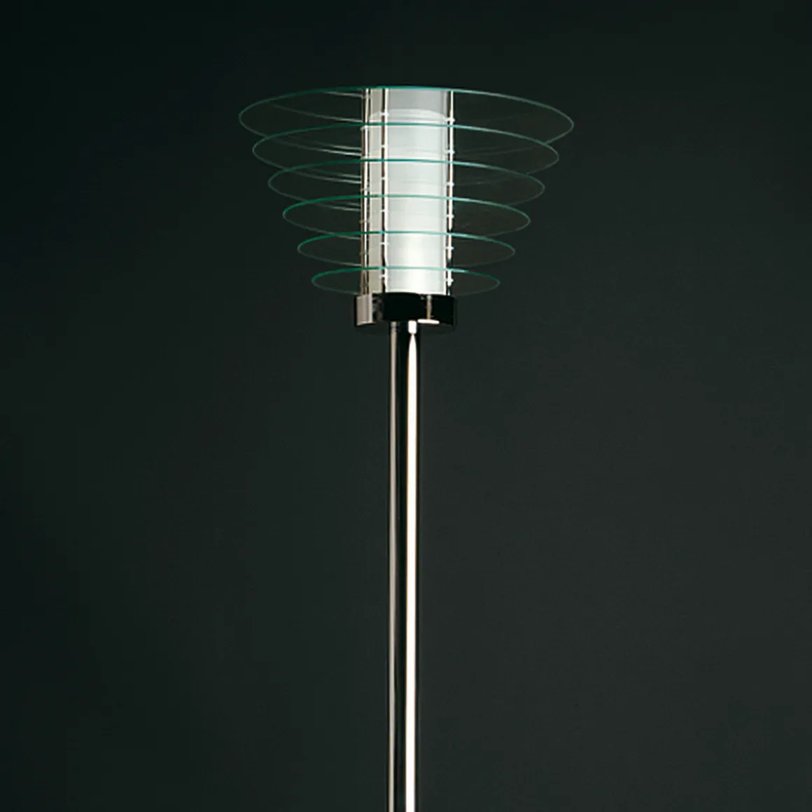 Mit der 0024 Stehleuchte lassen sich Innenräume stilvoll beleuchten. Die innovative Form entstammt dem Ideengut des italienischen Designers und Architekten Gio Ponti und wurde von diesem bereits 1933 erdacht. Blickpunkt des Designs ist der Leuchtenkopf, der wie eine moderne Laterne gestaltet ist: Mehrere Scheiben aus transparentem, getempertem Glas umfangen den zentralen Diffusor der 0024 Stehleuchte, der aus hitzebeständigem, sandgestrahltem Glas besteht. Da die Scheiben in ihrem Durchmesser variieren, ergibt sich eine attraktive kegelförmige Silhouette, die perfekt harmoniert mit dem zylinderförmigen Diffusor.