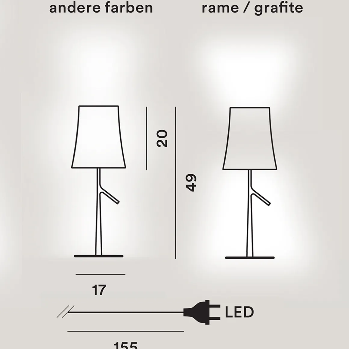 Vier topmodische Farben unterstreichen die Modernität der und variieren auch die Art der Lichtausstrahlung: In den Ausführungen Weiß und Grau hüllt das ausströmende Licht den Schirm in einen diffusen Schimmer. Bei den Versionen in metallisch anmutendem Graphit und Kupfer ist der Schirm lichtundurchlässig, sodass das Licht der Birdie Piccola Tavolo LED ausnahmslos nach unten und oben erstrahlt.