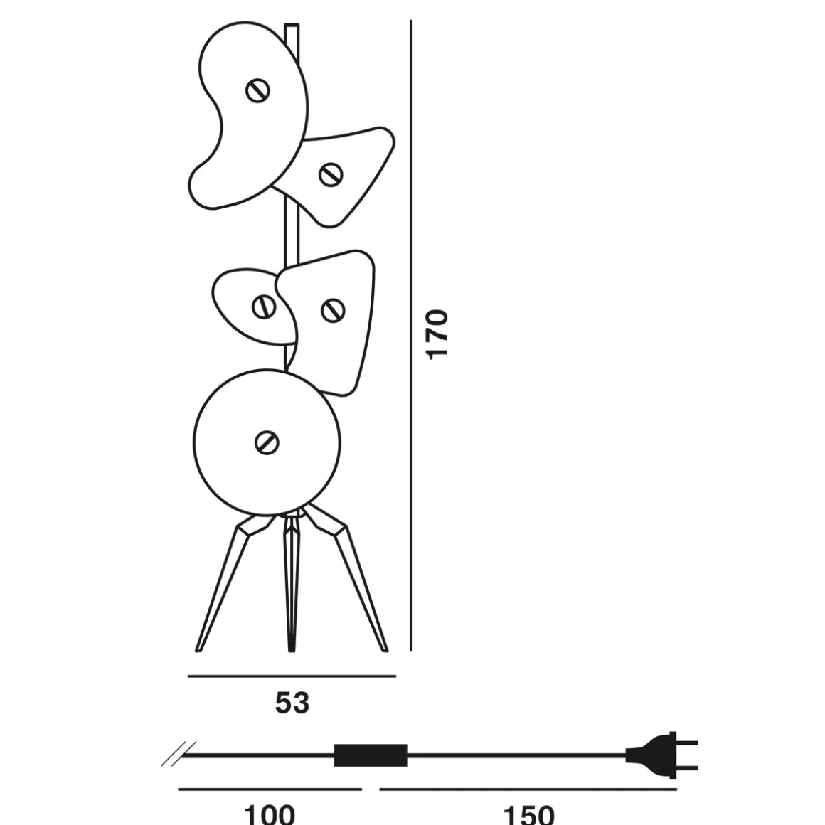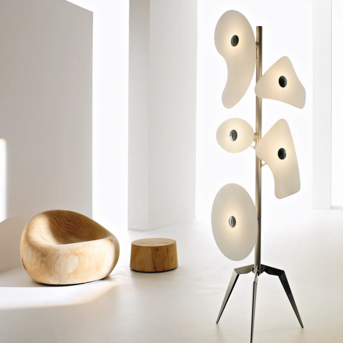 Die Orbital Terra, ein Designklassiker aus dem Jahr 1992, zeichnet sich durch ein besonders extravagantes Design aus. An einem schlanken, silberfarben lackierten Metallgestell zeigen sich fünf Glasscheiben unterschiedlicher Kontur und Größe befestigt, die der als Diffusoren dienen. Ihre organisch anmutenden Formen verleihen der Orbital Terra Stehleuchte eine bewegte Silhouette und machen sie zu einem Lichtpunkt mit experimentellen Charakter.