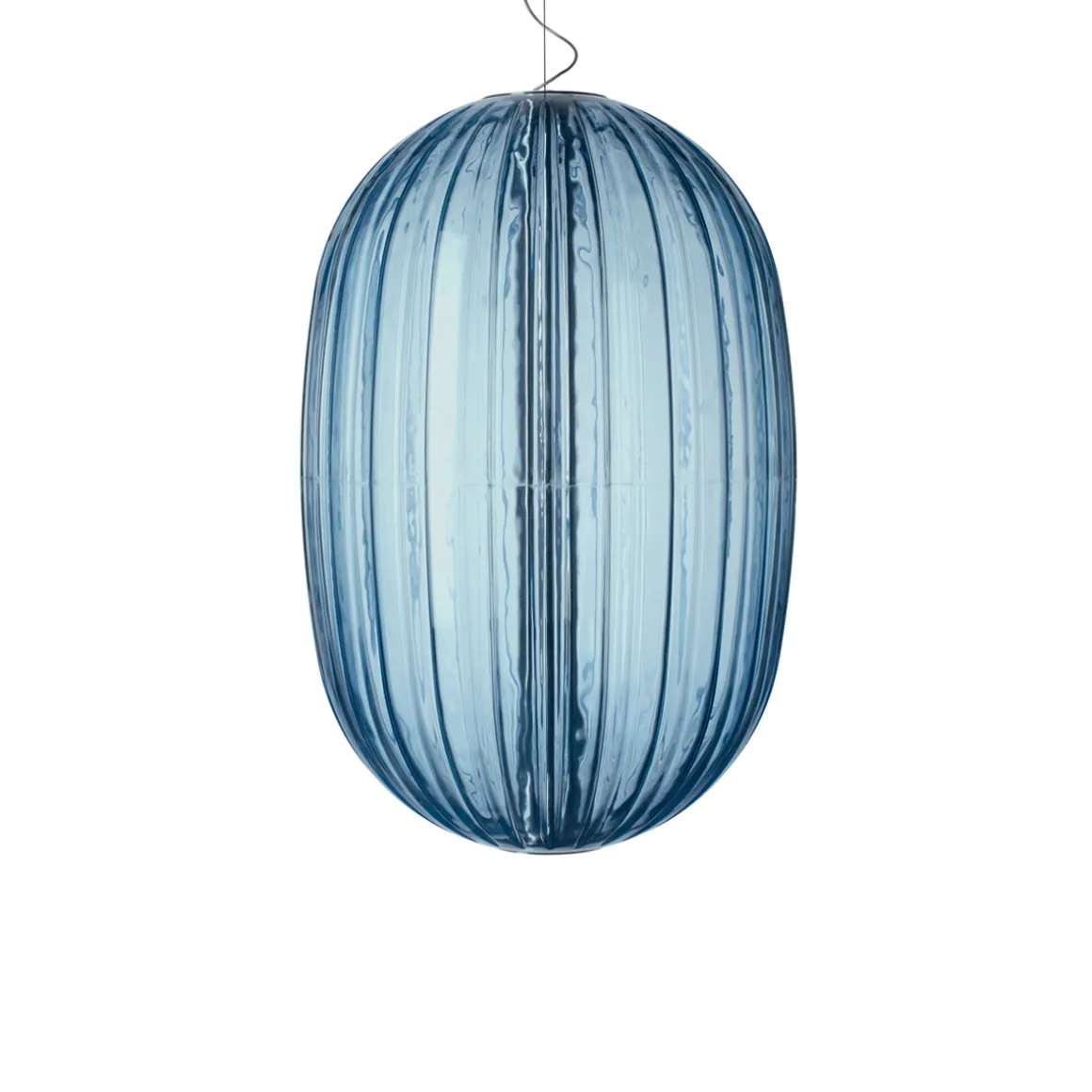 Gefertigt ist die voluminöse Pendellampe aus durchsichtigem, im Rotationsverfahren geformtem Polycarbonat. Die leichten Unregelmäßigkeiten, die den Leuchtenschirm zieren, sind als Reminiszenz an die venezianische Glaskunst zu verstehen, an Perlen aus geschliffenem Glas, die dem Designer als Inspirationsquelle dienten.