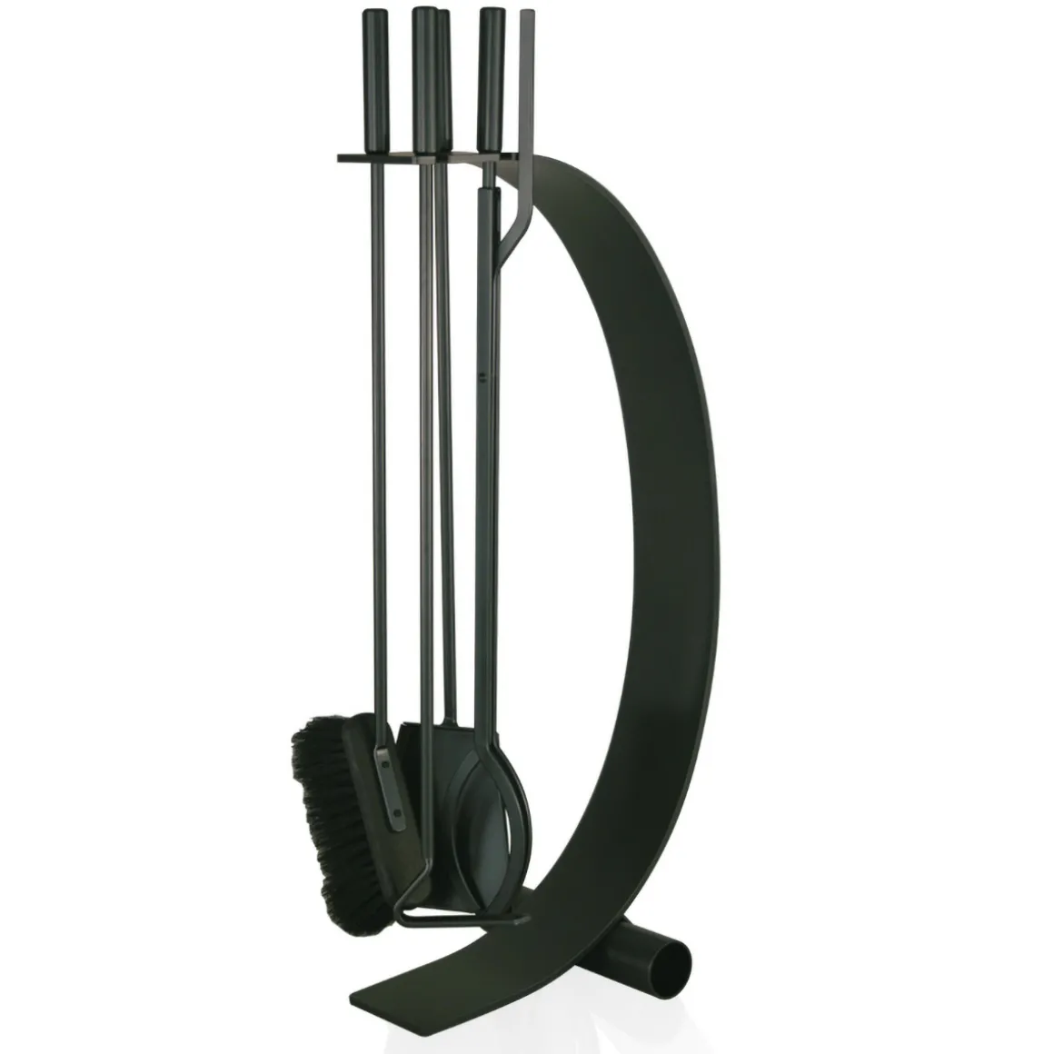 Das 4-teilige Kaminbesteck von Heibi besticht durch seinen elegant gebogenen Metallständer. Die Garnitur umfasst eine Schaufel, einen Besen (Rosshaarmischung), eine Zange und einen Schürhaken.