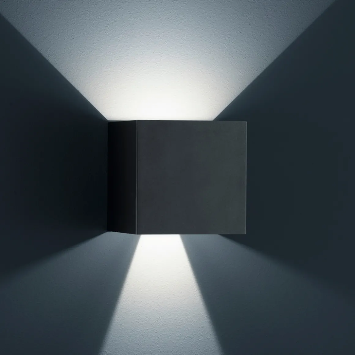 Die Außenwandlampe ist mit zwei verstellbaren Blenden ausgestattet, über die sich Up- & Downlight verstellen lassen. Bitte beachten Sie, dass Direkt- und Indirektlicht nicht unabhängig voneinander reguliert werden können. Es kann stets nur einer der beiden Lichtausrichtungen gebündelt bzw. breiter ausfallen. Stehen die Blenden parallel zueinander, ergibt sich ein gleichmäßig breiter Lichtaustritt nach oben und unten.