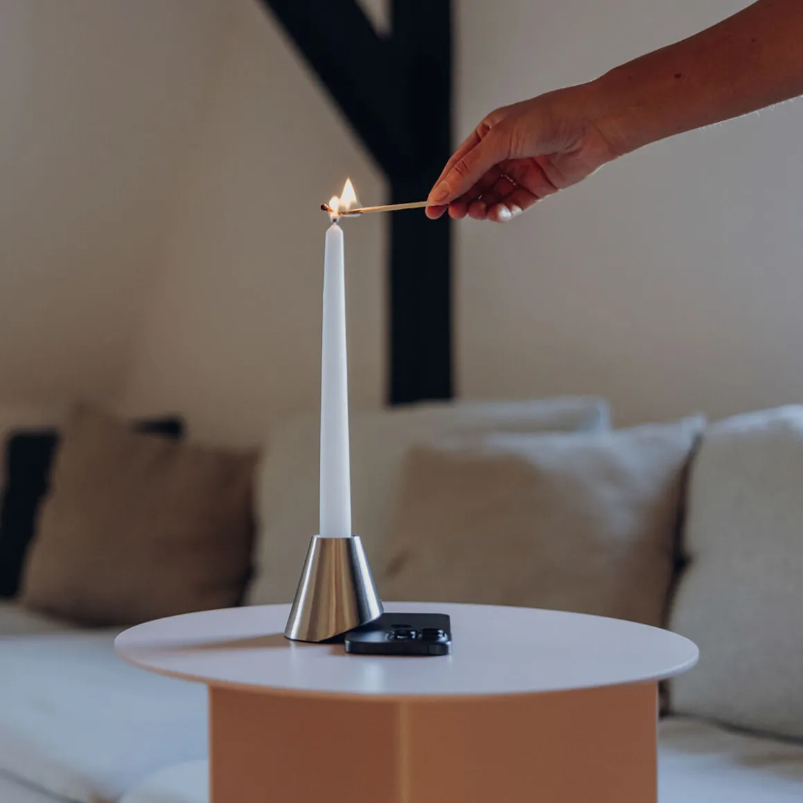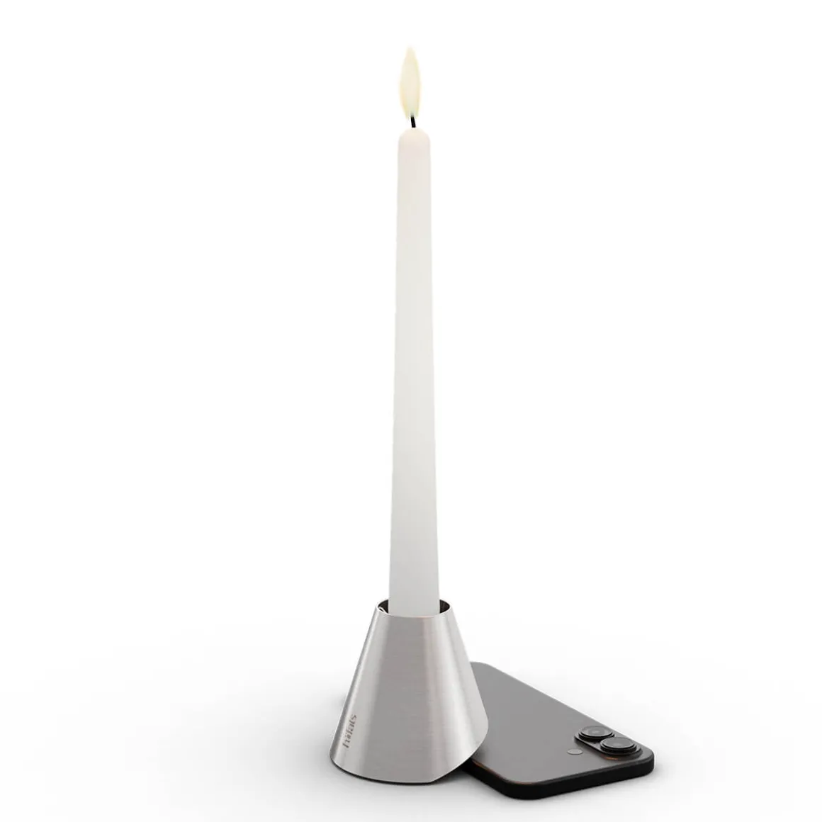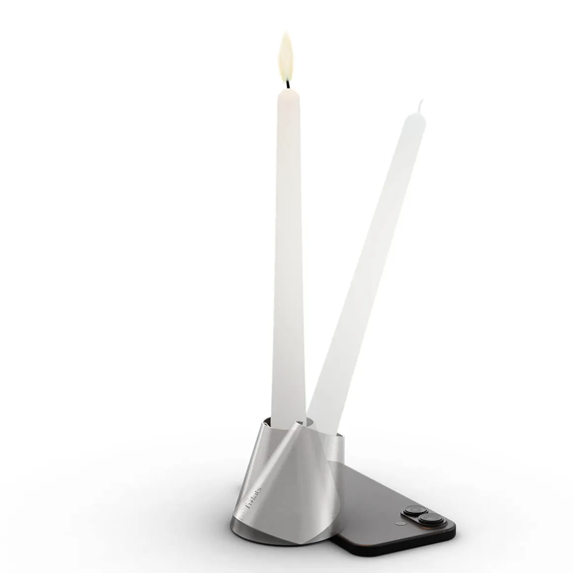 Von Natur aus leicht schräg konstruiert, richtet sich der Kerzenhalter auf, sobald ein Smartphone unter ihn geschoben wird. So verwandelt er digitale Ablenkung in ein Signal für Nähe, Blickkontakt und echte Gespräche. Der sanfte Schein einer Kerze sorgt für Wärme und Behaglichkeit – eine Atmosphäre, in der Menschen wieder ins Gespräch kommen, lachen, zuhören und diskutieren.