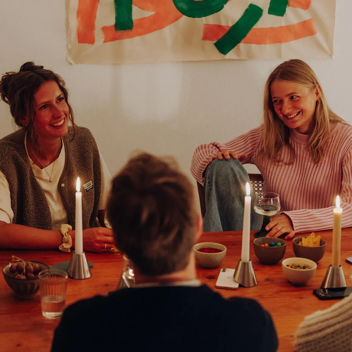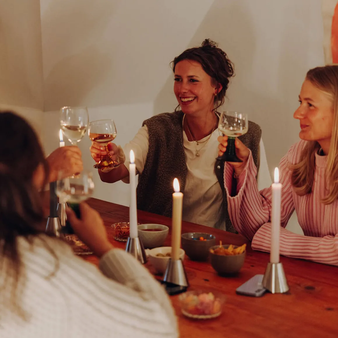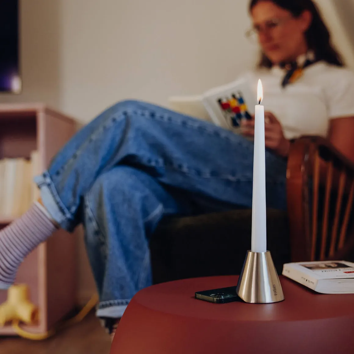 Von Natur aus leicht schräg konstruiert, richtet sich der Kerzenhalter auf, sobald ein Smartphone unter ihn geschoben wird. So verwandelt er digitale Ablenkung in ein Signal für Nähe, Blickkontakt und echte Gespräche. Der sanfte Schein einer Kerze sorgt für Wärme und Behaglichkeit – eine Atmosphäre, in der Menschen wieder ins Gespräch kommen, lachen, zuhören und diskutieren.