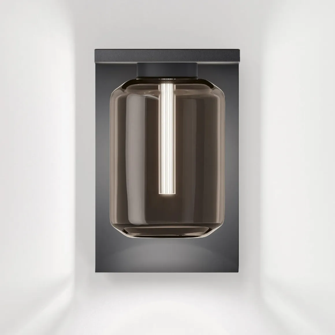 Die Dia F von .DE ist eine moderne Neuinterpretation einer klassischen Laterne. Sie hat einen geradlinigen Aluminiumrahmen und einen geblasenen Körper aus rauchfarbenem Glas.
