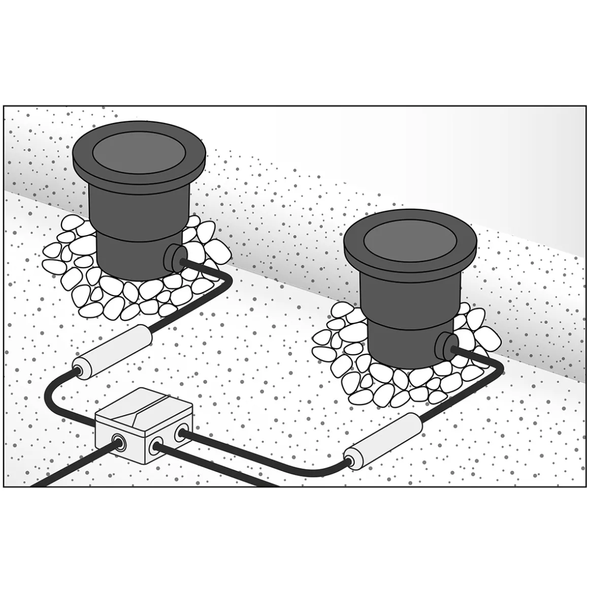 Der .DE Erd-Abzweigkasten ermöglicht den Anschluss von bis zu 6 Leuchten an die bauseitig verlegte Zuleitung im Erdreich. Nach der Installation werden alle elektrischen Leitungen im Abzweigkasten mit Gießharz verschlossen (im Lieferumfang inbegriffen).