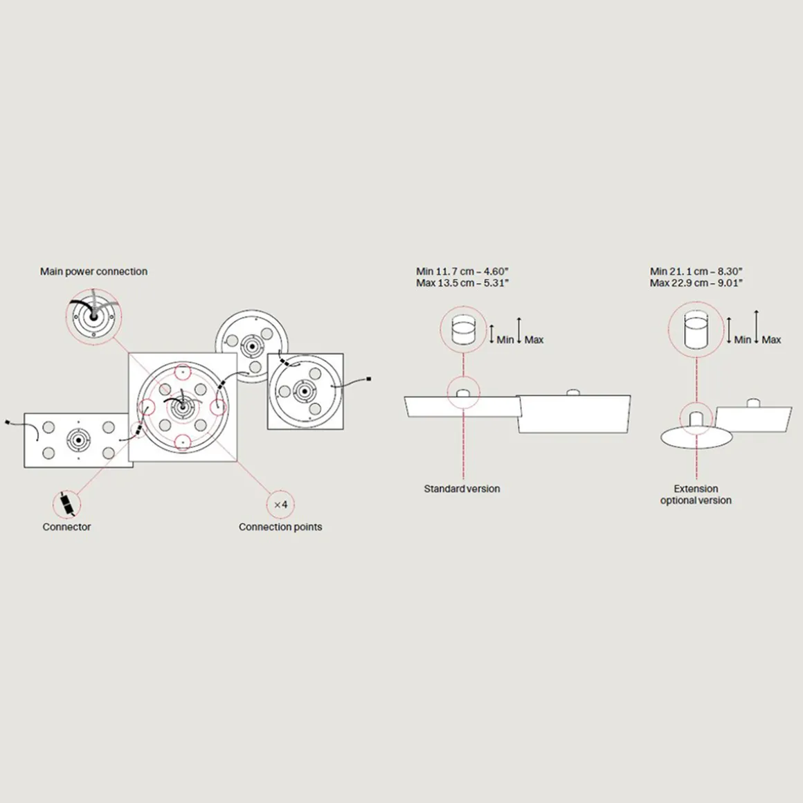 Die Leuchten der Serie Lodes Puzzle Mega können zu einer individuellen Komposition zusammengeschlossen werden. Bis zu 36 Modelle der Serie können hierbei miteinander kombiniert werden – bei nur einem Stromauslass. Verbindungsstücke, um jeweils zwei Leuchten zu verknüpfen, sowie wahlweise eine Verlängerung der Wand- bzw. Deckenhalterung sind als Zubehör erhältlich.