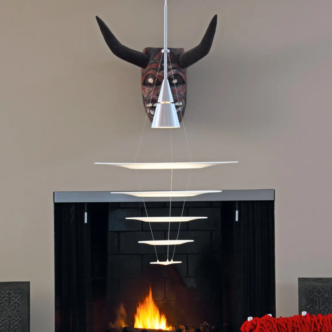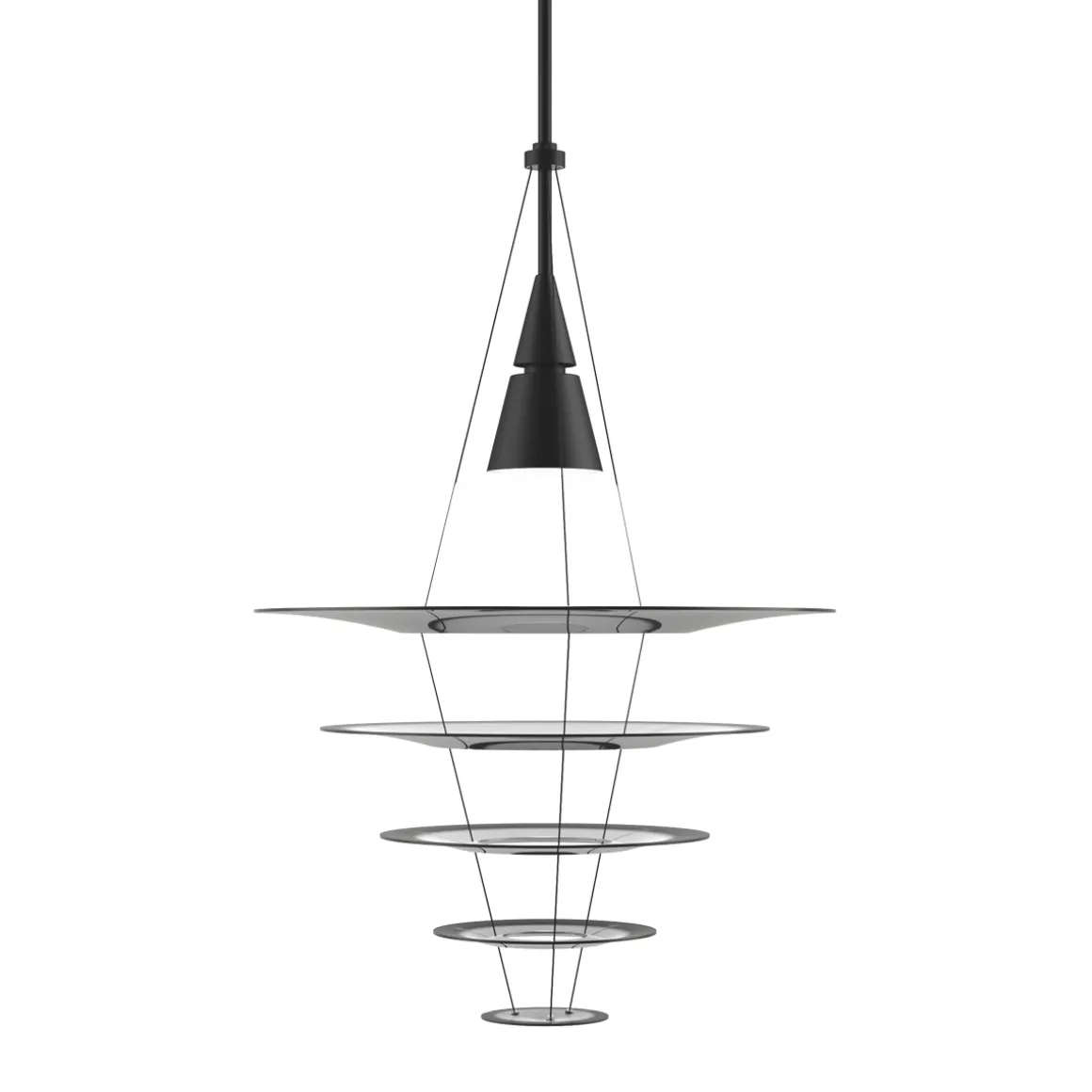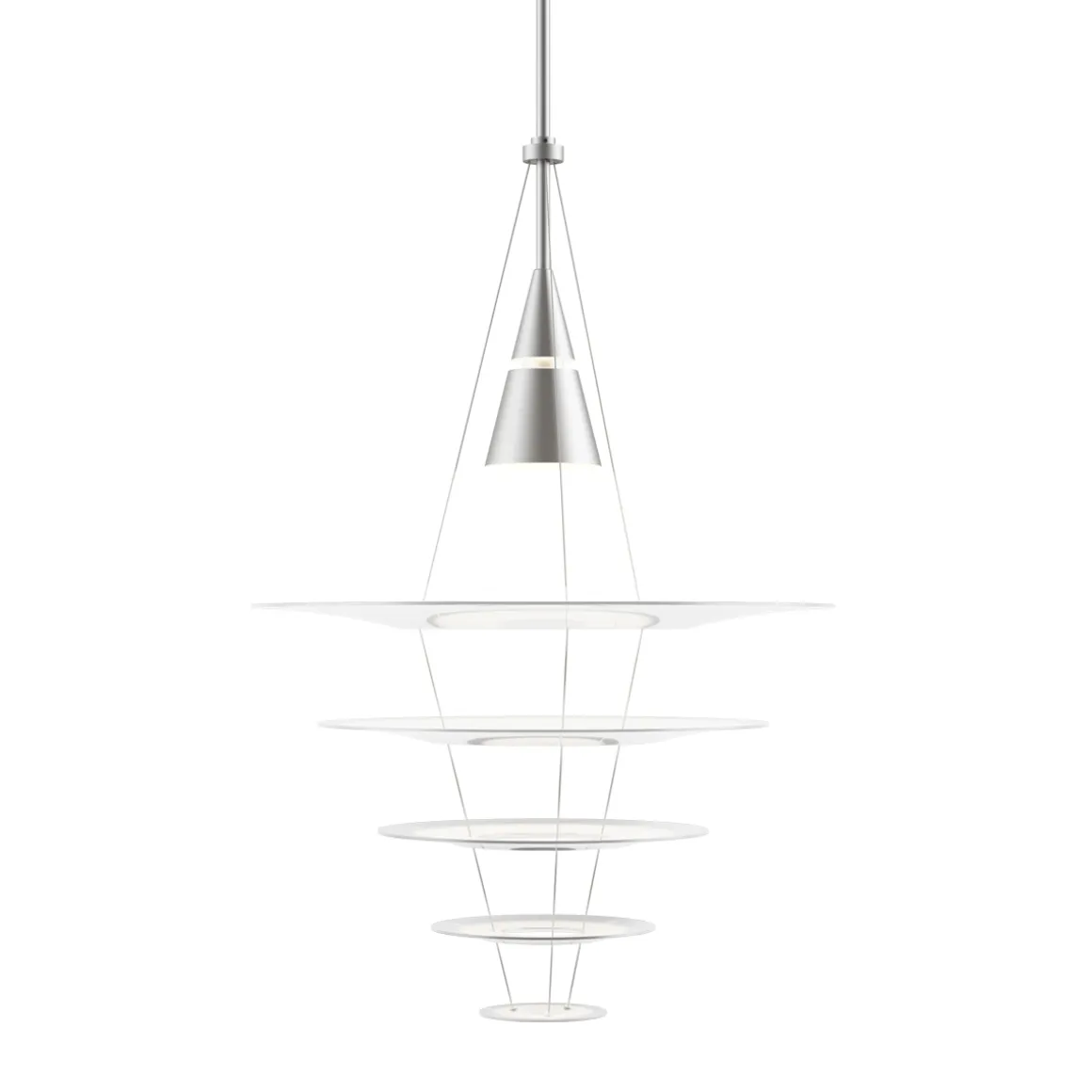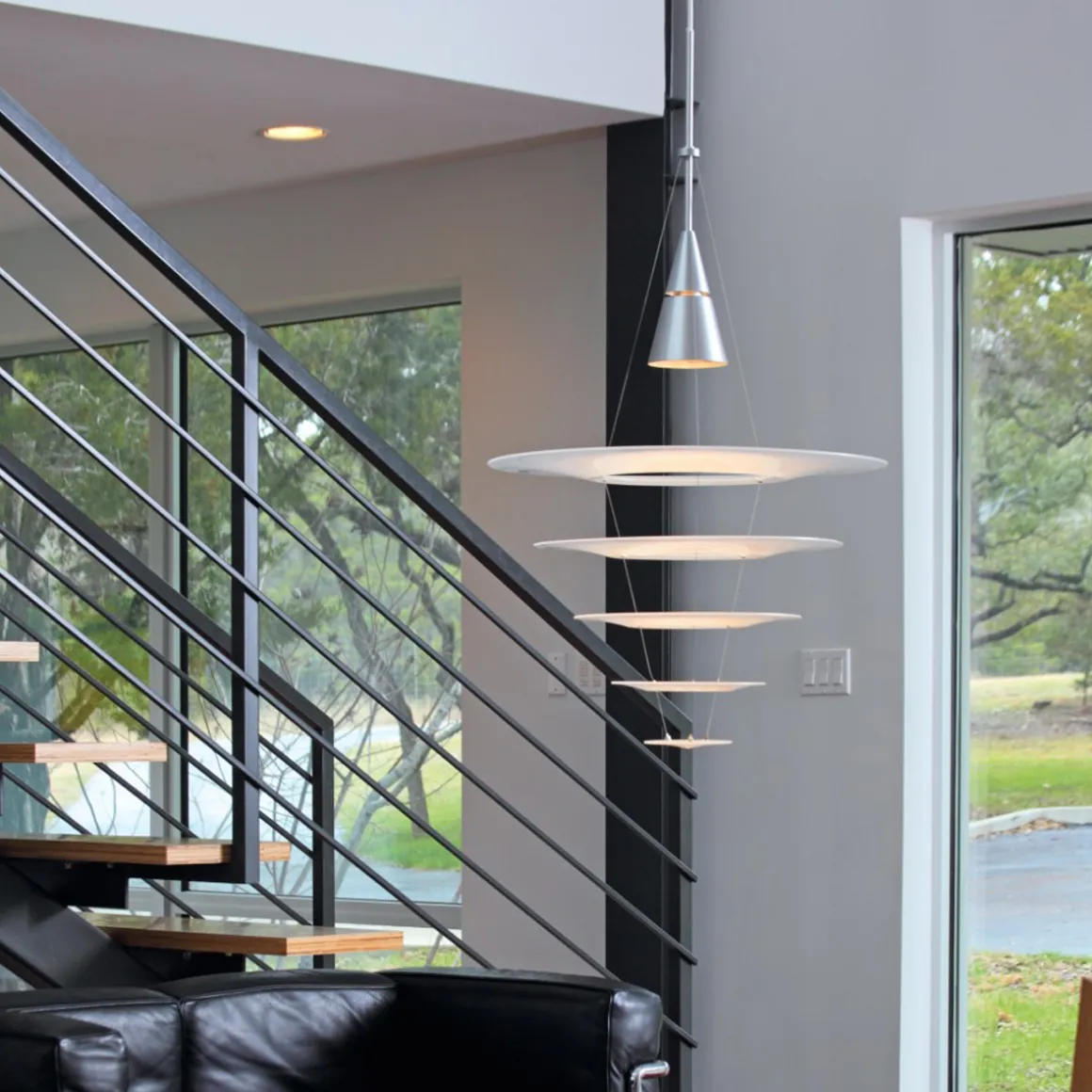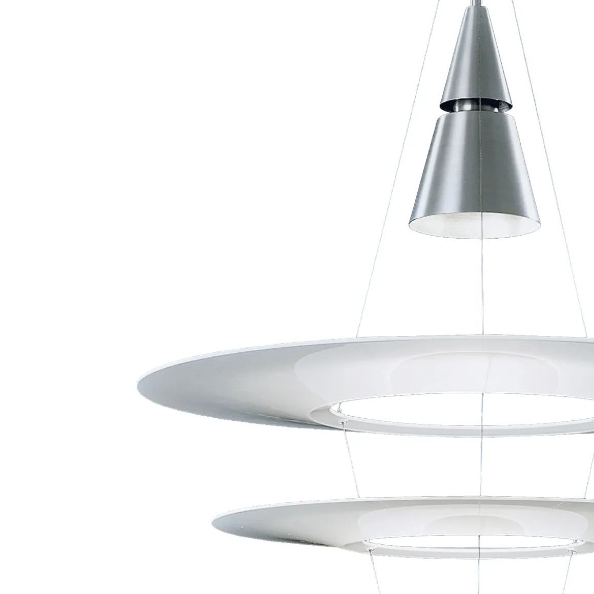 Die Enigma 545 Pendelleuchte, eine Produktkreation des japanischen Designers Shoichi Uchiyama, überrascht durch ihre ungewöhnliche Leichtigkeit und Transparenz. Ausgelöst wird dieser Eindruck durch die übereinander angeordneten Leuchtenschirme, die scheinbar schwerelos und frei unter der Lichtquelle schweben. Dass die aus Acryl gefertigten Schirmsegmente an zarten Edelstahlseilen befestigt sind, erkennt der Betrachter erst auf den zweiten Blick.