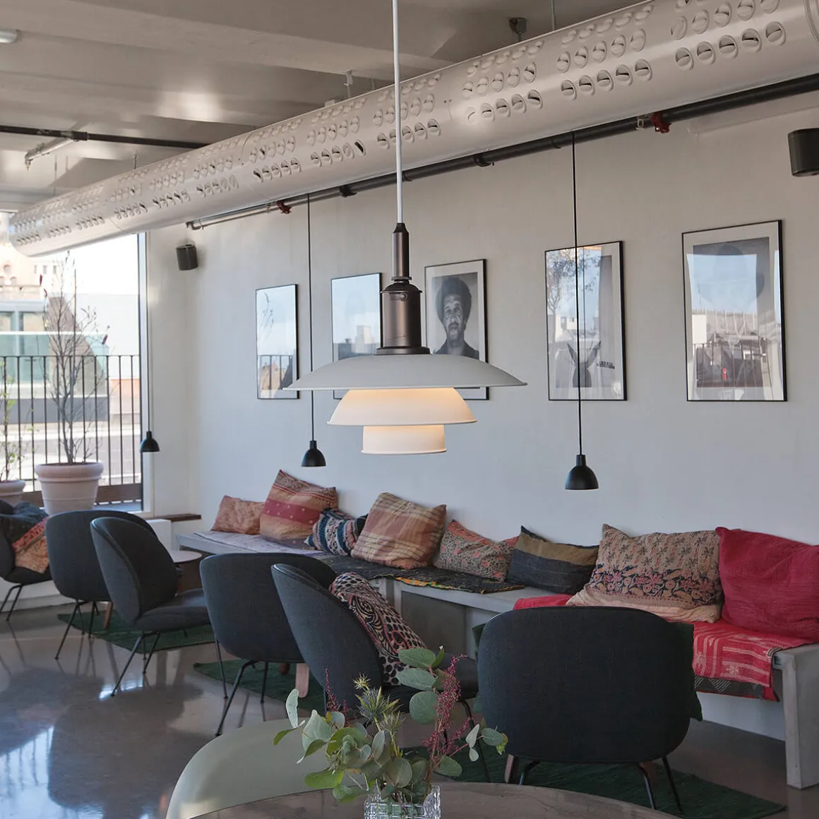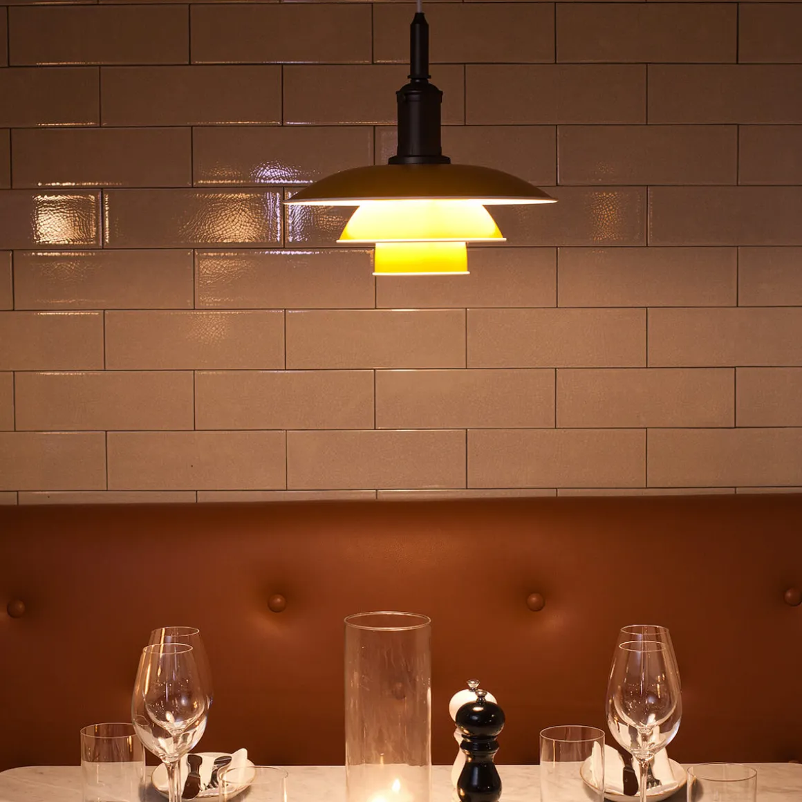 Entwickelt auf der Grundlage von Poul Henningsens revolutionärem reflektierenden Dreischirmsystem, das den Großteil des Lichts nach unten lenkt, garantiert die PH 3½-3 eine vollkommen blendfreie Beleuchtung. Die Aluminiumschirme mit weiß lackierten Innenseiten optimieren die weiche und komfortable . Dies macht die Pendellampe zur perfekten Akzentbeleuchtung über Esstischen, Küchentresen oder in gastronomischen Einrichtungen. Die kupferne Aufhängung verleiht der industrielles Flair.