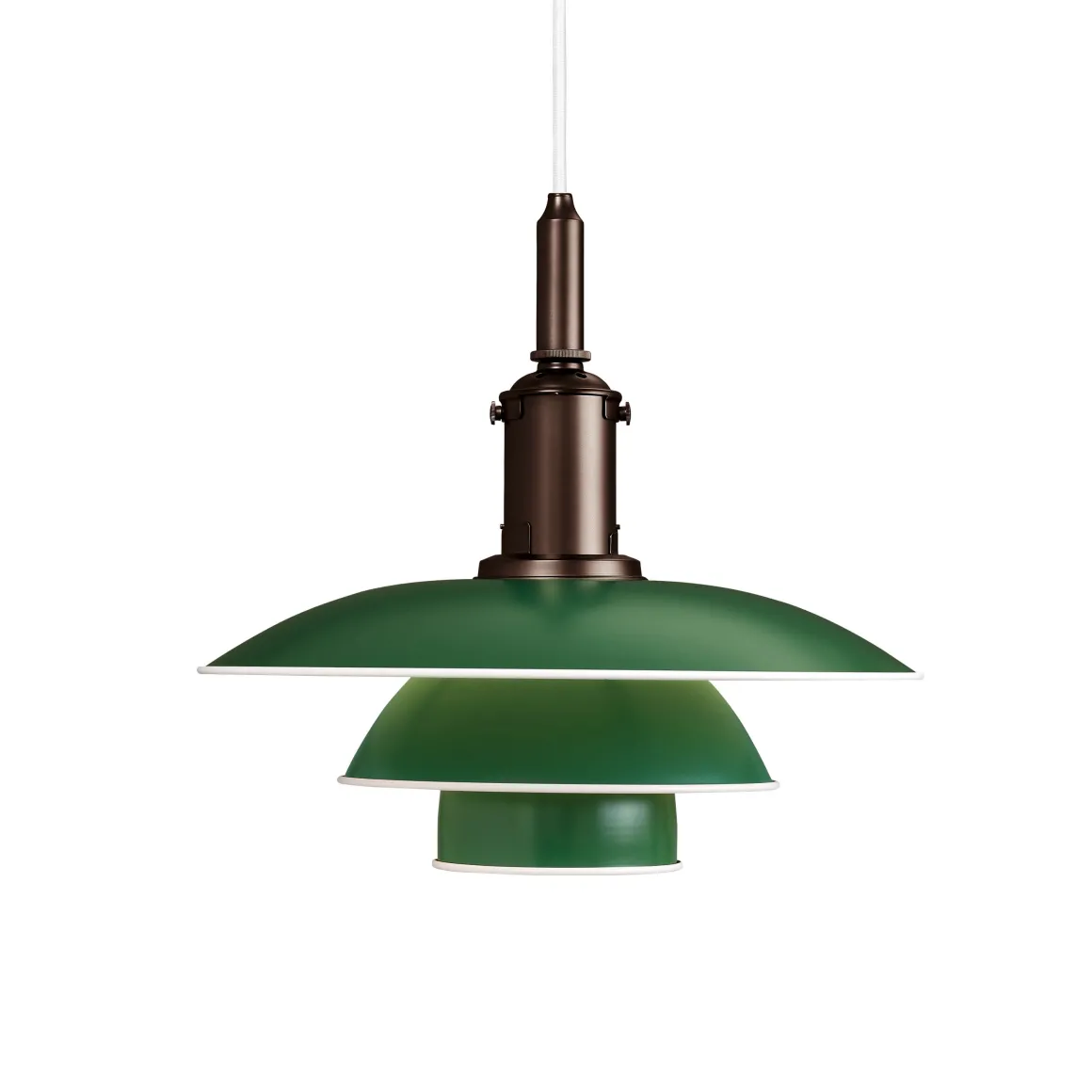 Basierend auf Poul Henningsens Originalzeichnungen aus den späten 1920er bis frühen 1930er Jahren, präsentieren sich die Pendellampen in lebendigen Farben wie Grün, Gelb, Rot und Weiß. Sämtliche Töne sind aus Henningsens Farbuniversum entlehnt und sorgen für eine farbenfrohe Vielfalt. Ein besonderes Detail ist die gerollte, weiß lackierte Kante der Schirme, die die ikonische Form der Dreischirmeleuchte betont und für optische Symmetrie sorgt.