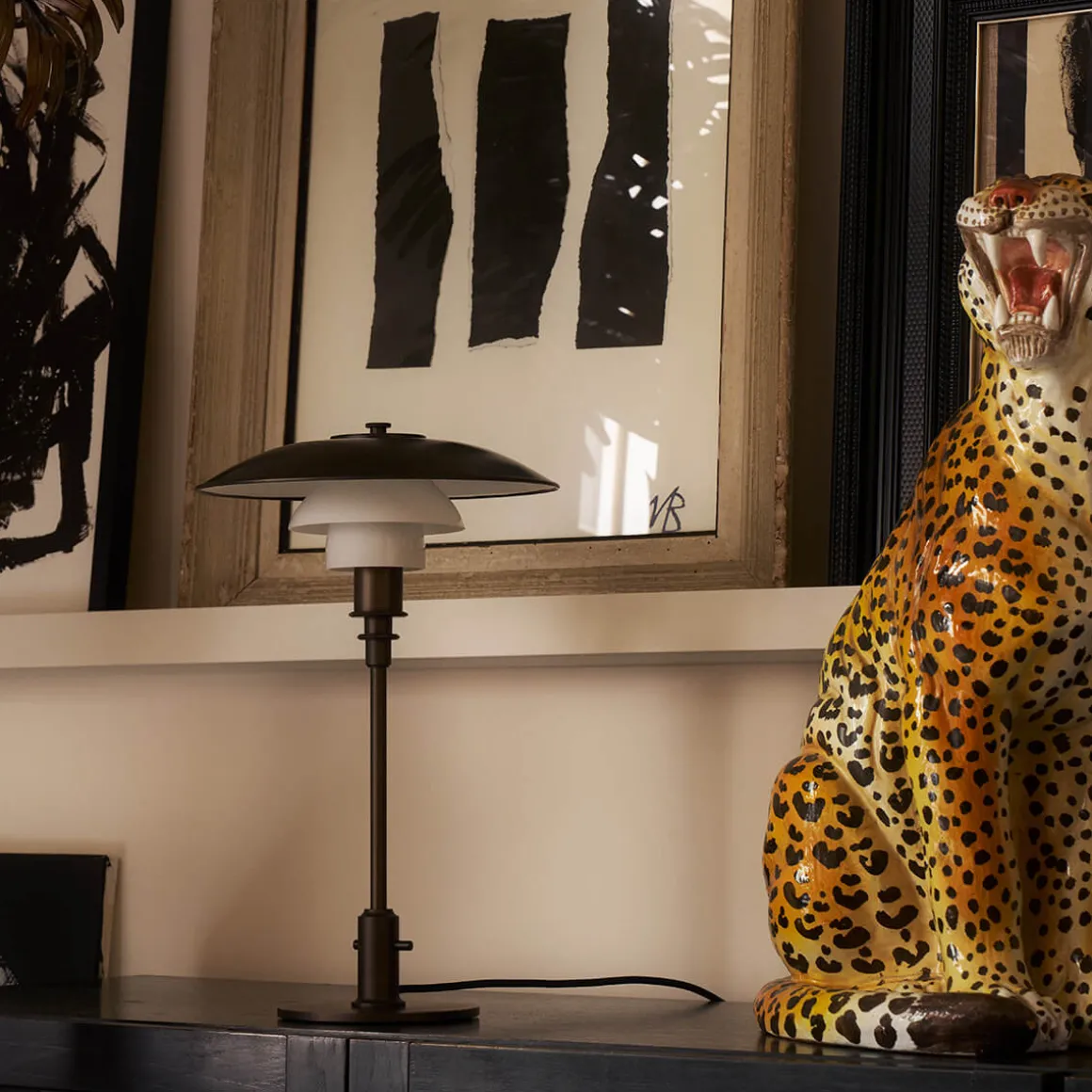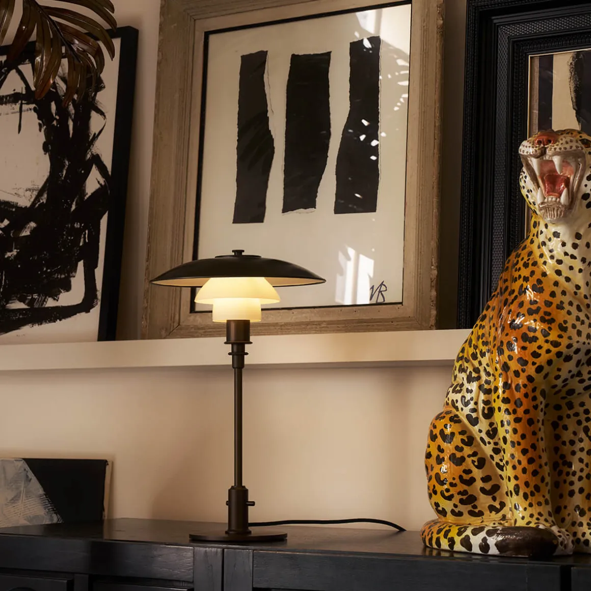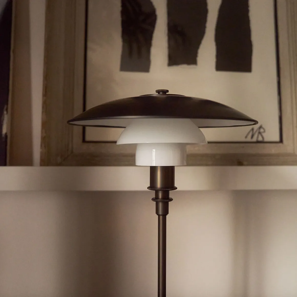 Louis Poulsen PH 3/2 Aged Brass Opal Tischleuchte: skandinavische Designikone für ein warmes Licht