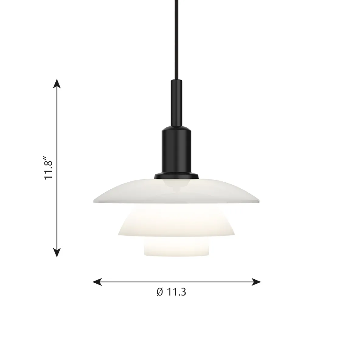 Durch ihr charakteristisches reflektierendes Dreischirmsystem erzeugt die PH 3/3 ein diffuses, angenehmes Raumlicht. Erhältlich ist sie mit Schirmen aus mundgeblasenem Opalglas oder aus mattschwarz lackiertem Metall mit Soft-Touch-Finish. Die lichtdurchlässigen Glasschirme erzeugen einen weichen, diffusen Schimmer, während die Metallschirme das Licht stärker nach unten lenken. Bei der Kombination aus Metalloberschirm und Opalglasschirmen strahlt das Licht sowohl nach unten als auch zur Seite hin. Ein mitgelieferter mattierter Glasdiffusor kann der Hängelampe nachträglich eingesetzt werden, um eine noch sanftere Lichtwirkung zu erzielen.