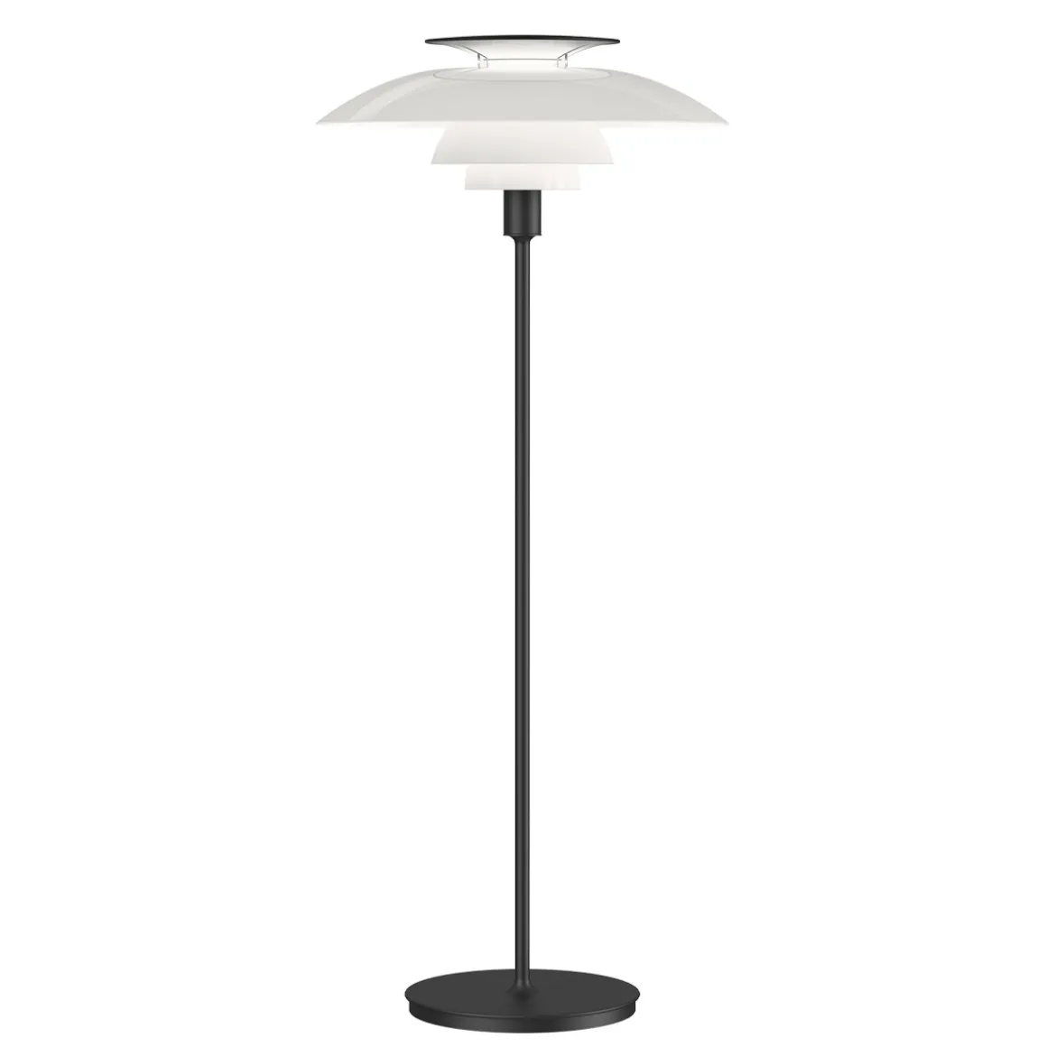 Dieser Ansatz kennzeichnet auch die PH 80 Stehleuchte. Dank des dreiteilig aufgebauten, opalen Acrylschirms erzeugt die ein ansprechendes, diffuses Licht, das in jedem Zimmer ein angenehmes Ambiente schafft. Über den trompetenförmigen Reflektor auf der Oberseite des Schirms wird das Licht zudem nach unten hin reflektiert, sodass sich eine vornehmliche direkte, blendreduzierte Beleuchtung ergibt.