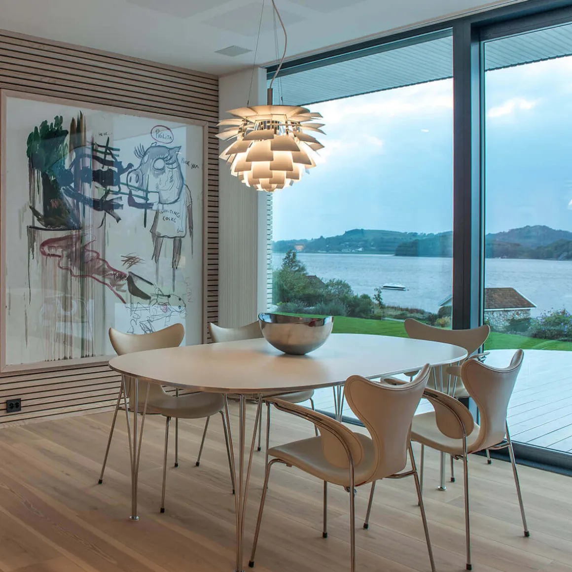 Gefertigt ist die an den Blütenstand einer Artischockenpflanze erinnernde Louis Poulsen PH Artichoke 480 aus 72 dünnen Blättern aus Metall, die dank ihres Neigungswinkels – von jedem Betrachtungswinkel aus gesehen – eine 100-prozentig blendfreie Lichtausstrahlung gewährleisten. Indem die Blätter das ausströmende Licht reflektieren, strahlen sie die selbst an und erzeugen ein rundum symmetrisches, diffus gestreutes Licht. Auf diese Weise ergibt sich ein komfortables wie auch dekoratives Stimmungslicht.