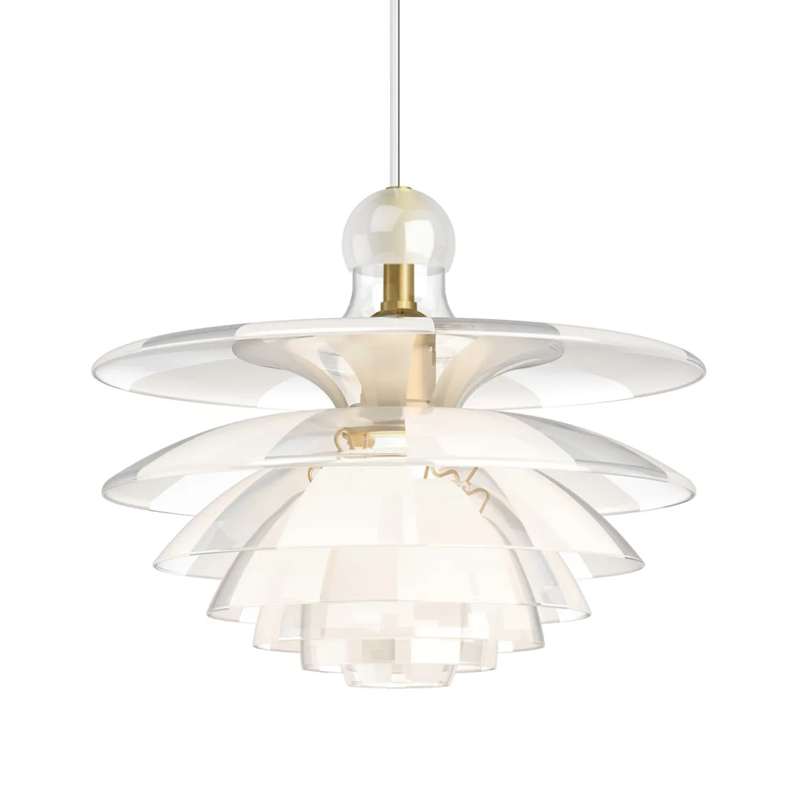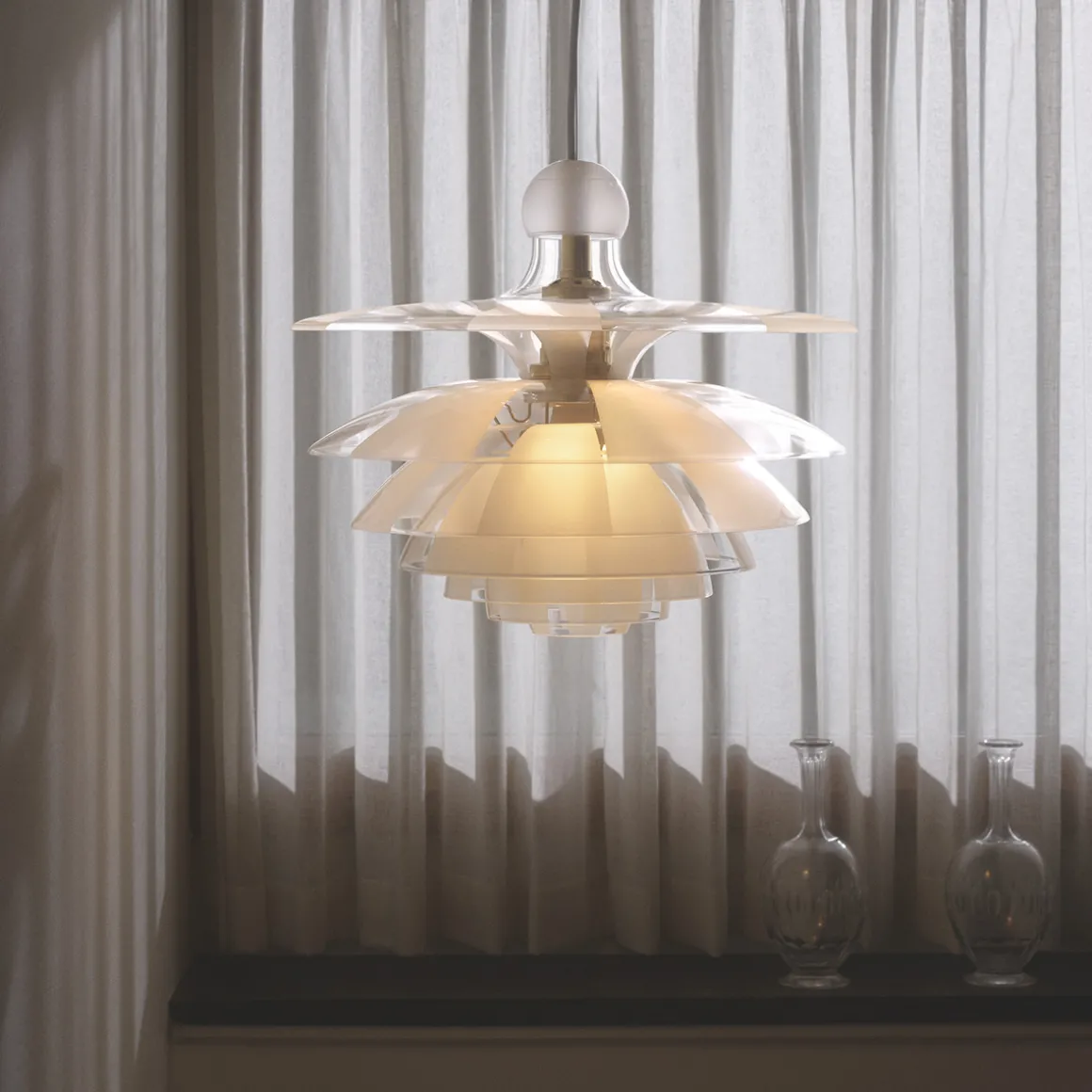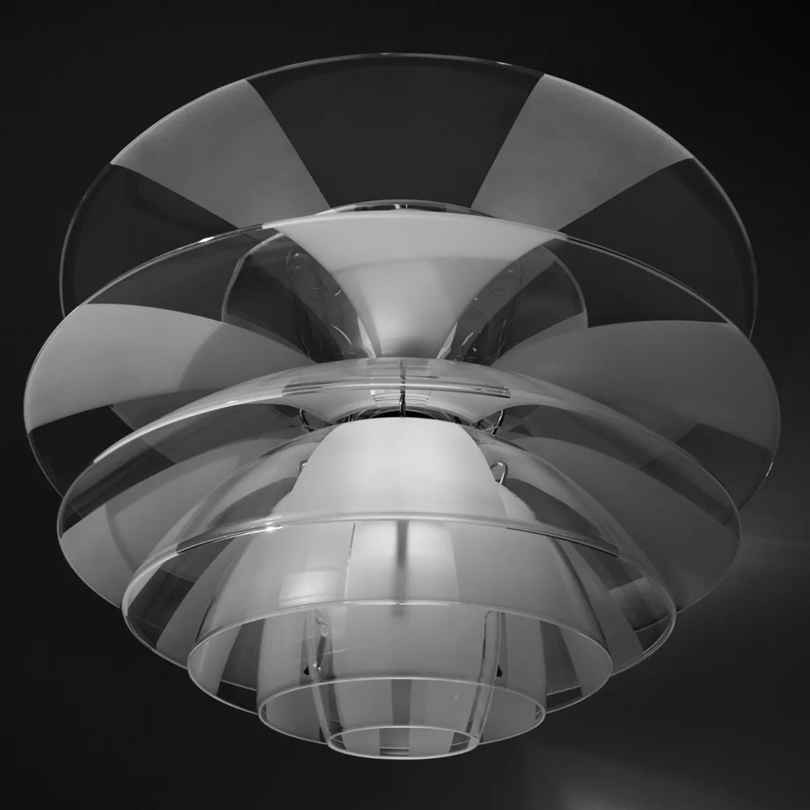 Die weiche Lichtstreuung verdankt sich der besonderen Behandlung der PH Septima Glasschirme. Diese bestehen aus zartem, zugleich robustem italienischem Borosilikatglas. Die Klarglasschirme wurden in der Weise behandelt, dass sie abwechselnd klare und mattierte breite Streifen aufweisen. Da die mattierten Streifen jeweils über den klaren liegen, werden Blendungen reduziert und das ausstrahlende Licht auf wunderbare Weise in den Raum gestreut. Eine sandgestrahlte Glaskugel auf der Spitze der Krone verhindert, dass Staub und Schmutz in die Hängeleuchte eindringen.