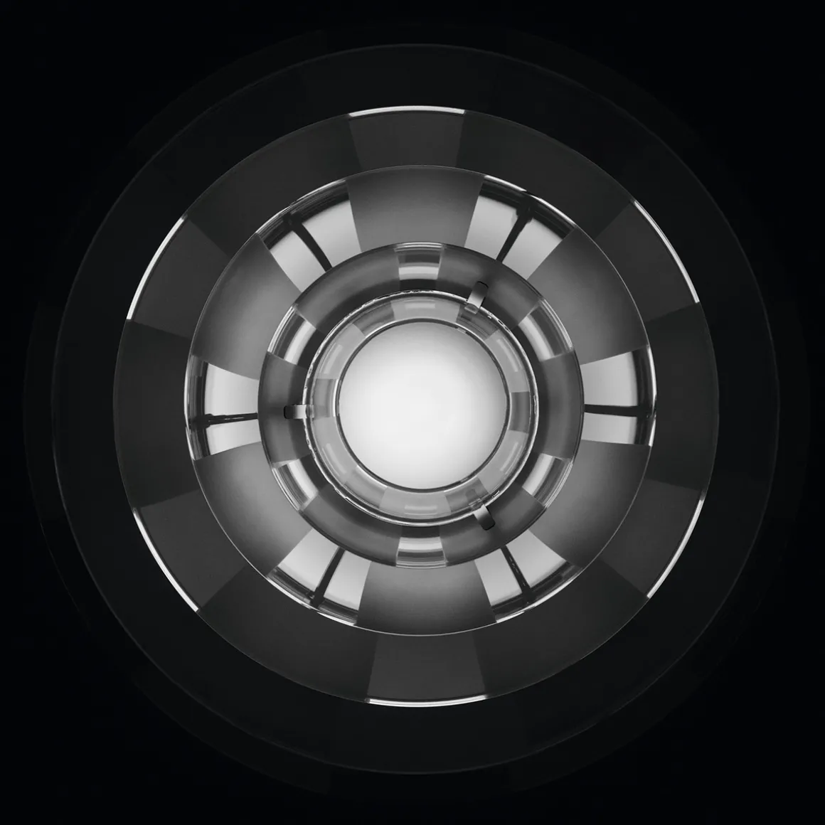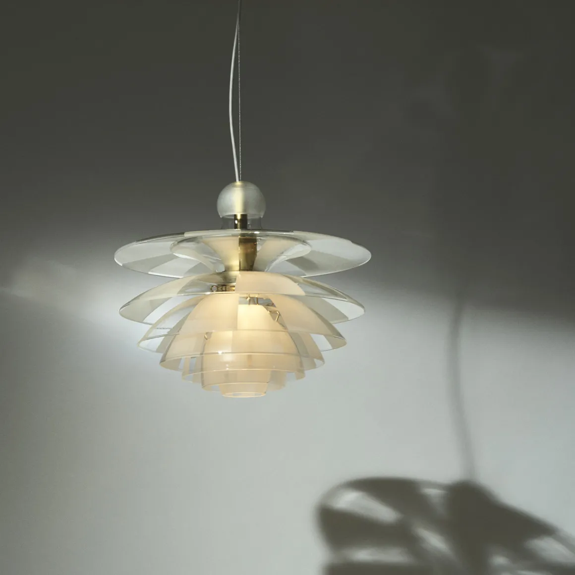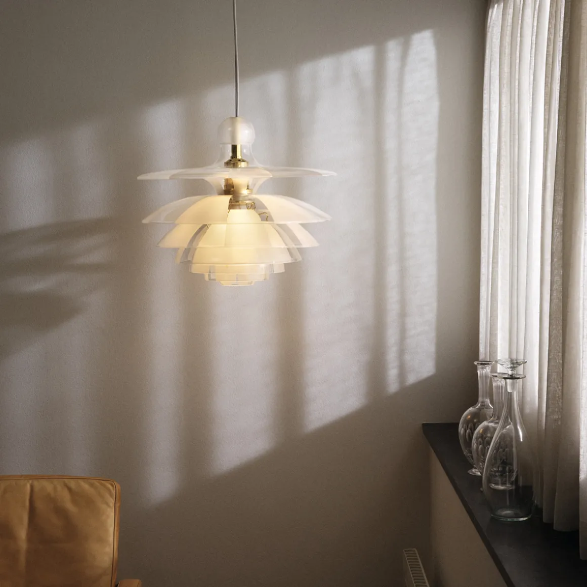 Die weiche Lichtstreuung verdankt sich der besonderen Behandlung der PH Septima Glasschirme. Diese bestehen aus zartem, zugleich robustem italienischem Borosilikatglas. Die Klarglasschirme wurden in der Weise behandelt, dass sie abwechselnd klare und mattierte breite Streifen aufweisen. Da die mattierten Streifen jeweils über den klaren liegen, werden Blendungen reduziert und das ausstrahlende Licht auf wunderbare Weise in den Raum gestreut. Eine sandgestrahlte Glaskugel auf der Spitze der Krone verhindert, dass Staub und Schmutz in die Hängeleuchte eindringen.