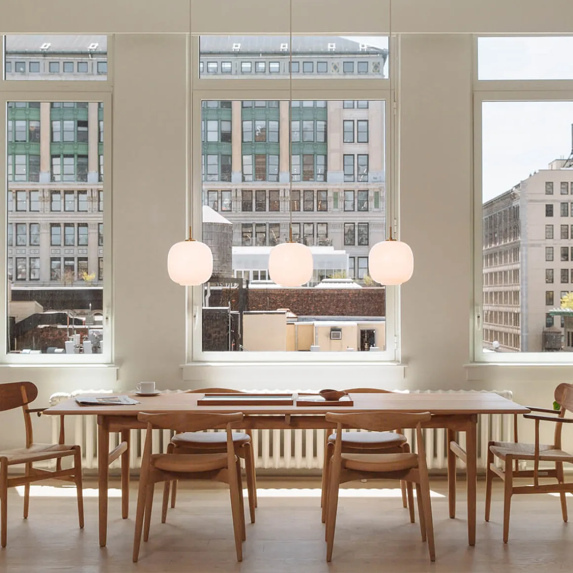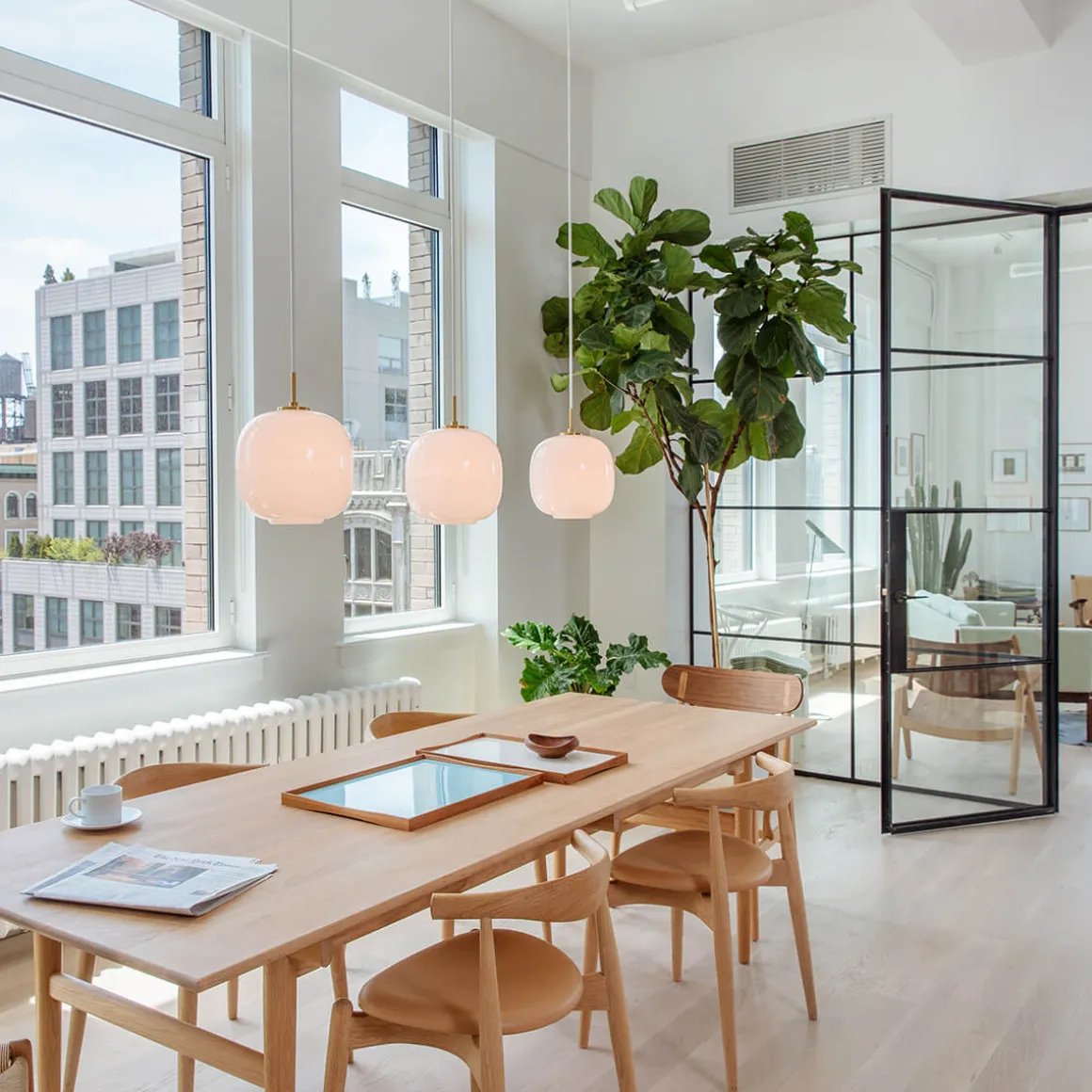 Der dreischichtige Schirm, mittels traditioneller mundgeblasener Glastechnik hergestellt, sorgt für eine gleichmäßige Lichtwirkung und strahlt zugleich ein nach unten gerichtetes, atmosphärisches Licht aus. Ob als stilvoller Blickfang über Esstischen, Theken oder in hohen Räumen – die VL 45 Radiohus fügt sich harmonisch in jede Umgebung ein und kreiert ein warmes, einladendes Ambiente.