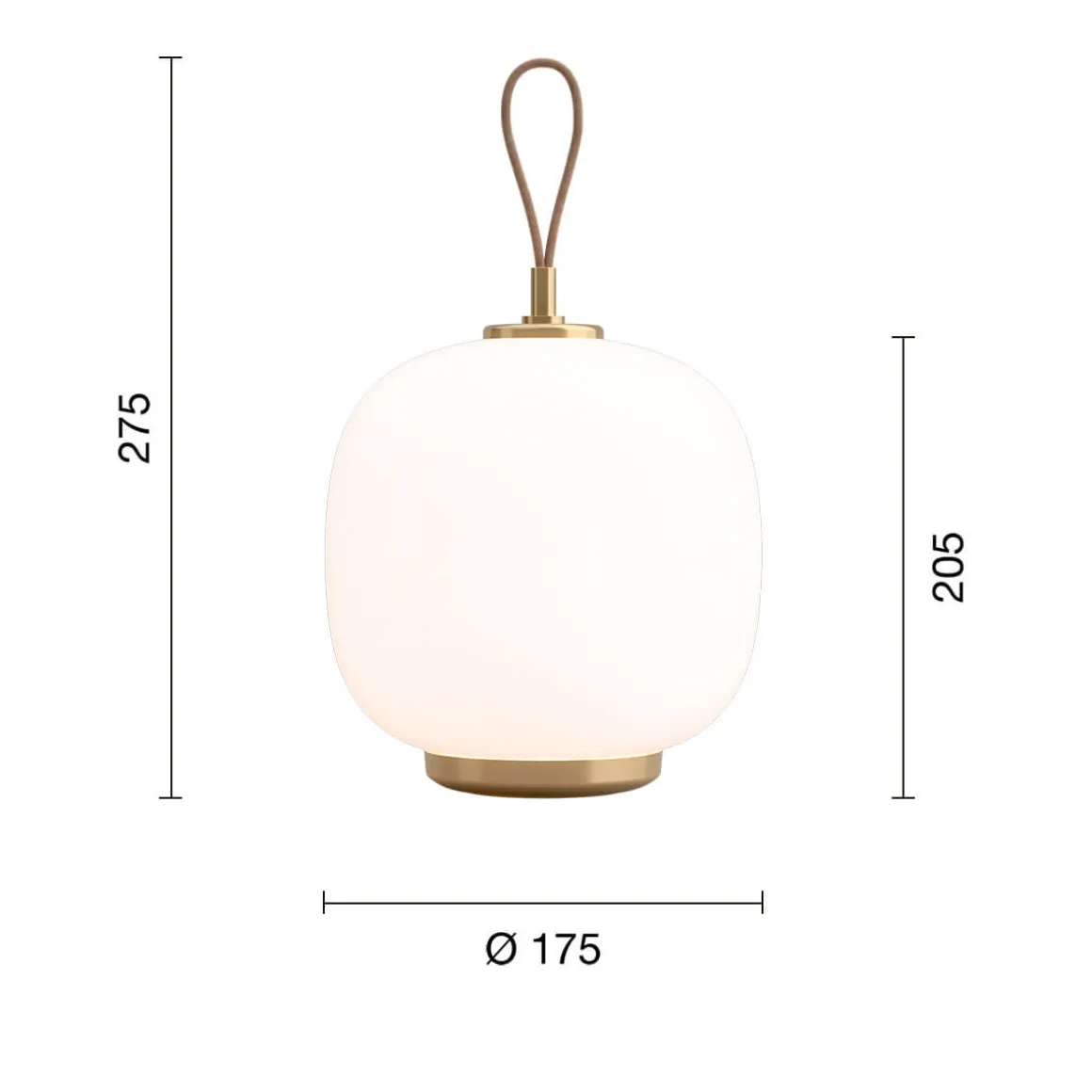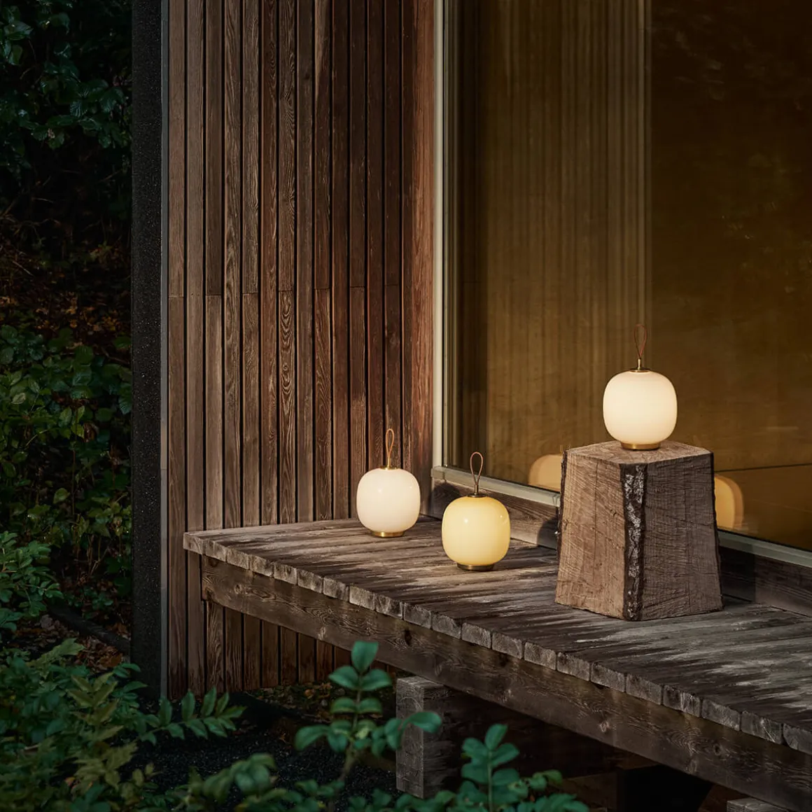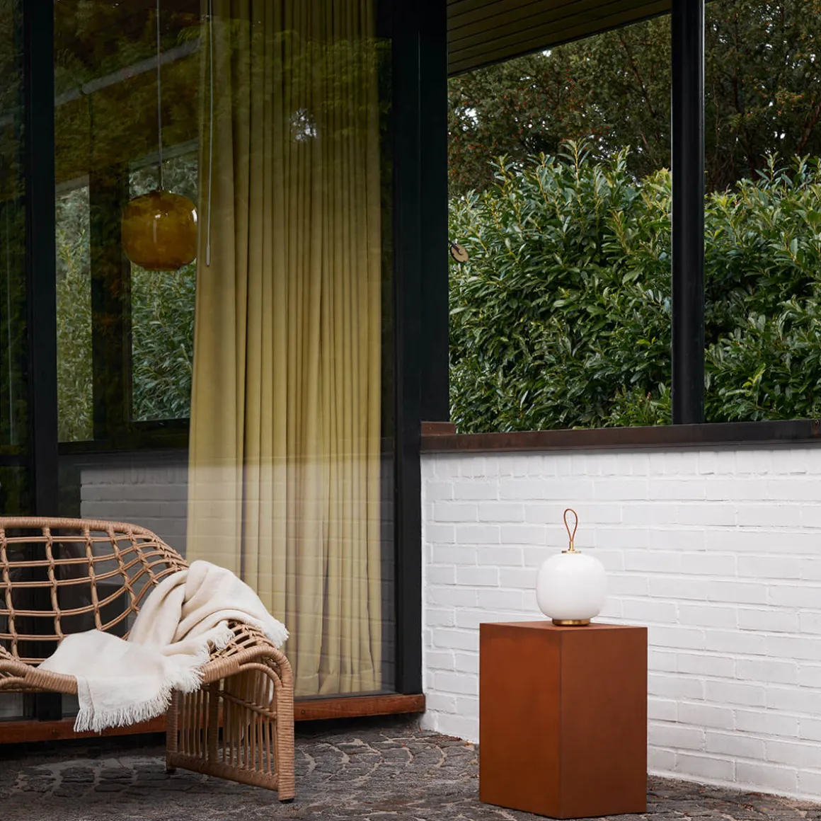 Gefertigt aus mundgeblasenem, mehrschichtigem Glas mit glänzend-weißer Innenseite, sorgt die Tisch-Akkuleuchte für eine diffuse, 360-Grad-Beleuchtung. Elemente aus Messing, die von feinen Haarlinien geprägt und zum Schutz vor Patinierung lackiert sind, verleihen der VL 45 Radiohus Portable einen edlen Charakter. Ihr kompaktes Design und das spritzwassergeschützte Gehäuse ermöglichen den Einsatz sowohl drinnen als auch draußen.