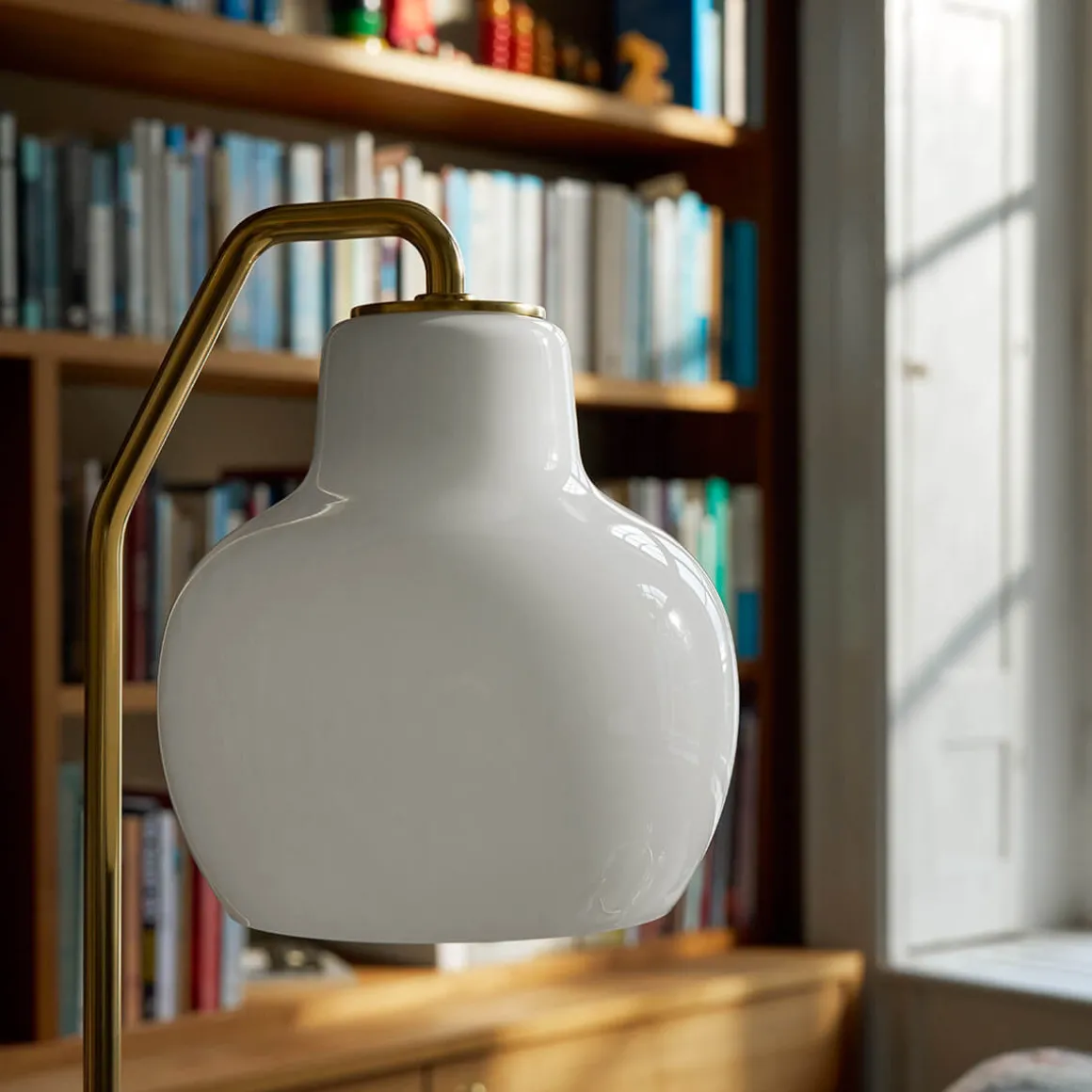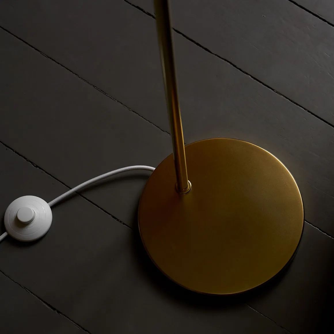 Ihr Schirm besteht aus mundgeblasenem, dreischichtigem Opalglas, das für eine gleichmäßige, weiche Lichtausstrahlung sorgt und zugleich ein warmes, blendfreies Raumlicht schafft. Der Schirm sitzt auf einem schlanken Gestell aus unbehandeltem Messing mit feiner Satinierung, dessen natürlicher Glanz durch die Jahre hinweg eine individuelle Patina entwickelt. Diese Patina verleiht jeder einen unverwechselbaren Charakter und lässt sich bei Bedarf durch Polieren entfernen. So entsteht ein lebendiges, wandelbares Materialbild, das Tradition und Moderne perfekt vereint.