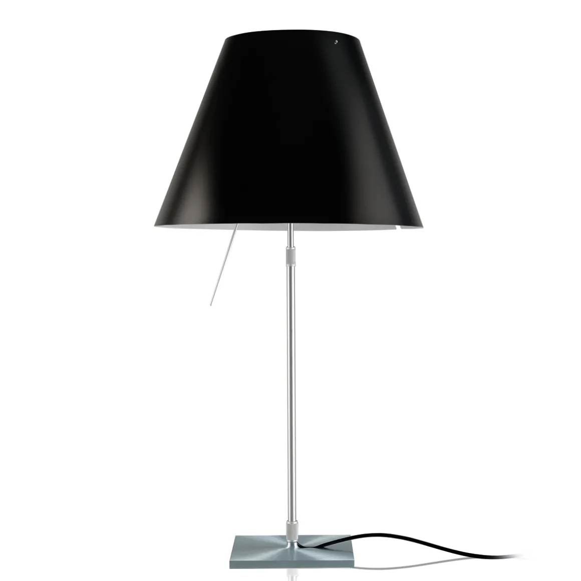 Kennzeichnendes Element der Luceplan Costanza Leuchtenserie ist der konisch geformte Schirm aus siebbedrucktem Polycarbonat. Er ist auswechselbar, von geringem Gewicht und einfach zu reinigen. Getragen wird er von lediglich zwei Haltepunkten, sodass er, wenn er angestoßen wird, sanft hin- und herschaukelt, um sich auszubalancieren. Der Fuß der Costanza Tavolo Tischleuchte ist aus Aluminium gefertigt.
