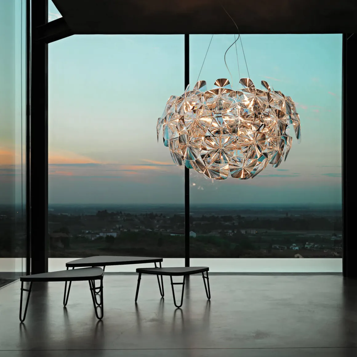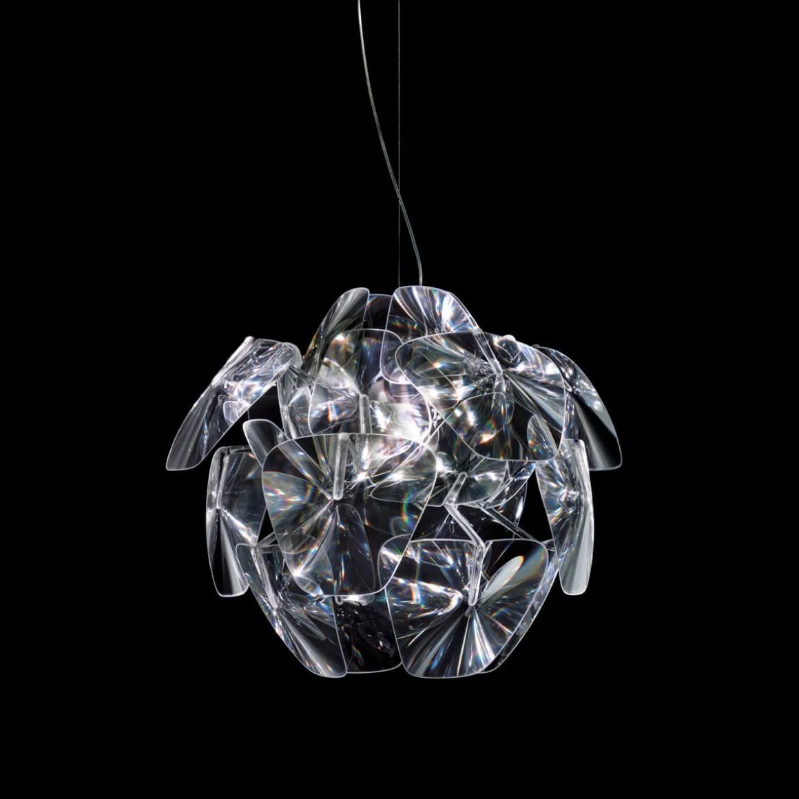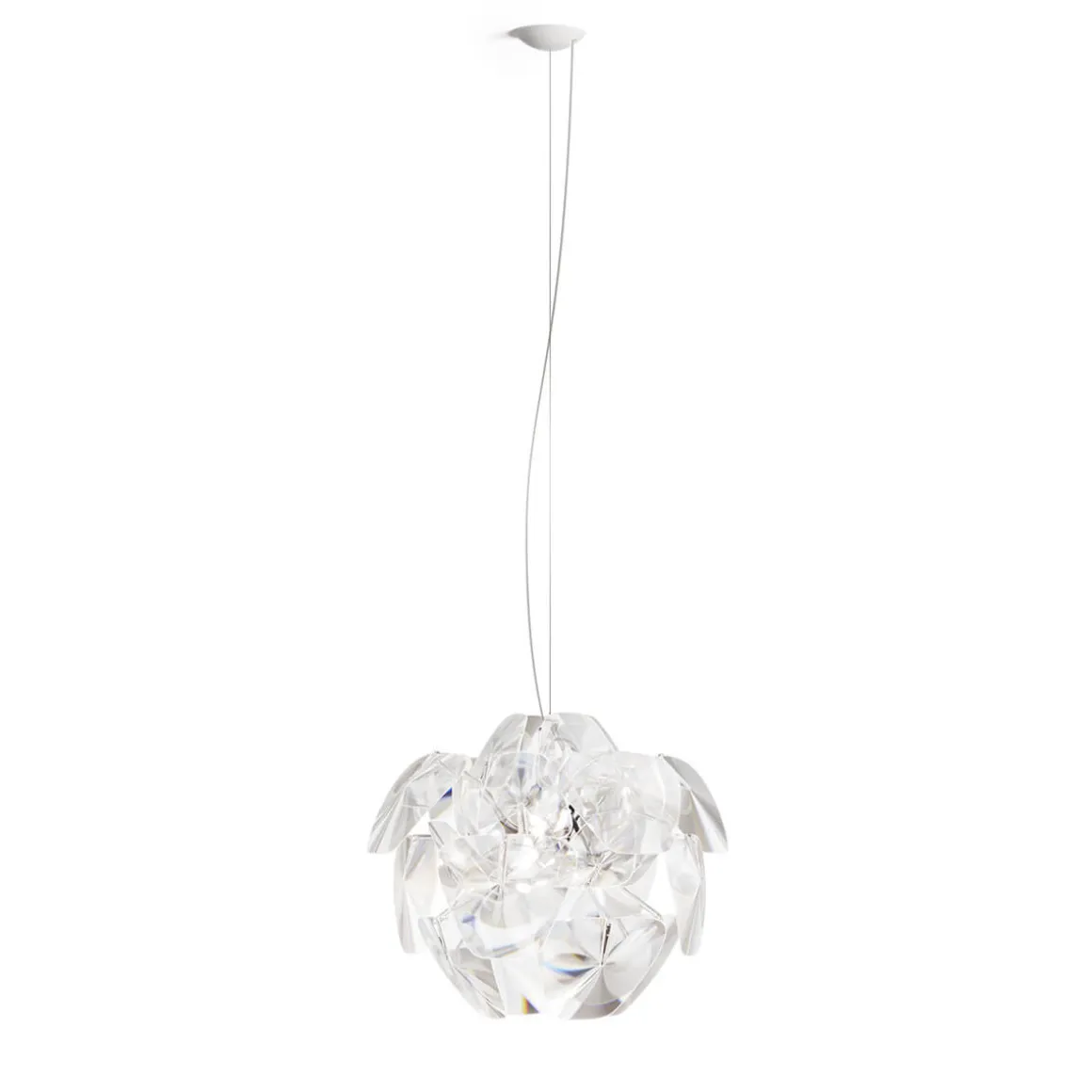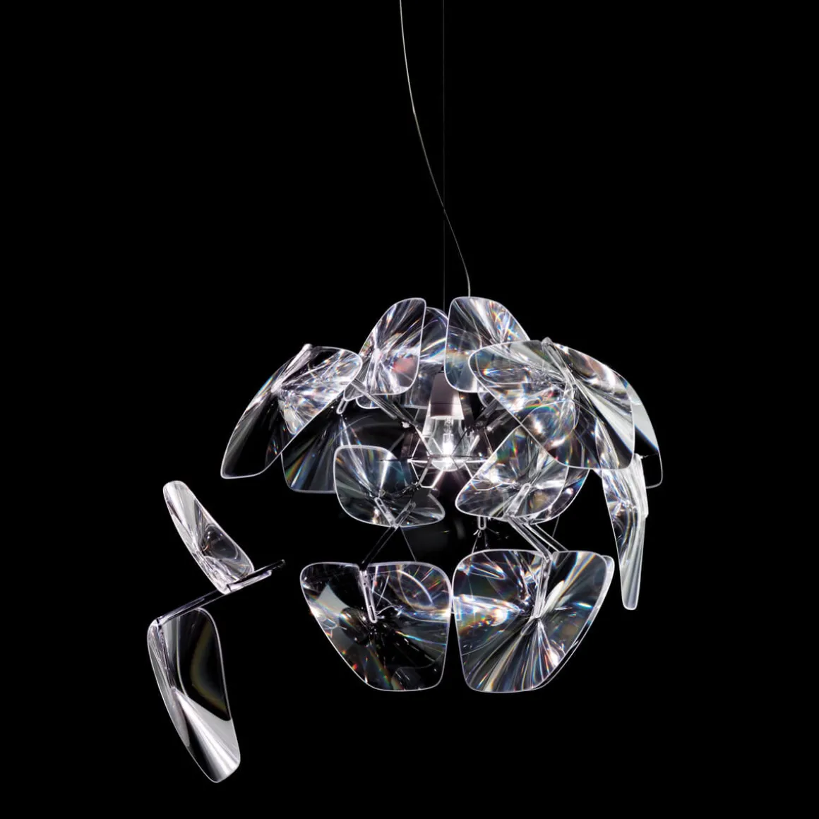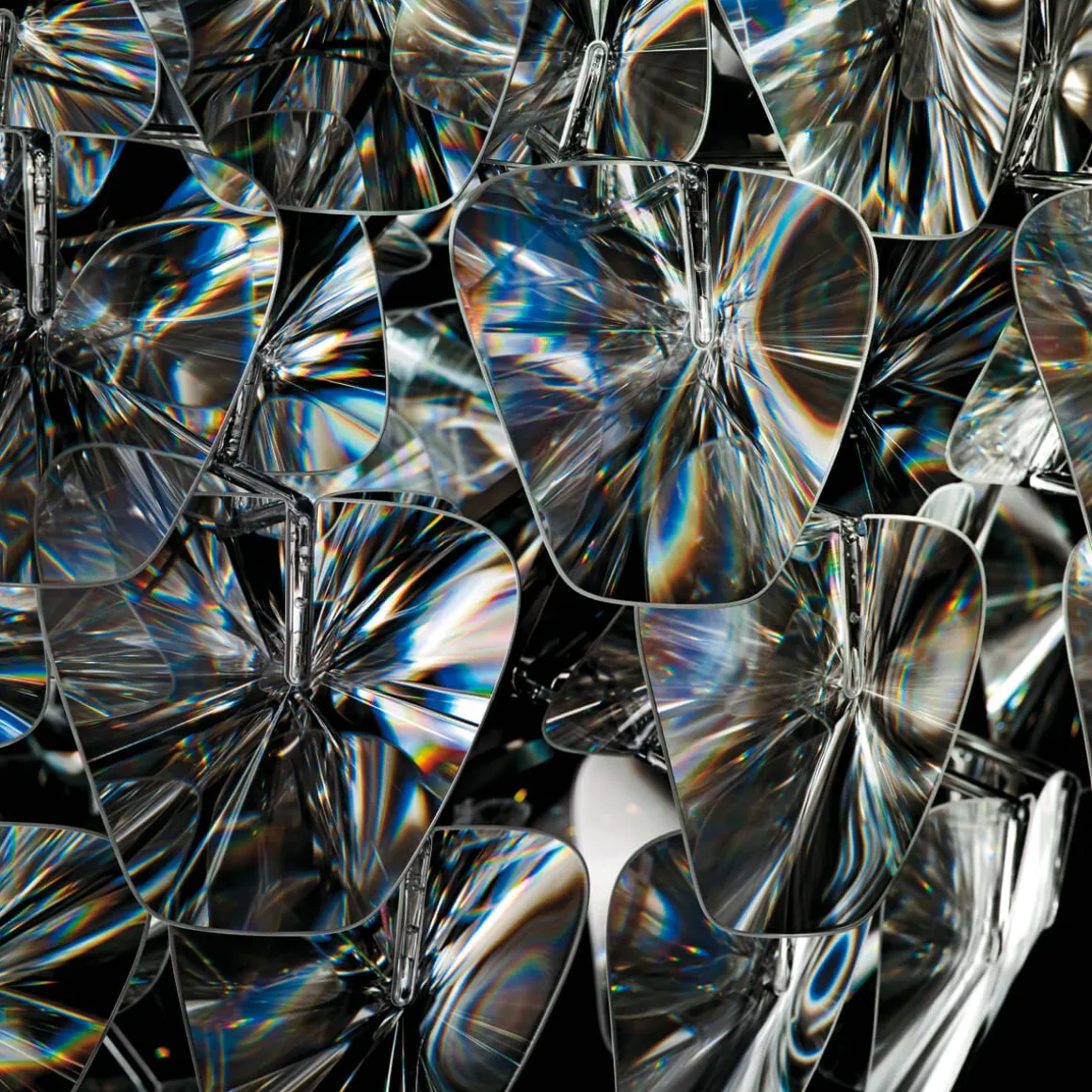 Ihre glanzvolle Erscheinung verdanken sie den extrem dünnen Fresnel-Linsen aus Polycarbonat, die die wie schützende Blätter umgeben und das ausstrahlende Licht vielfältig brechen. Die hierdurch entstehenden Lichtreflexe erzeugen eine prunkvolle, gläzende und festliche Atmosphäre. Sie lassen die Hope Sospensione funkeln und glitzern, wie es auch ihr Namensgeber, der berühmte Hope-Diamant, tut.