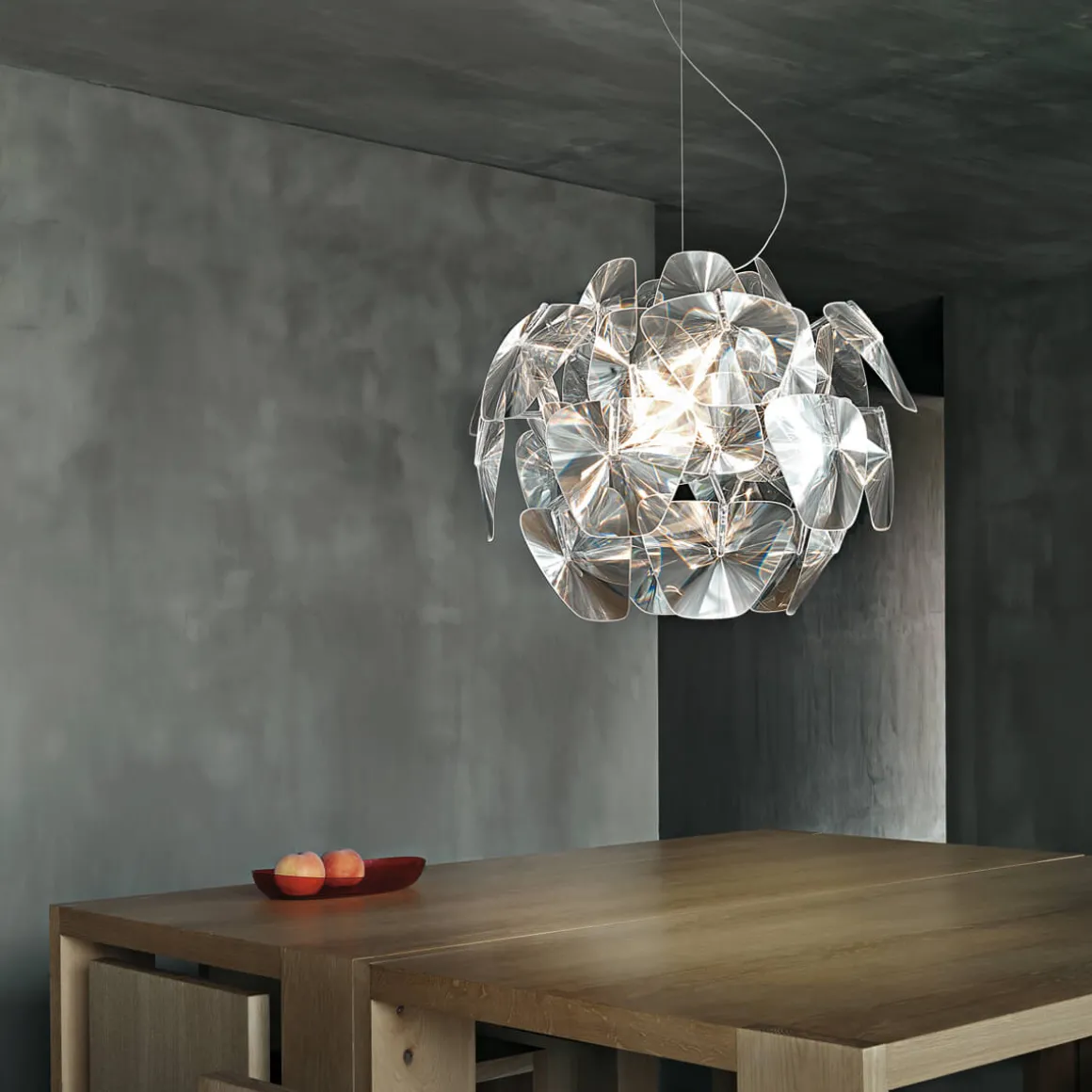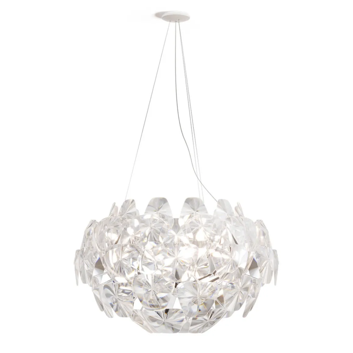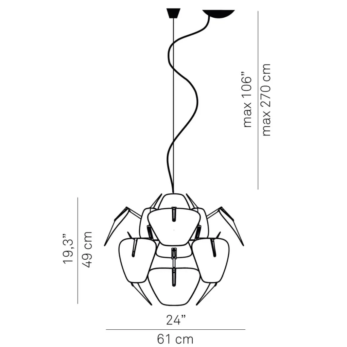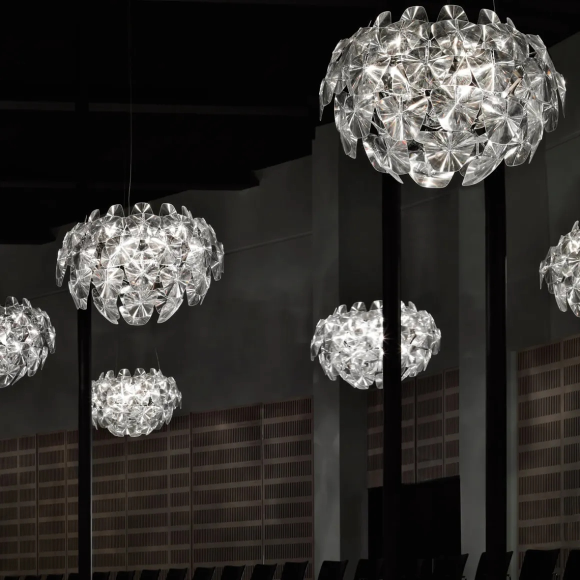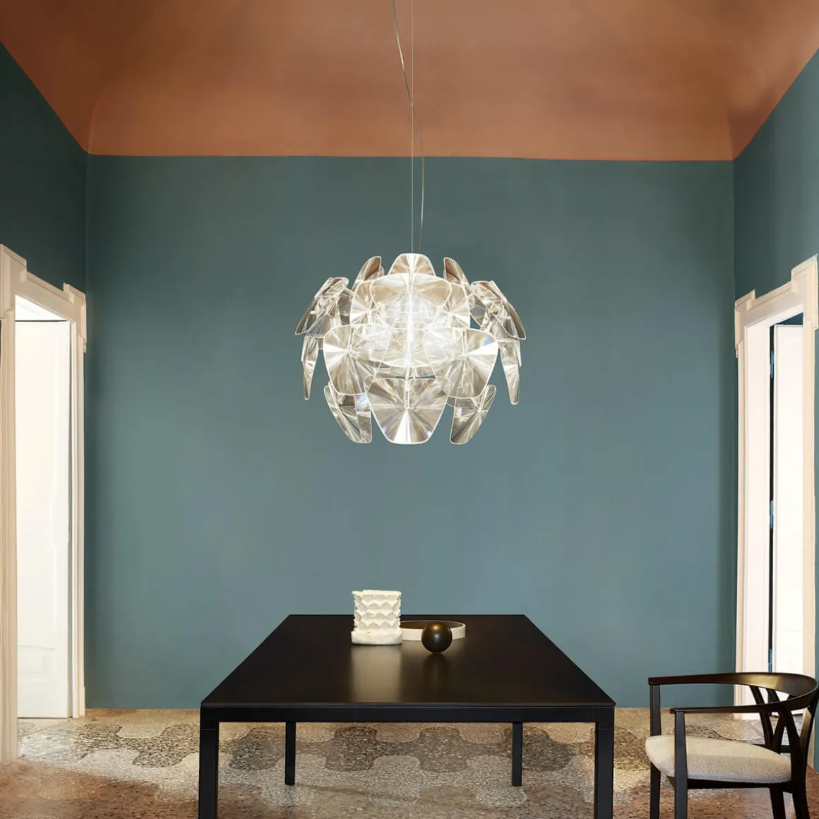 Ihre glanzvolle Erscheinung verdanken sie den extrem dünnen Fresnel-Linsen aus Polycarbonat, die die wie schützende Blätter umgeben und das ausstrahlende Licht vielfältig brechen. Die hierdurch entstehenden Lichtreflexe erzeugen eine prunkvolle, gläzende und festliche Atmosphäre. Sie lassen die Hope Sospensione funkeln und glitzern, wie es auch ihr Namensgeber, der berühmte Hope-Diamant, tut.