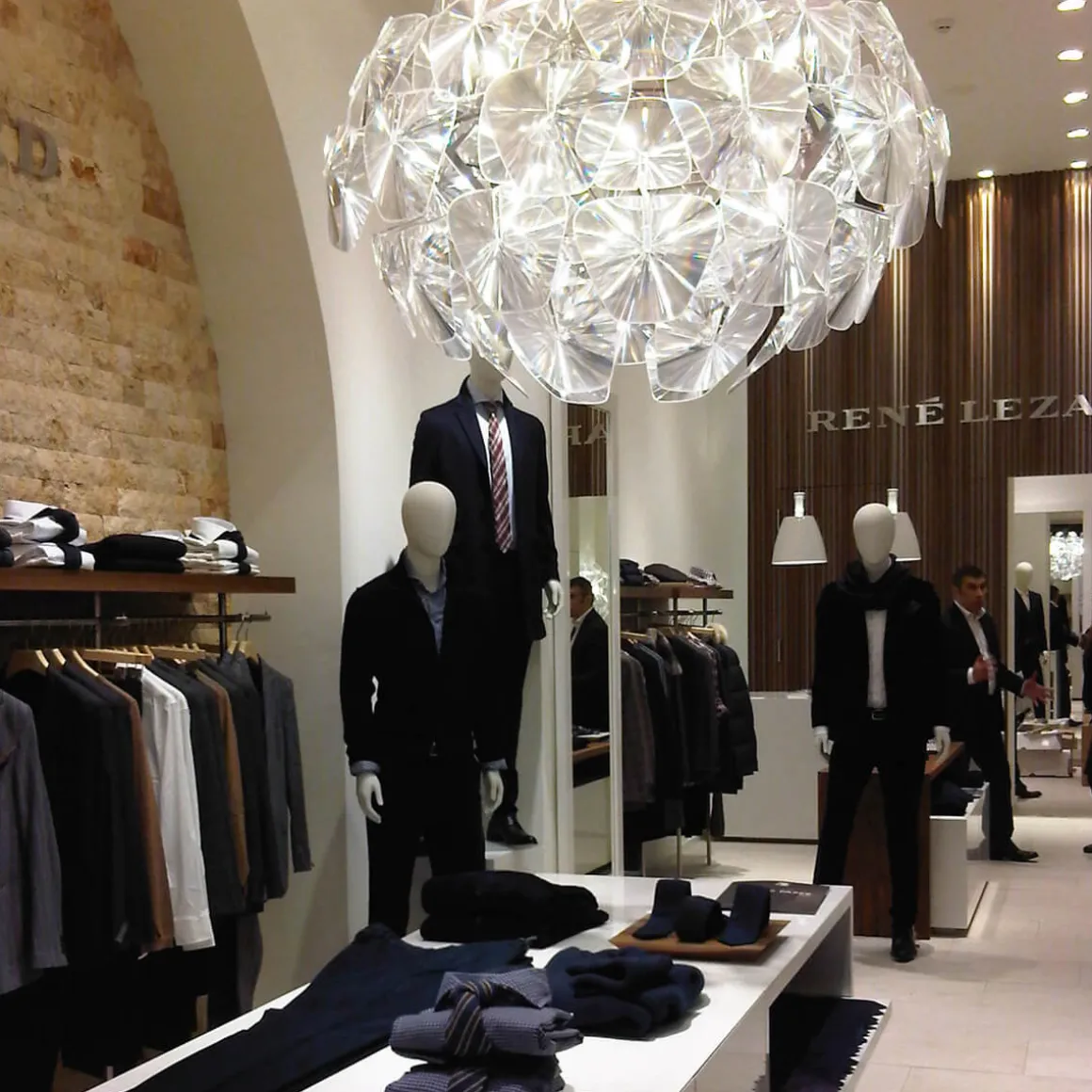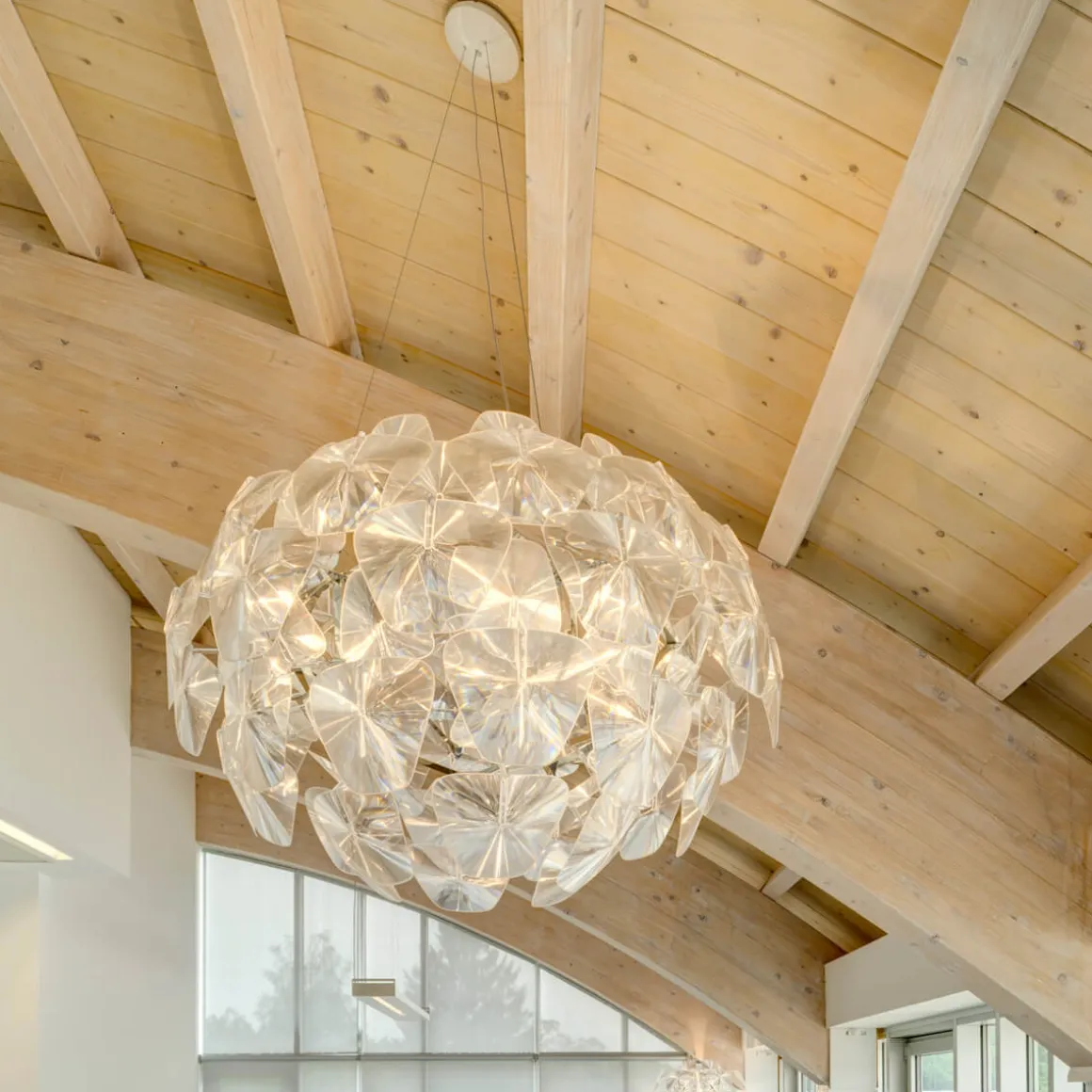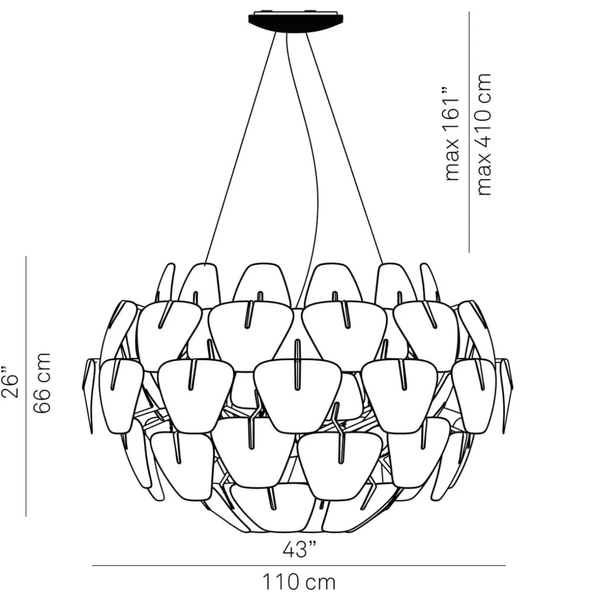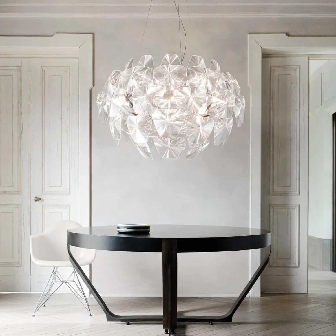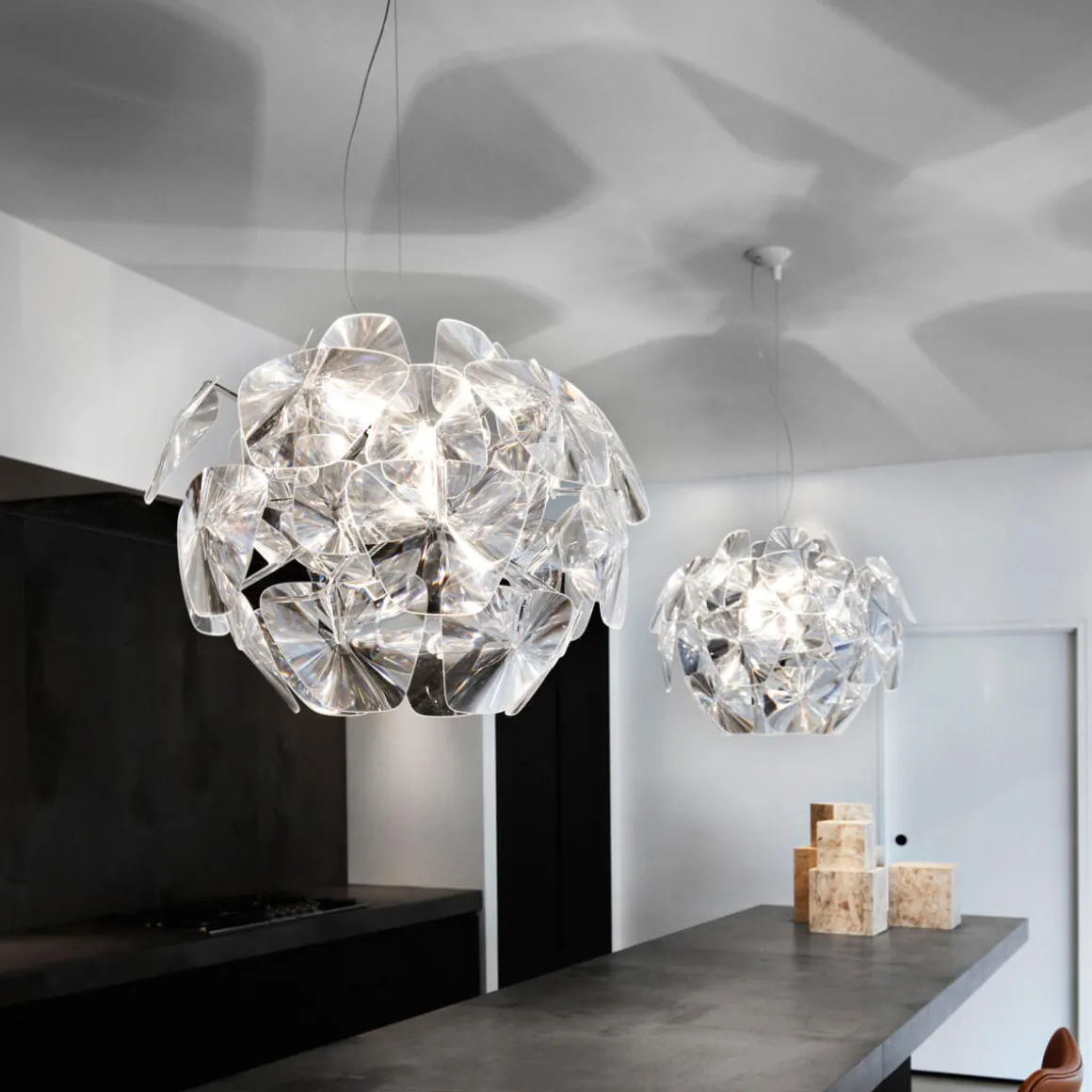 Ihre glanzvolle Erscheinung verdanken sie den extrem dünnen Fresnel-Linsen aus Polycarbonat, die die wie schützende Blätter umgeben und das ausstrahlende Licht vielfältig brechen. Die hierdurch entstehenden Lichtreflexe erzeugen eine prunkvolle, gläzende und festliche Atmosphäre. Sie lassen die Hope Sospensione funkeln und glitzern, wie es auch ihr Namensgeber, der berühmte Hope-Diamant, tut.
