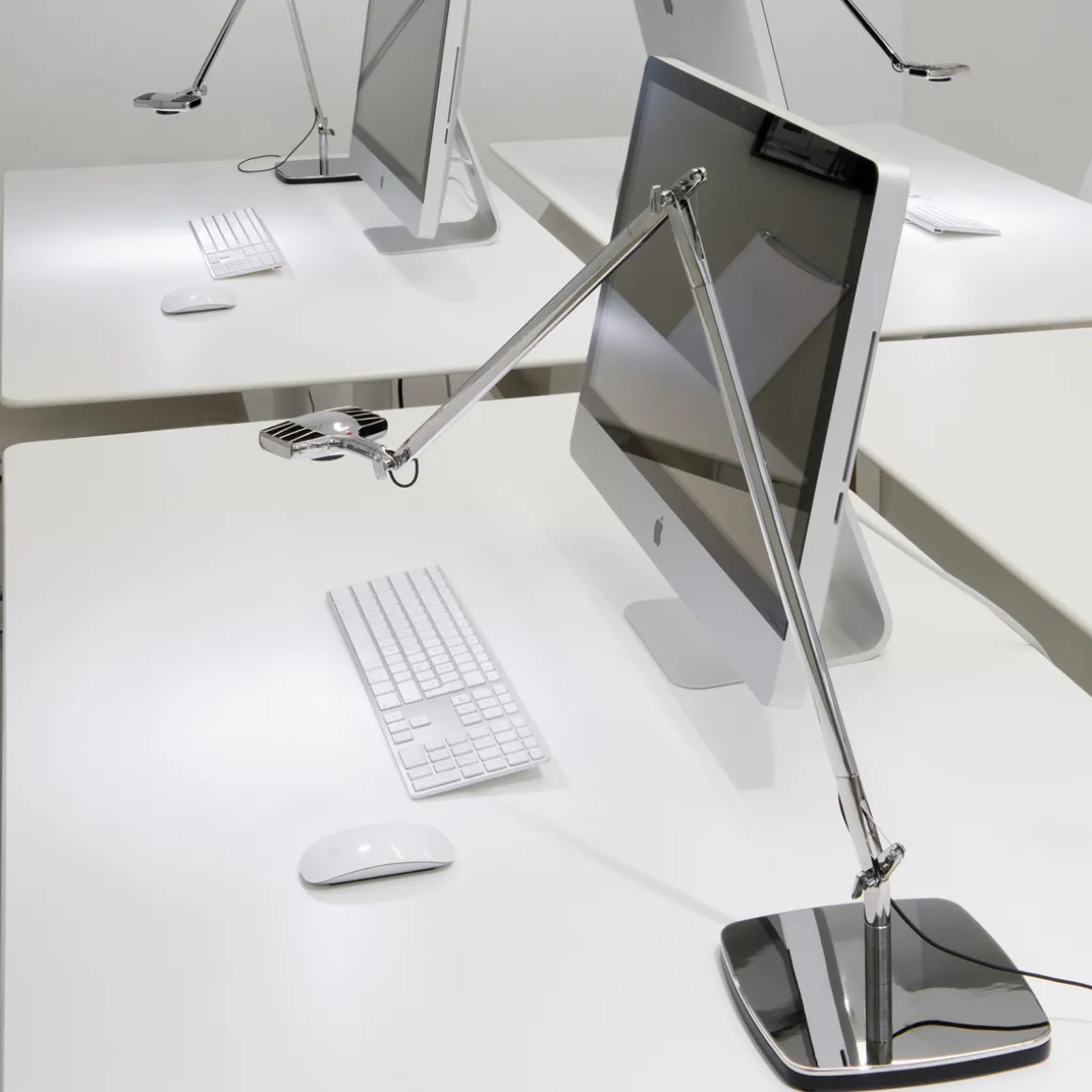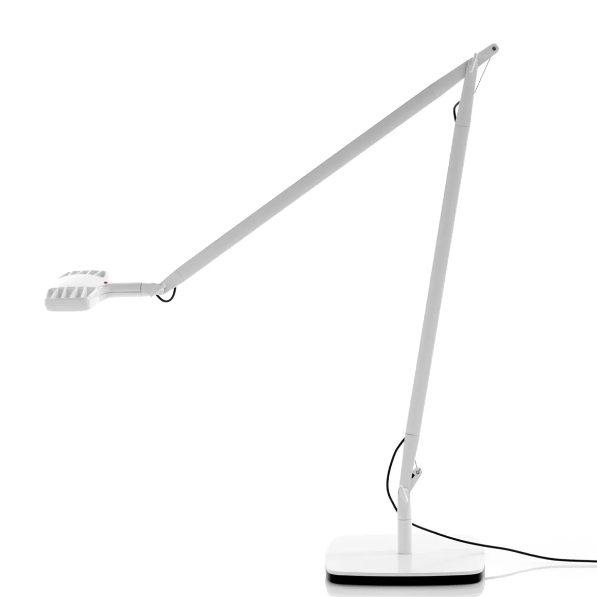 Tischfuß, Reflektor und Leuchtenarme der Luceplan Otto Watt Tavolo Tischleuchte sind aus Aluminium gefertigt und in weißer Lackierung, poliertem Aluminium oder schwarzer Tönung mit weicher Haptik zu erwerben.