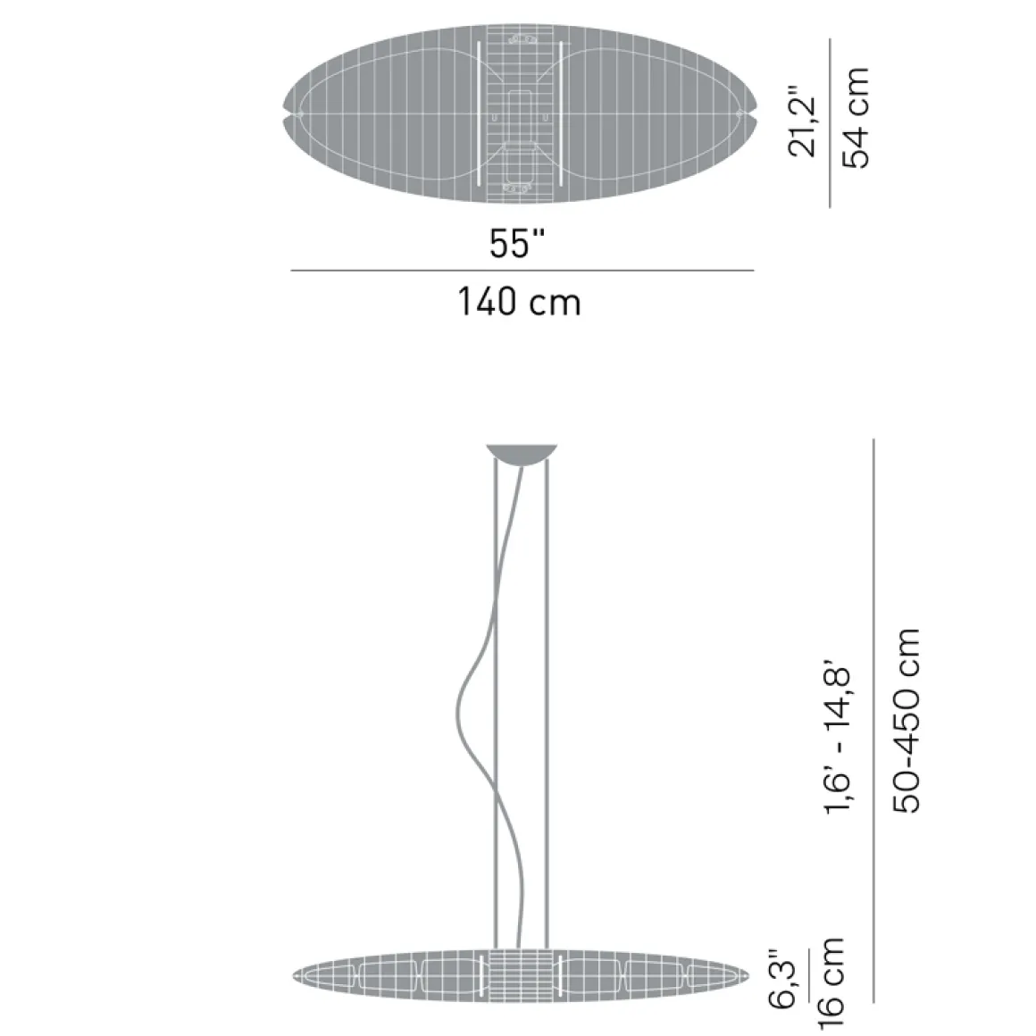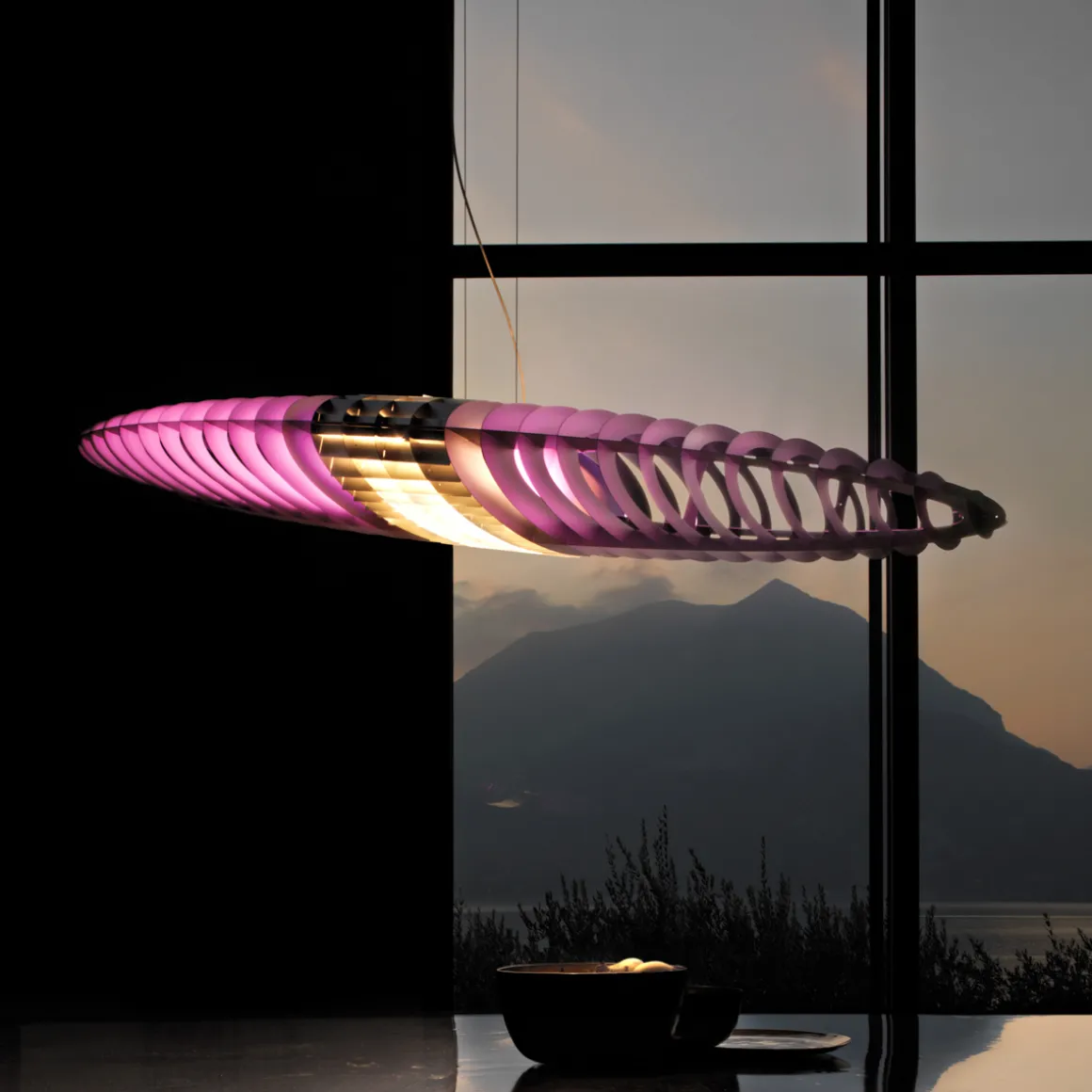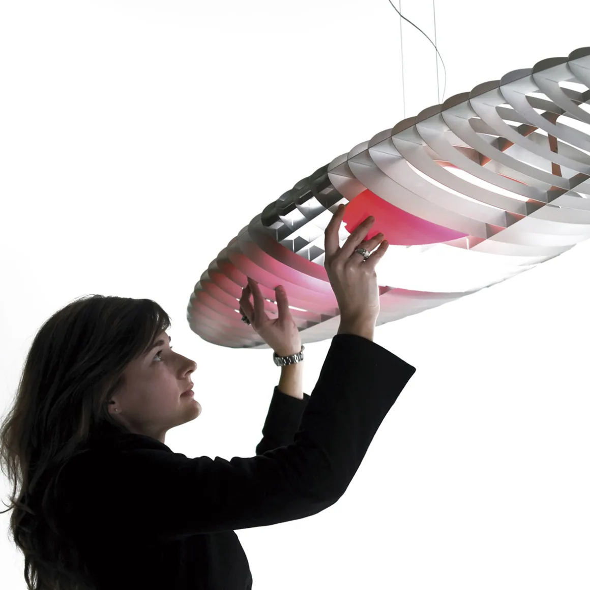Hierbei ergeben die Aluminiumlamellen, aus denen der organisch geschwungene Leuchtenkörper besteht, ein wechselndes visuelles Erscheinungsbild – je nachdem, von welchem Winkel aus man die Queen Titania Sospensione betrachtet: Nahezu transparent erscheint die Hängeleuchte von der Front aus gesehen, als solider Körper hingegen, wird sie von der Seite betrachtet.