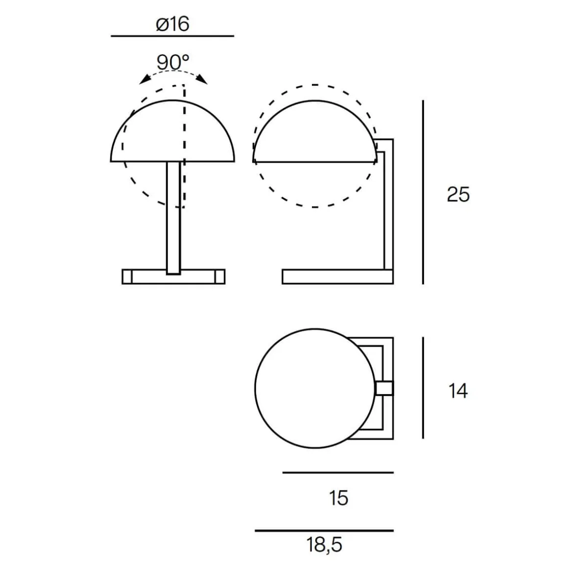 Die Tischlampe besteht aus Messing und verfügt über einen sphärischen Metallschirm, der auf einem viereckigen Sockel ruht. Der um 90° verstellbare Schirm erlaubt eine flexible Lichtausrichtung – ideal zur punktuellen Beleuchtung der Arbeitsfläche, zur stimmungsvollen Akzentuierung im Wohnbereich oder zum seitlichen Aufhellen einer Wandnische.