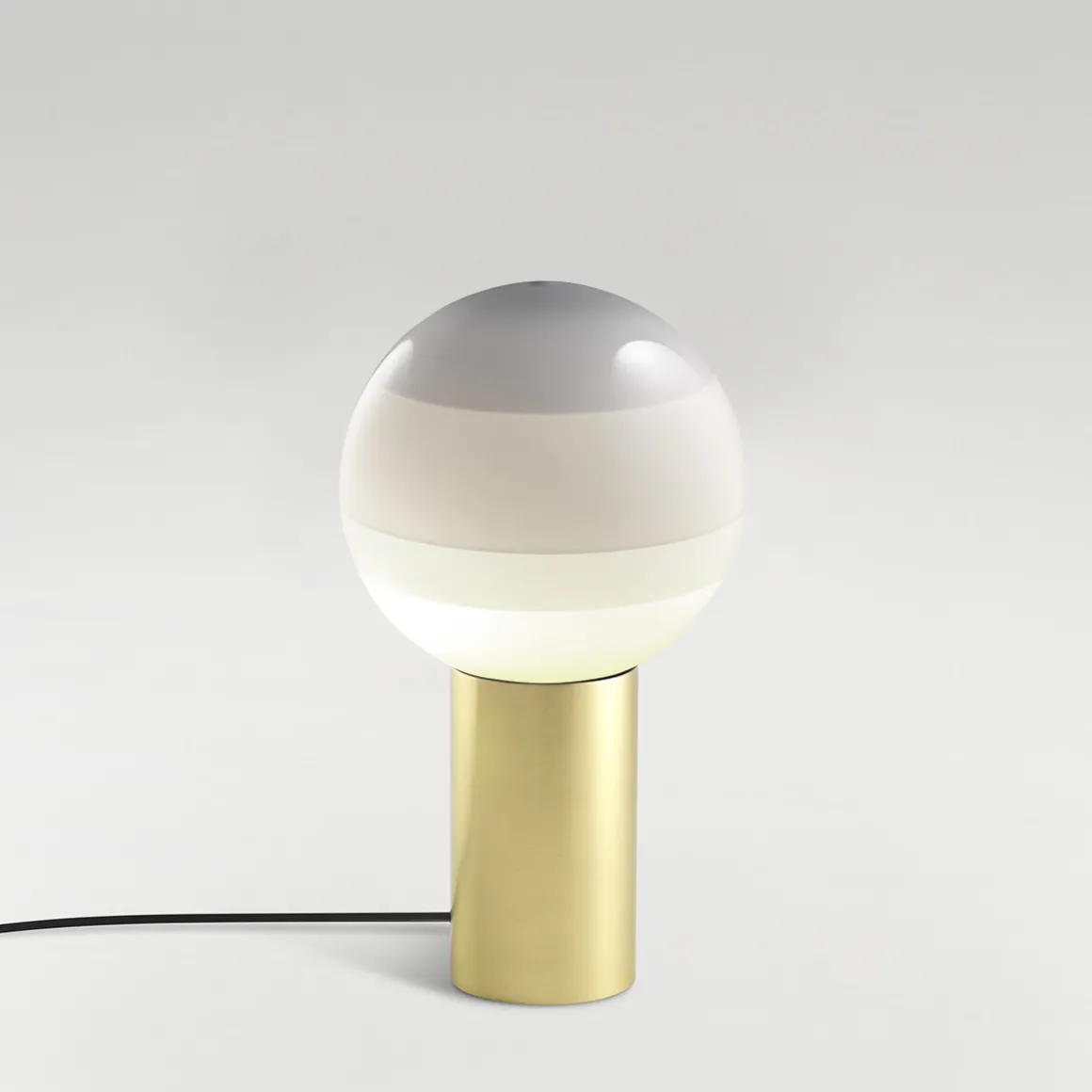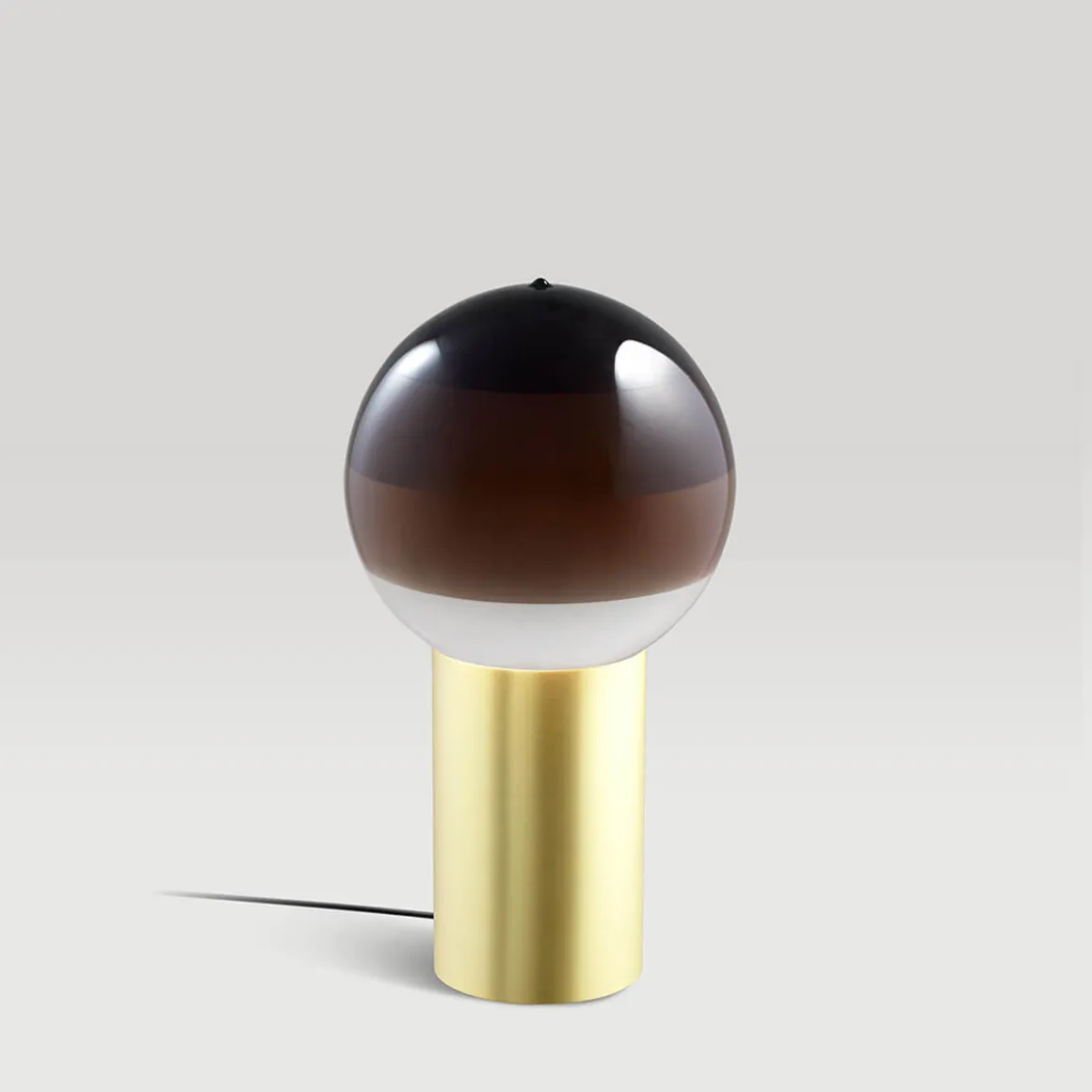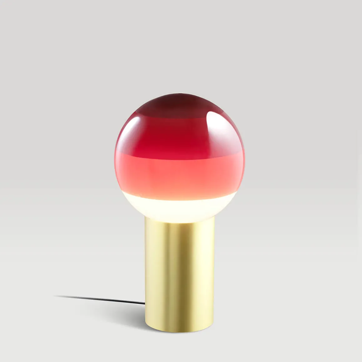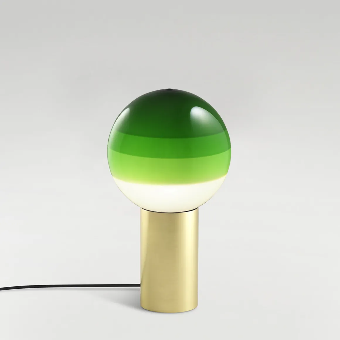 Indem die Glaskugel unterschiedlich tief in das Farbbecken eingetaucht wird, entsteht der für die Marset Dipping Light charakteristische Farbverlauf: die konzentrischen Kreise unterschiedlicher Farbtiefe, die das Licht auf magische Weise einfangen und filtern. Getragen wird der Schirm von einem zylinderförmigen Sockel aus gebürstetem Messing. Der Schnurschalter ist ebenso wie das Leuchtenkabel schwarz gehalten.
