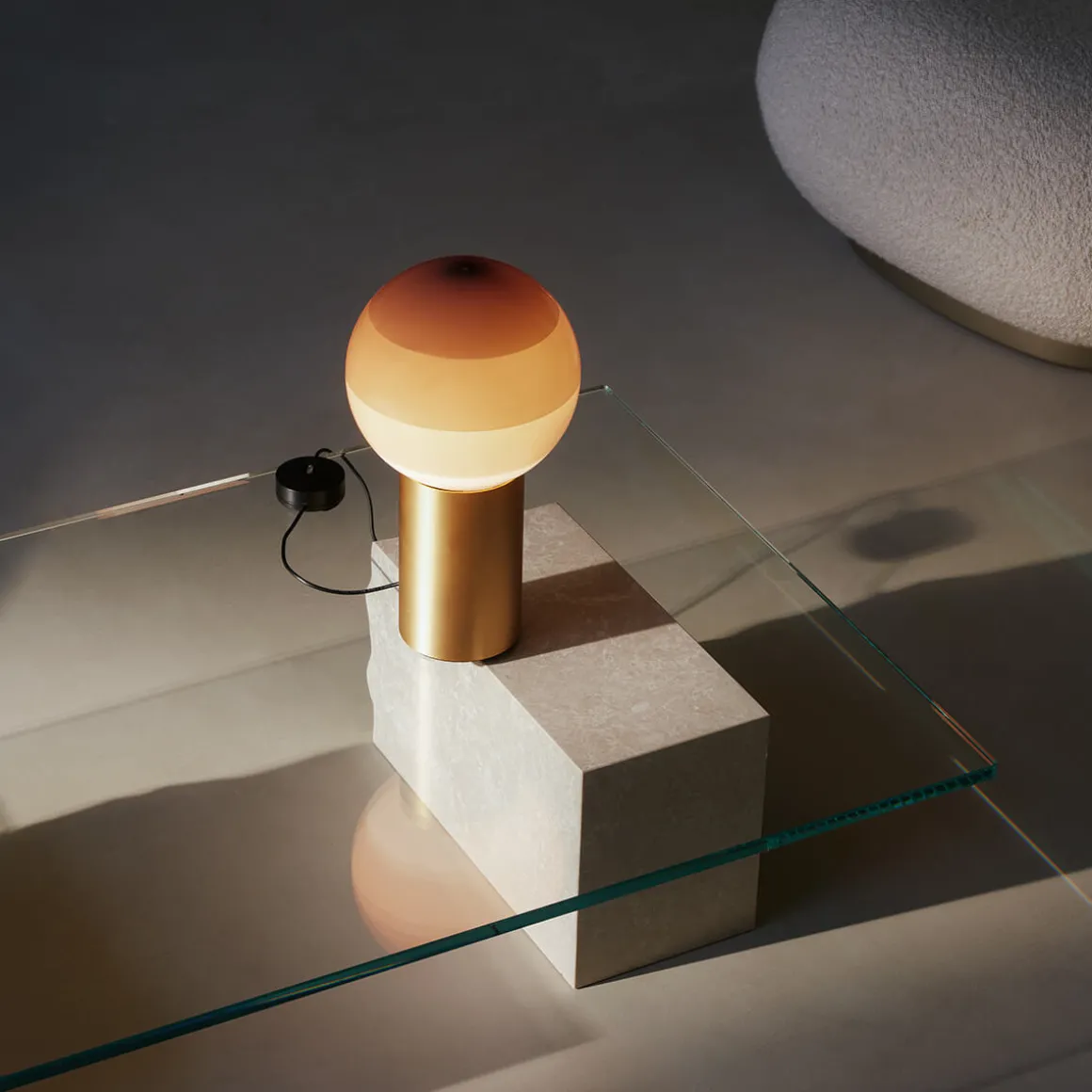 Das Highlight der ist ihr kugelförmiger Schirm aus geblasenem Glas, der von mehreren Farbaufträgen überzogen ist – Ergebnis einer aufwendigen Eintauchtechnik. Jede Kugel wird mehrfach in Farbe getaucht, wodurch konzentrische Kreise mit unterschiedlichen Tonalitäten entstehen. Hieraus ergibt sich eine harmonische Lichtstreuung, die sanfte Nuancen im Raum erzeugt und für eine außergewöhnliche Lichtstimmung sorgt. Der Schirm ruht auf einem eleganten Sockel aus gebürstetem Messing, der einen stilvollen Kontrast zu den farbigen Gläsern bildet.