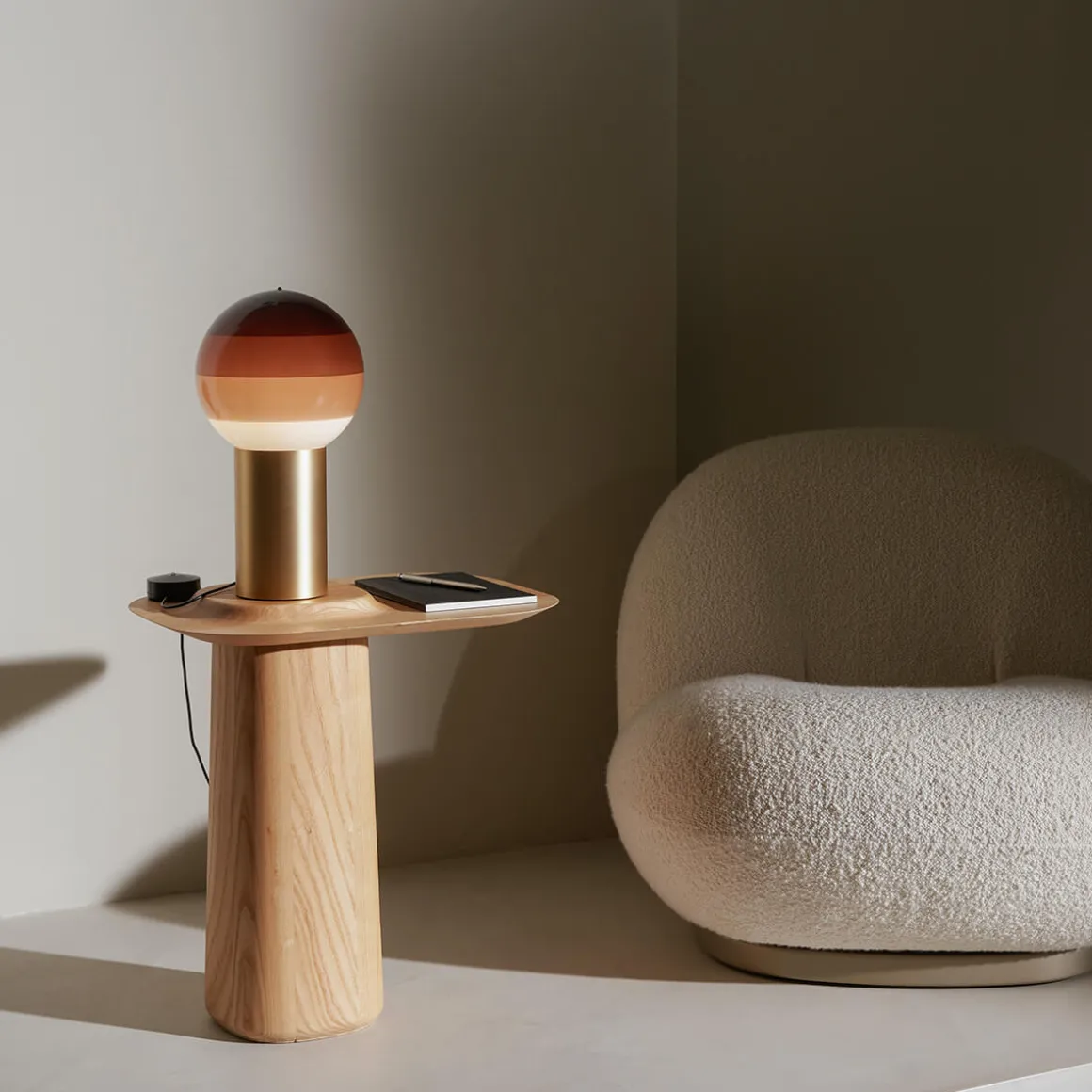 Erhältlich ist die Dipping Light S LED Tischleuchte in sechs faszinierenden Farbtönen. Bernstein und Grün erinnern an die warme Farbpalette der 1970er-Jahre und strahlen eine lebendige Retro-Ästhetik aus. Creme und Bordeaux verleihen der eine edle, softe Lichtwirkung und fügen sich harmonisch in elegante Wohnkonzepte ein. Für eine minimalistische, zeitlose Gestaltung bietet sich die Version in abgetöntem Weiß an, die einen schönen Kontrast zum Messingfuß bildet.