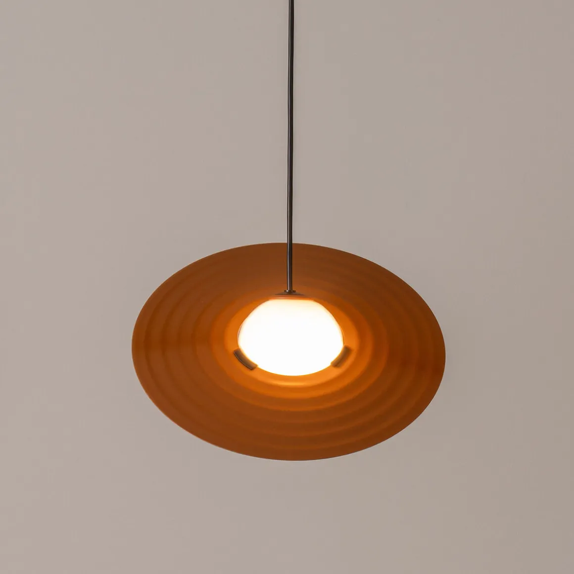 | Material/Oberfläche: | Glänzendes opales geblasenes Glas mit eingespritztem Polycarbonat, Schirm aus Aluminium, farbig lackiert, Stahl |