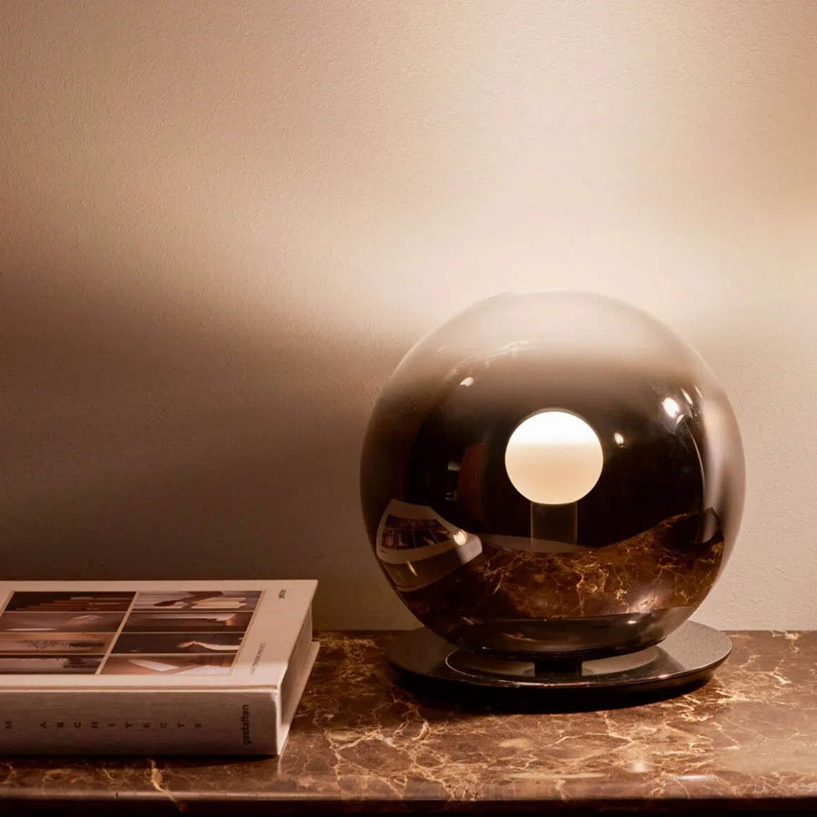Die bodenverspiegelte Glaskugel in Kombination mit dem Occhio fireball erzeugt eine weiche, indirekte Lichtausstrahlung: Das Licht der Occhio Luna basso Tischleuchte erstrahlt gerichtet nach oben hin und wird zugleich von umgebenden Flächen wie der Zimmerwand reflektiert. Das Ergebnis ist eine faszinierende Lichtatmosphäre, die sowohl im Wohnzimmer, Flur als auch Schlafbereich magische Momente voller Eleganz kreiert.