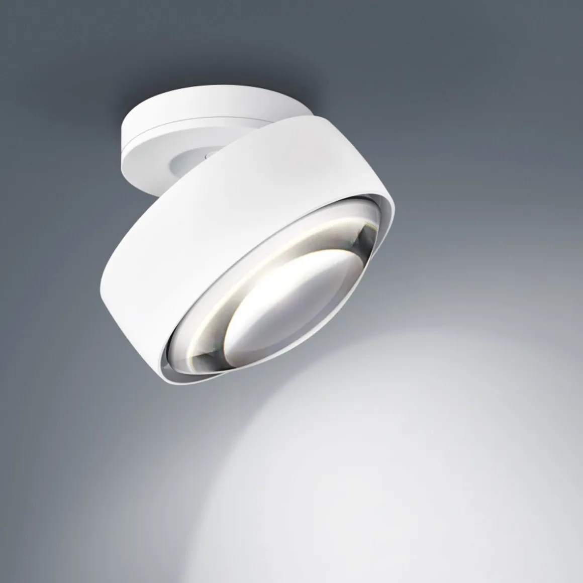 - Moderner Deckenstrahler mit Linse für ein gerichtetes Licht mit klar konturiertem Lichtkegel (Ausstrahlungswinkel ca. 80°)