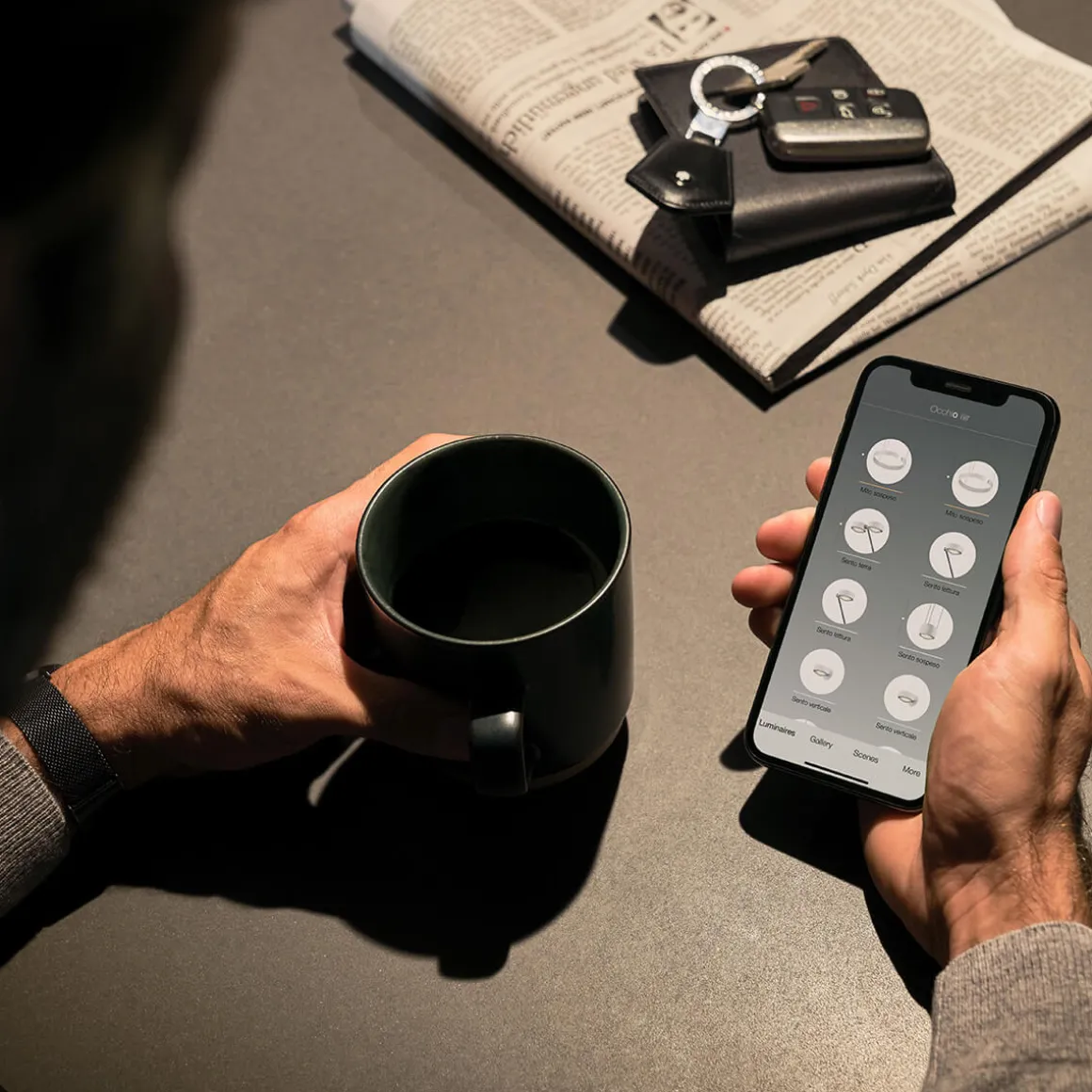 Die Steuerung der revolutioniert das Lichterlebnis: Ausgestattet mit dem smart-home-fähigen Occhio air Modul, lässt sich die Wandlampe über die kostenfreie Occhio air App schalten und dimmen – bequem vom Smartphone oder Tablet aus. Auch die Erstellung von Lichtszenen und das innovative Feature „up/down fading“, bei dem das ausstrahlende Licht stufenlos von einer auf die andere Seite gezogen wird, lassen sich via Occhio air realisieren. Das Ergebnis ist eine individuelle Beleuchtung für jeden Anlass. Alternativ kann das Produkt über die integrierte Gestensteuerung (touchless control) oder extern via Phasenabschnittdimmer gesteuert werden.