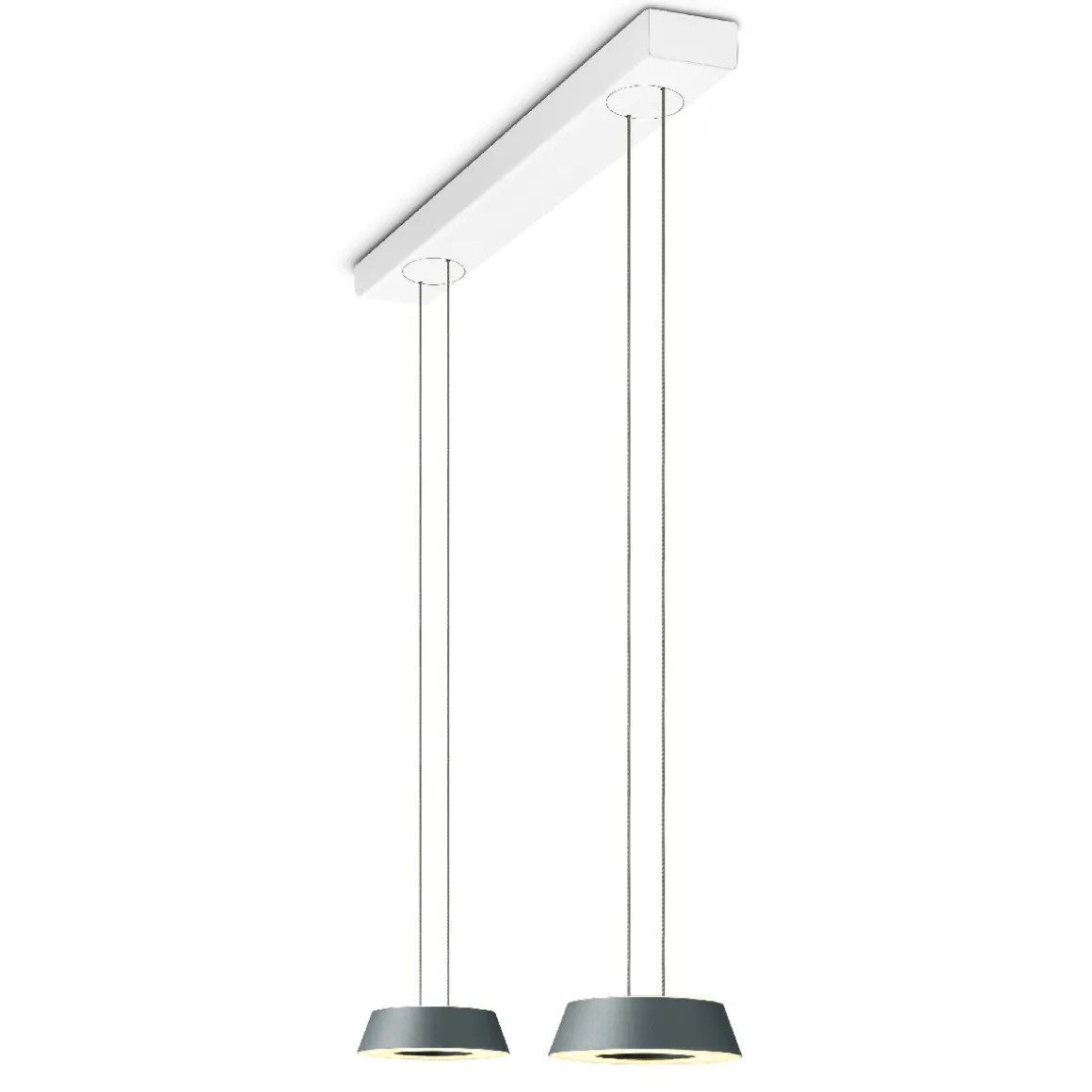 Die unsichtbar höhenverstellbare Glance LED Pendelleuchte ist mit einem mattweißen Baldachin ausgestattet. Auf Anfrage ist auch ein Baldachin mit Abdeckungen in Chrom oder Aluminium gebürstet erhältlich (die schmalen Stirnseiten sind hierbei immer Weiß matt ausgeführt).
