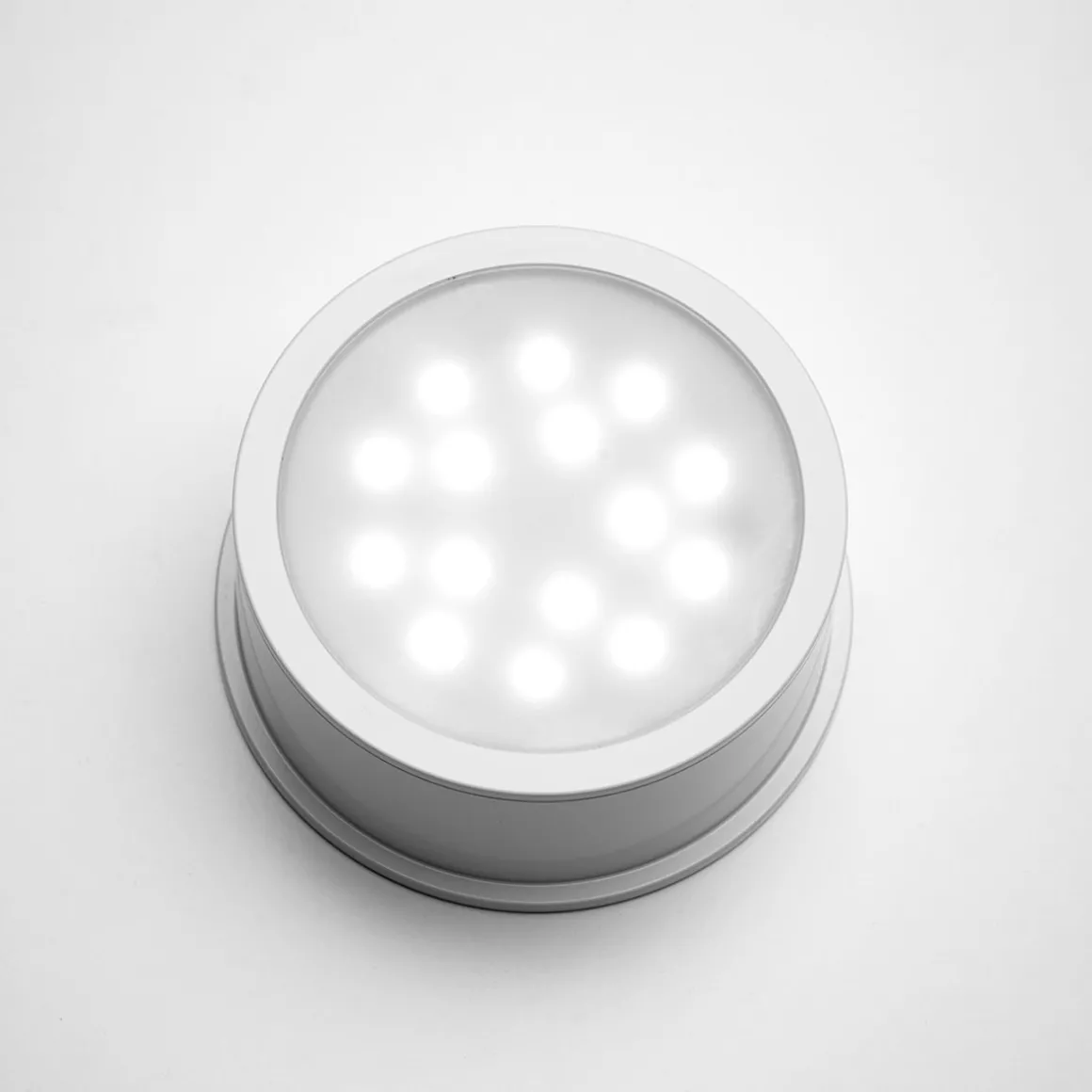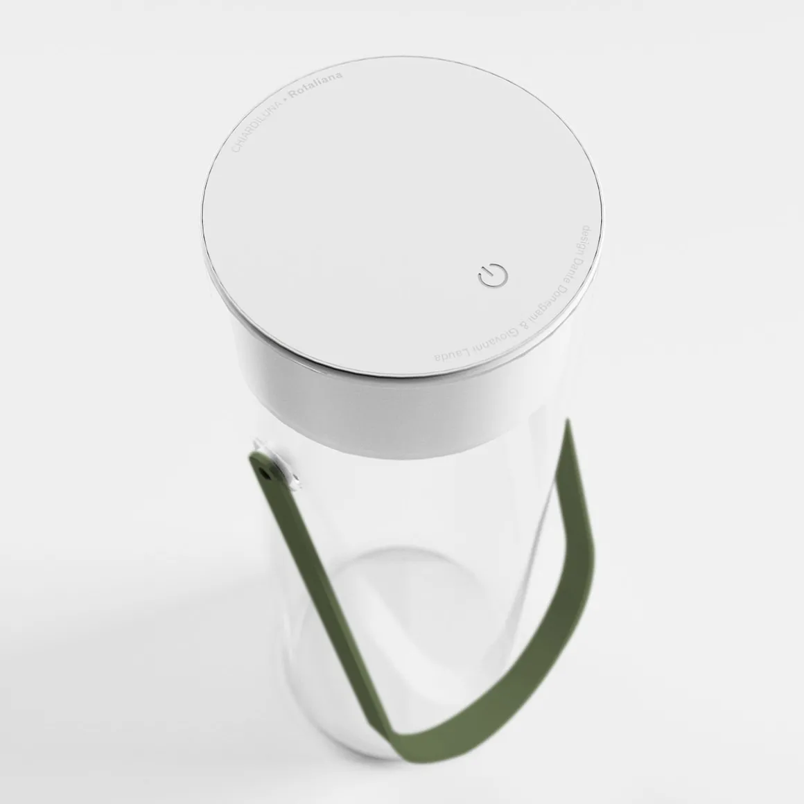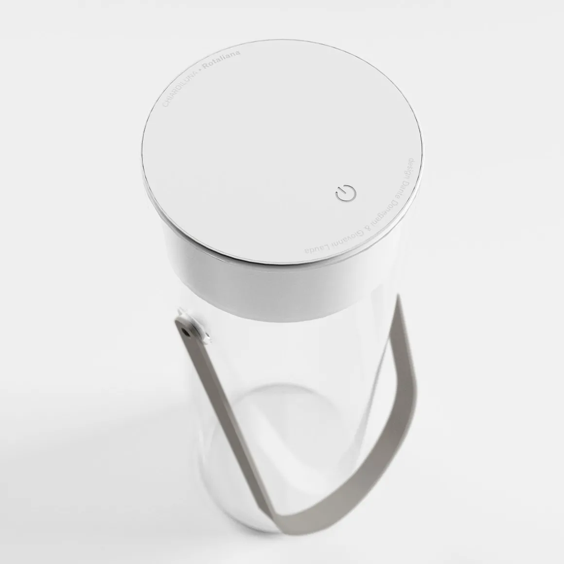 Verschlossen wird der aus geblasenem Borosilikatglas gefertigte Schirm von einem weißen Deckel, einer Art „Stöpsel“. Der Stöpsel ist das technologische Herz der Rotaliana Chiardiluna LED. Er birgt das LED-, die wiederaufladbare Batterie und den Touchdimmer, der sich an der Oberseite des Deckels befindet und eine Einstellung der Lichtstärke in drei Schritten erlaubt (von 40 % über 70 % bis 100 %).