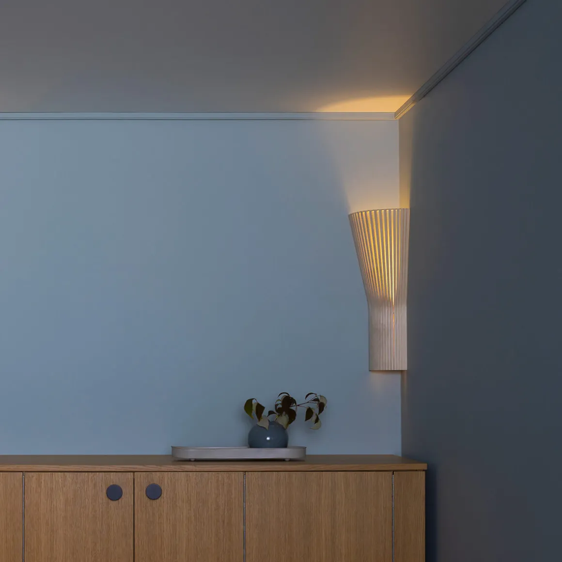 Die Secto Small 4237 Wandleuchte von Secto Design ist eine hervorragende Lösung, um Raumecken mit warmer Brillanz zu erhellen. Die handgefertigte , die sich mit ihrem viertelkreisförmigen Querschnitt perfekt in jede Zimmerecke schmiegt, besteht aus PEFC-zertifizierter, formgepresster Birke. Mit ihrem besonderen Design bietet sie nicht nur eine funktionale Beleuchtung, sondern auch einen Hauch von Natur für Ihr Interieur – egal, ob im Wohnzimmer, Schlafzimmer oder Korridor.