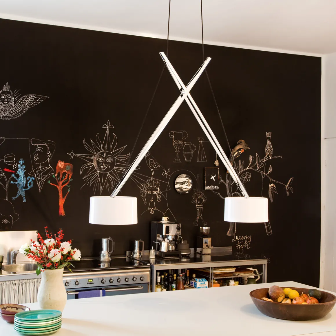 Die intelligente Alternative zur herkömmlichen : Die Twin LED Suspension schafft einen eleganten Spagat zwischen verschiedenen Lichtbedürfnissen. Ihr Leuchtenkörper funktioniert nach dem Scherengitterprinzip und kann je nach Bedarf in seinem Wirkungsradius verändert werden.