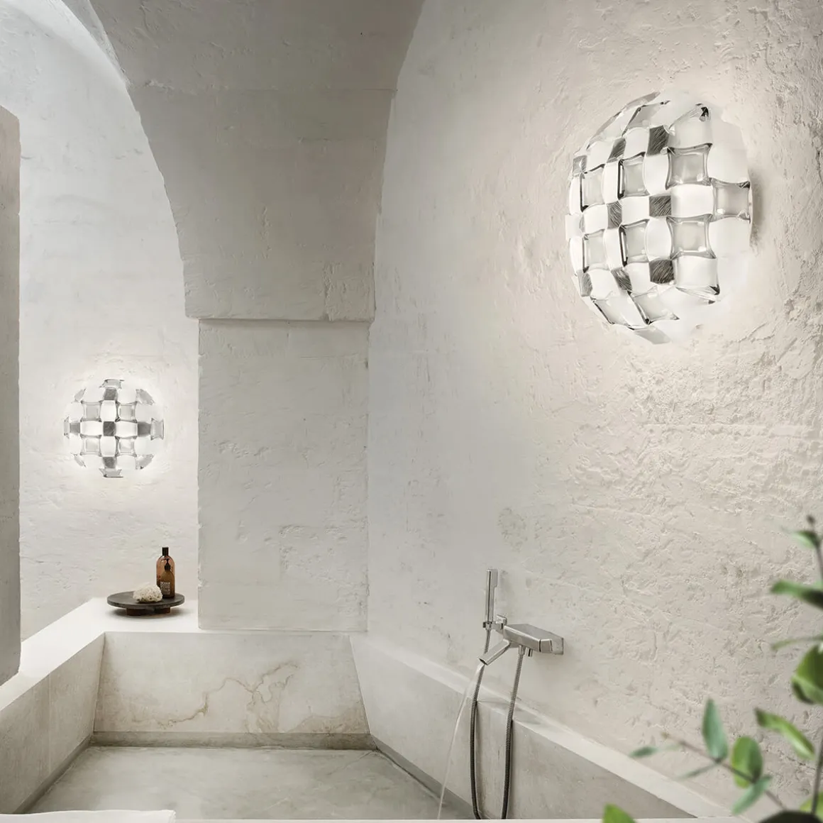 Durch ihre Größe eignet sich die Mida Ceiling / Wall Large besonders gut für öffentliche Innenräume wie Hotellobbys und Lounges, aber auch für großzügige Wohnräume und Flure. Die spendet ein indirektes und diffuses Licht, das durch einen Pavé aus „Edelsteinen“ aus Slamps patentierten Kunststoffen Lentiflex® und Opalflex® erzeugt wird. Diese Materialien brechen das Licht in einer Weise, die seine Umgebung sanft und einladend erleuchtet und gleichzeitig funkelnde Akzente setzt.