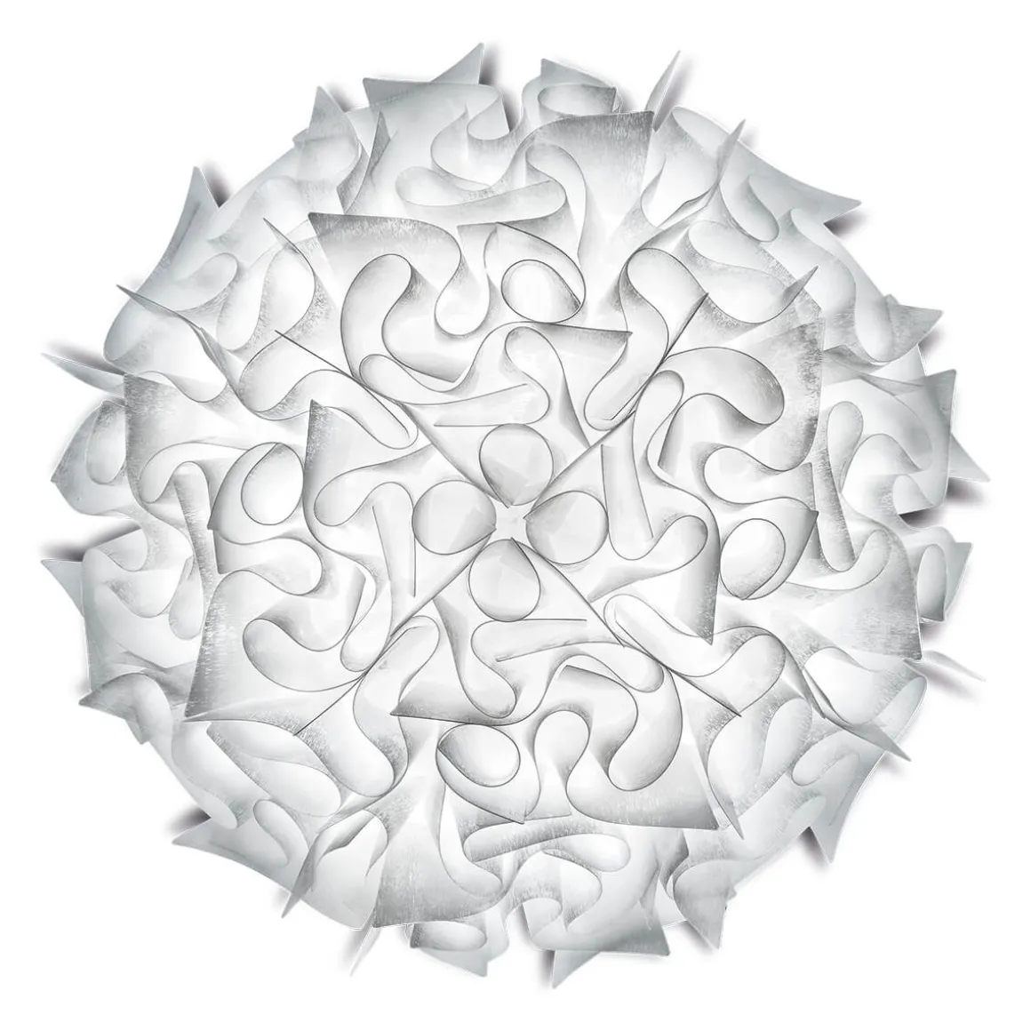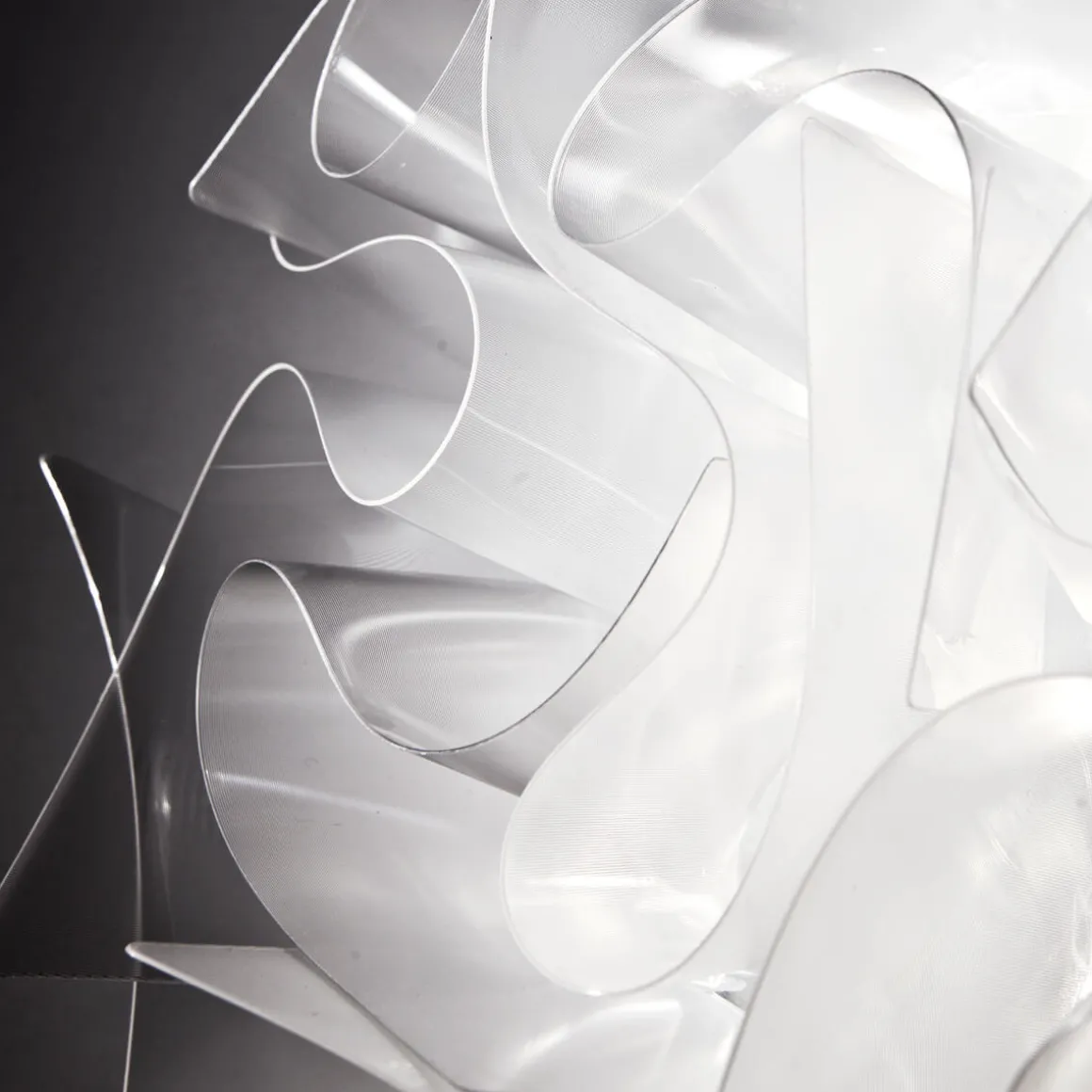 Der Lampenschirm besteht aus farbig gefasstem oder metallisiertem Kunststoff, der von Hand in Italien zusammengesetzt wird. Der verwendete Kunststoff ist widerstandsfähig, hochwertig und leicht zu reinigen. Je nach Materialveredelung entsteht ein unterschiedliches Lichtbild: Während opalisierendes Opalflex® ein weiches Licht erzeugt und der Veli durch farbige Ränder eine besondere Ästhetik verleiht, überzieht prismenhaft schillerndes Lentiflex® die mit irisierenden Lichtreflexen.