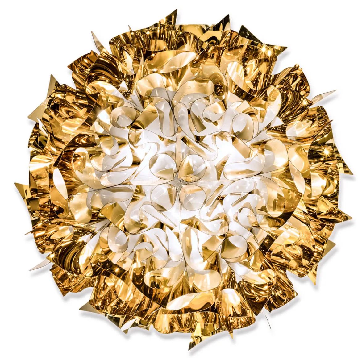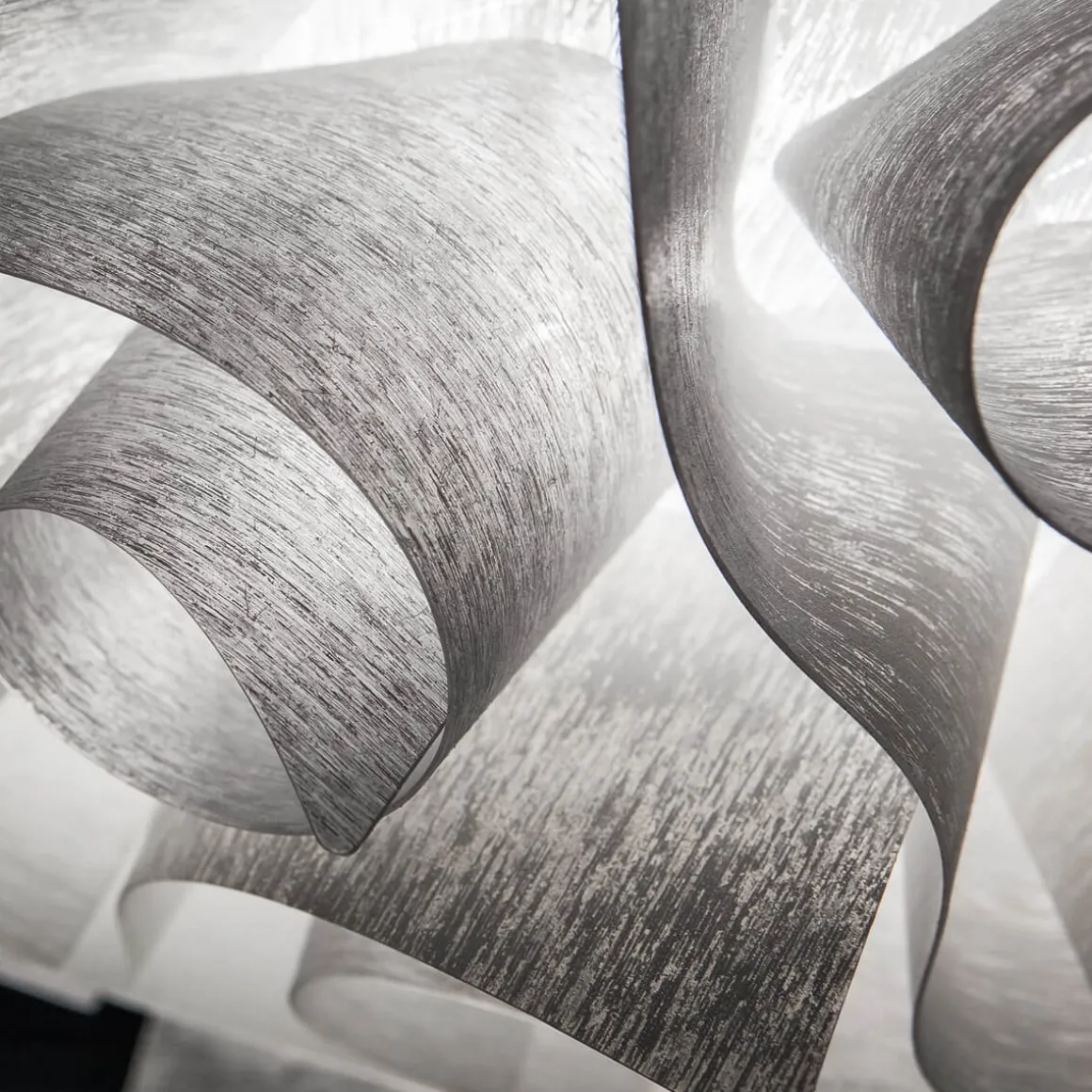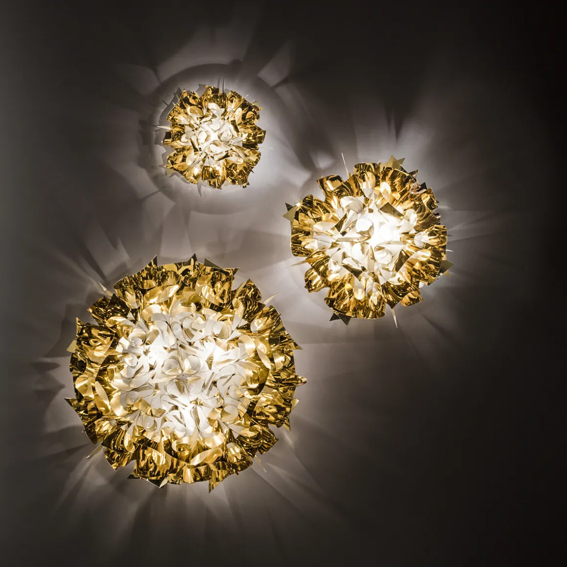 Besonders glamourös erscheint die Veli Ceiling / Wall Large von Slamp in den metallisierten Varianten aus Goldflex® und Copperflex®. Diese verleihen der Wand- und Deckenleuchte nicht nur eine luxuriöse, glanzvolle Note, sondern lassen auch vielfältige Spiegelungen entstehen. Die Couture-Version der Veli Large widerum betont mit ihrer von modernen Stoffstrukturen inspirierten Oberfläche die zeitgemäße und dekorative Ausstrahlung.